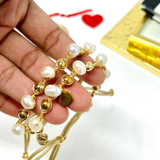 Freshwater Pearl And Hematite Beads Bracelet Set, Handmade Cord Adjustable Gold Bracelet