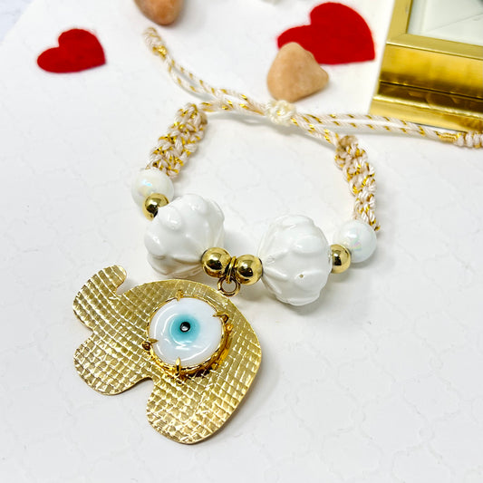 Gold plated elephant charm bracelet with ceramic and gold plated beads woven in macrame