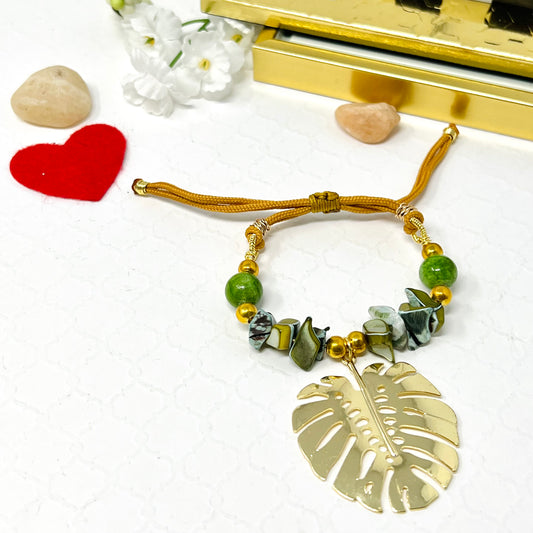 Gold Plated Monstera Leaf And Green Beads Bracelet