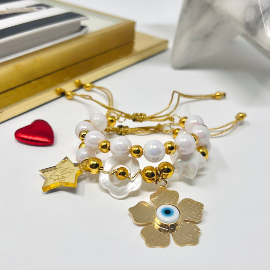 Handmade white beaded bracelet sets with flower evil eyes pendant, bracelet for women