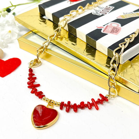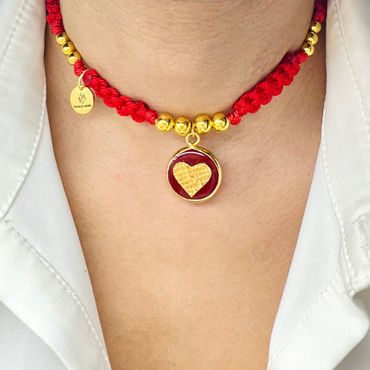 Braided and gold plated beads choker necklace in macrame and gold plated heart charm