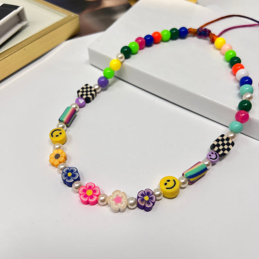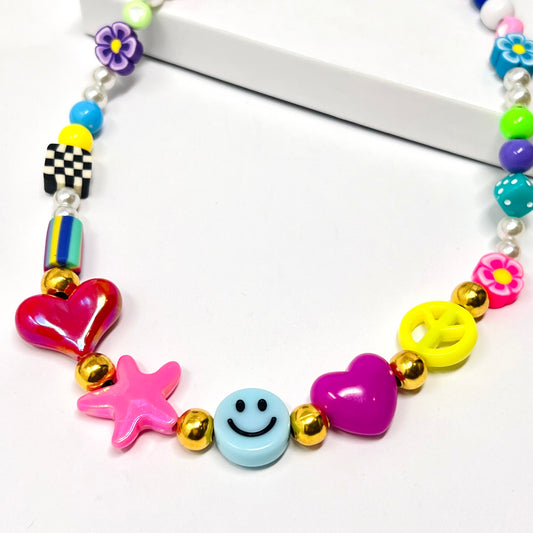 Colorful bead flower necklace, polymer clay pendant, happy face, chunky beaded necklace