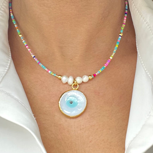 Beaded Necklace, Beaded Choker With Turquoise Pendant And Gold Plated
