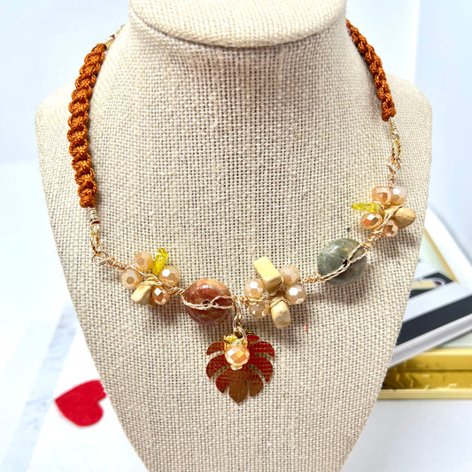 Braided Choker Necklace In Macrame, Wire And Gold Laminated Pendant And Natural Stones