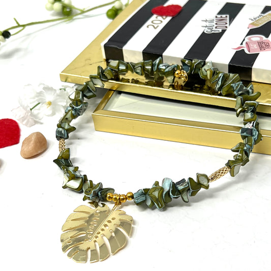 Green Chopped Beads Necklace And Gold Laminated Leaf Pendant