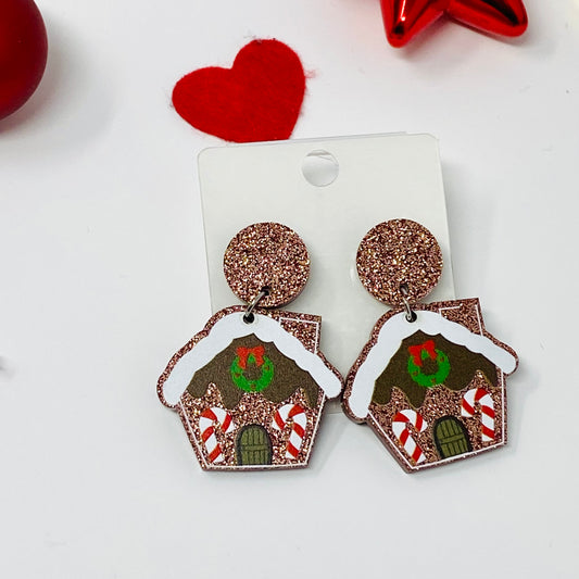 Gingerbread House Christmas Earring, Holiday Earrings, Dangle and Drop earrings
