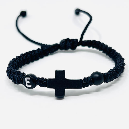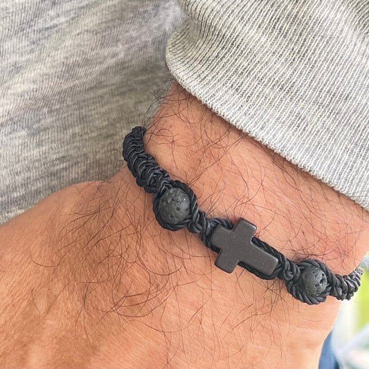 Cross bracelet men, Initial bracelet, Christian religious catholic protection, black cord beads, Christmas gift for him, boyfriend father