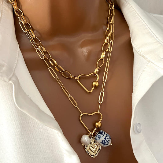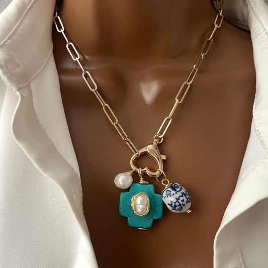 Carabiner necklace, Chunky charm necklace, Custom gold vintage, handmade Christmas gift women, paperclip necklace, pearl pendant