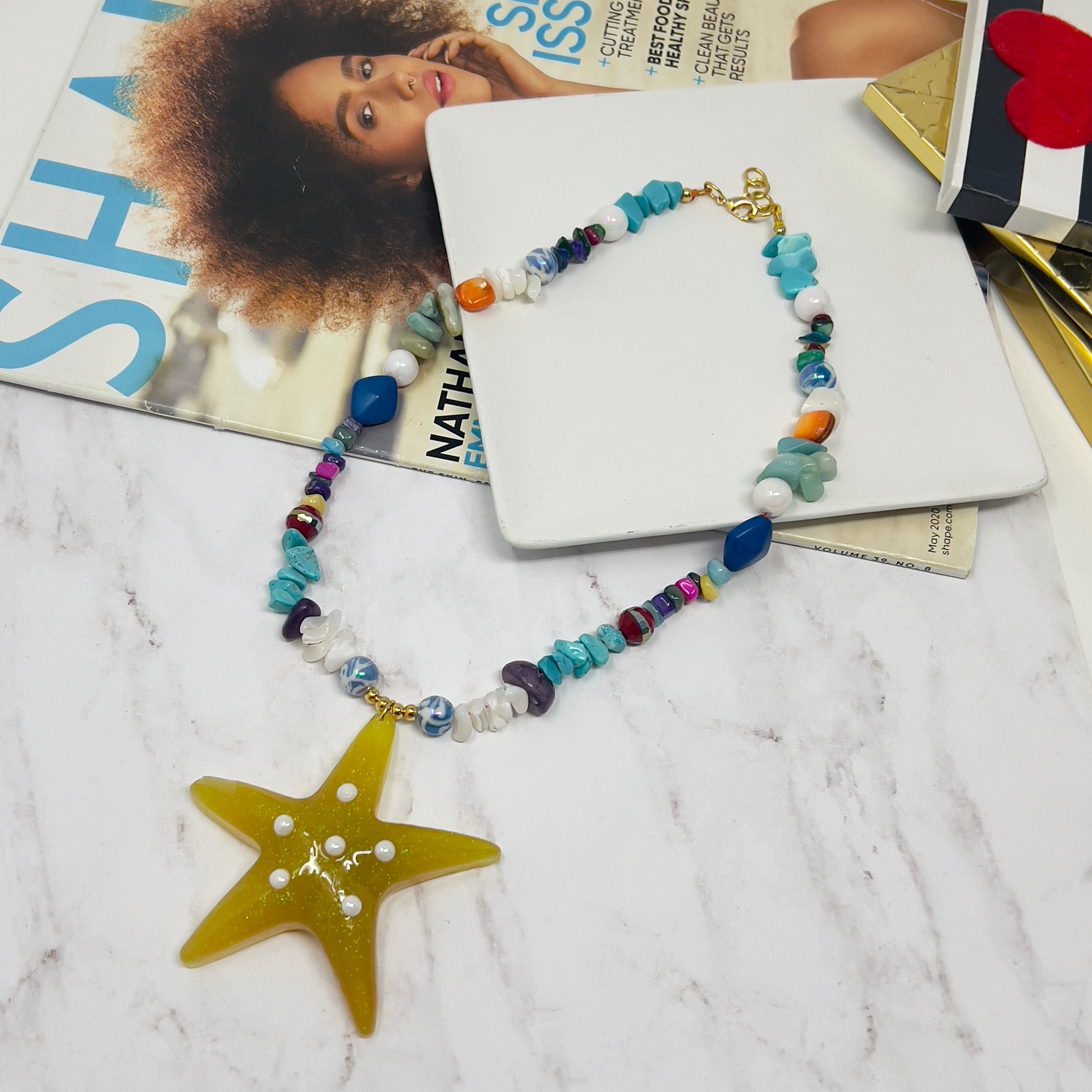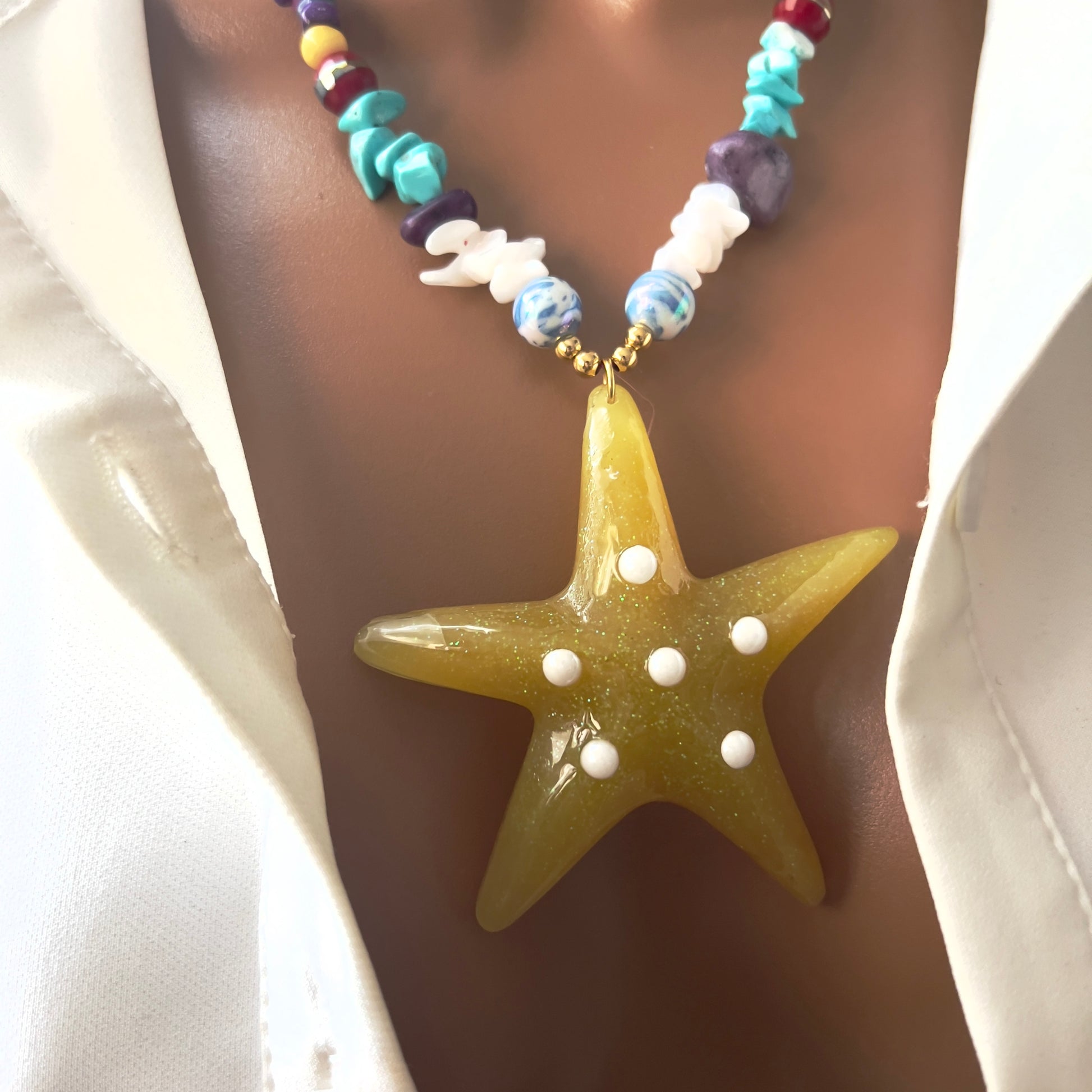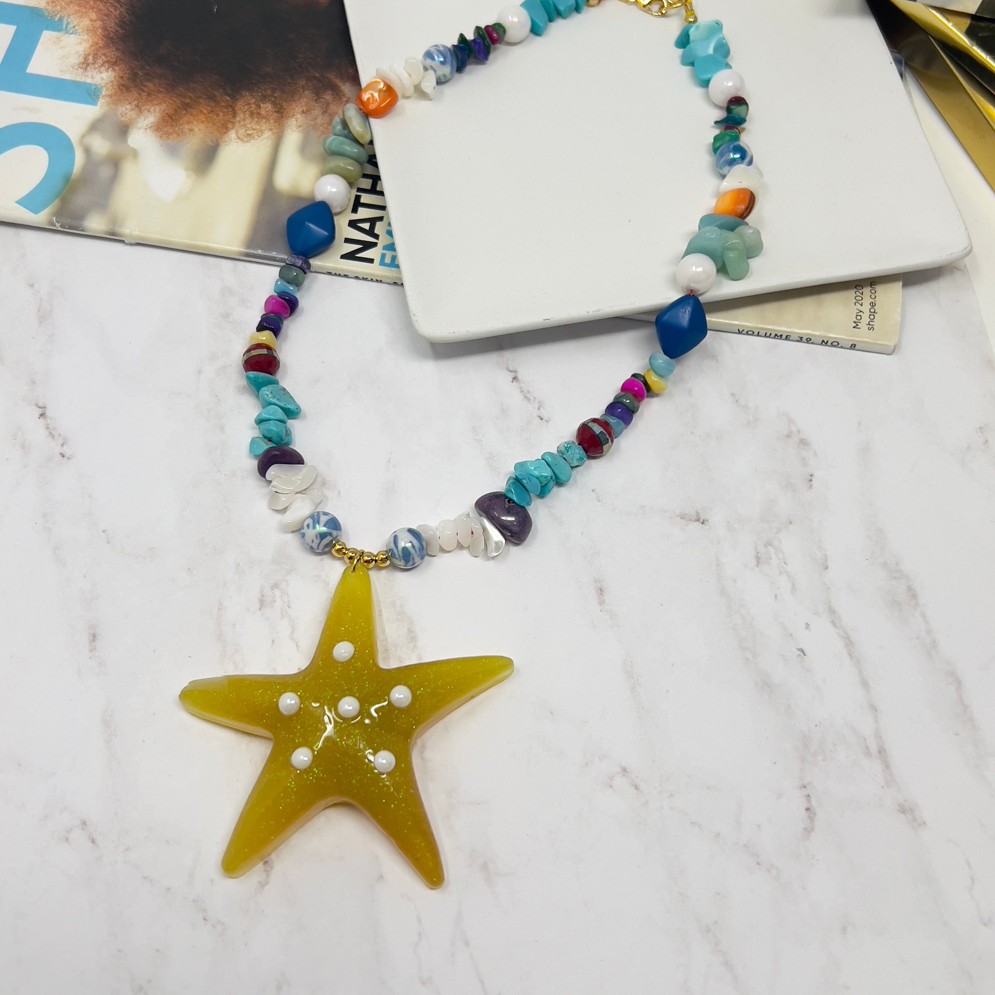 Chunky Starfish Pendant Necklace, Chunky Charm Necklace, Gemstone Beaded Necklace, Resin Starfish Pendant Necklace, Turquoise Neclace, Opal Necklace