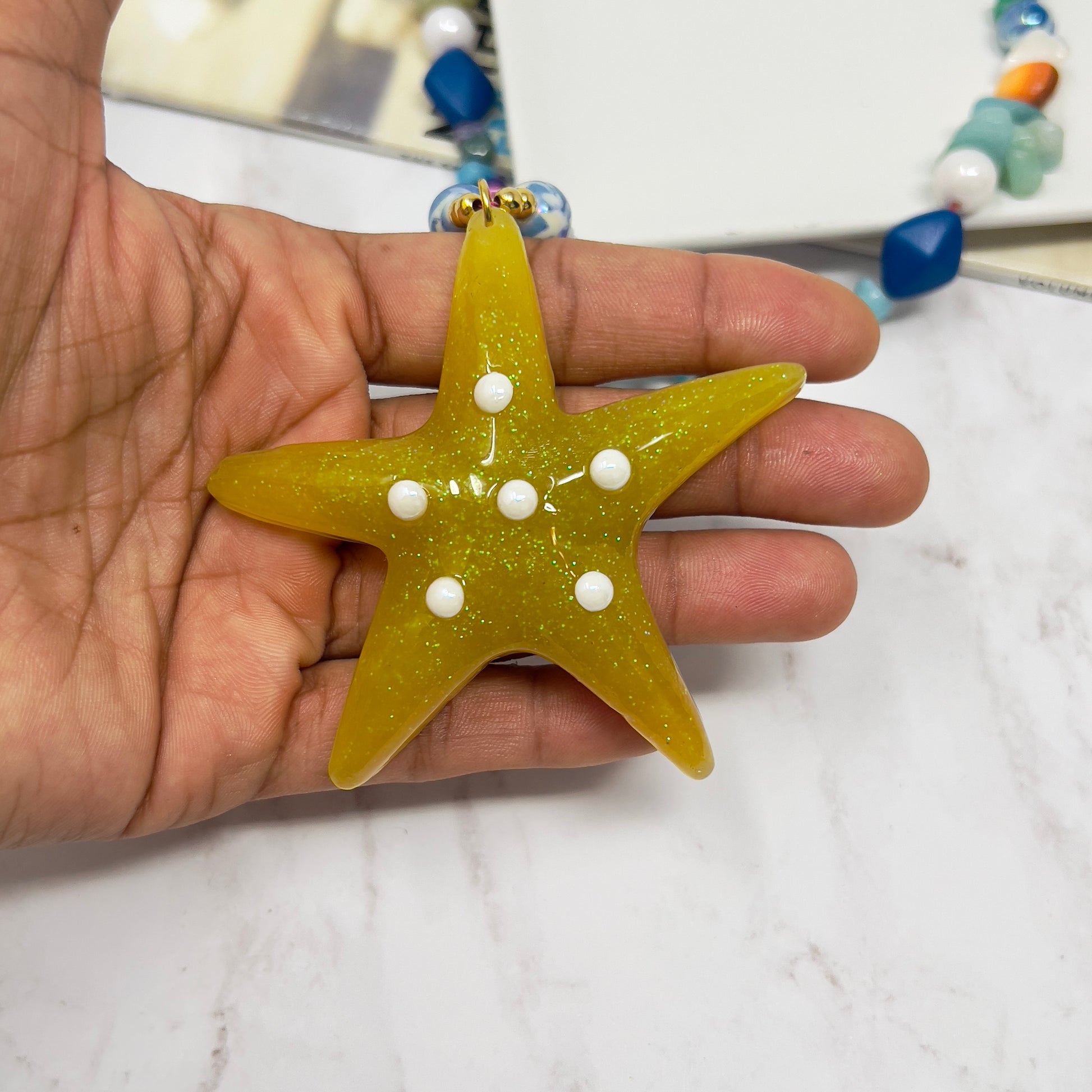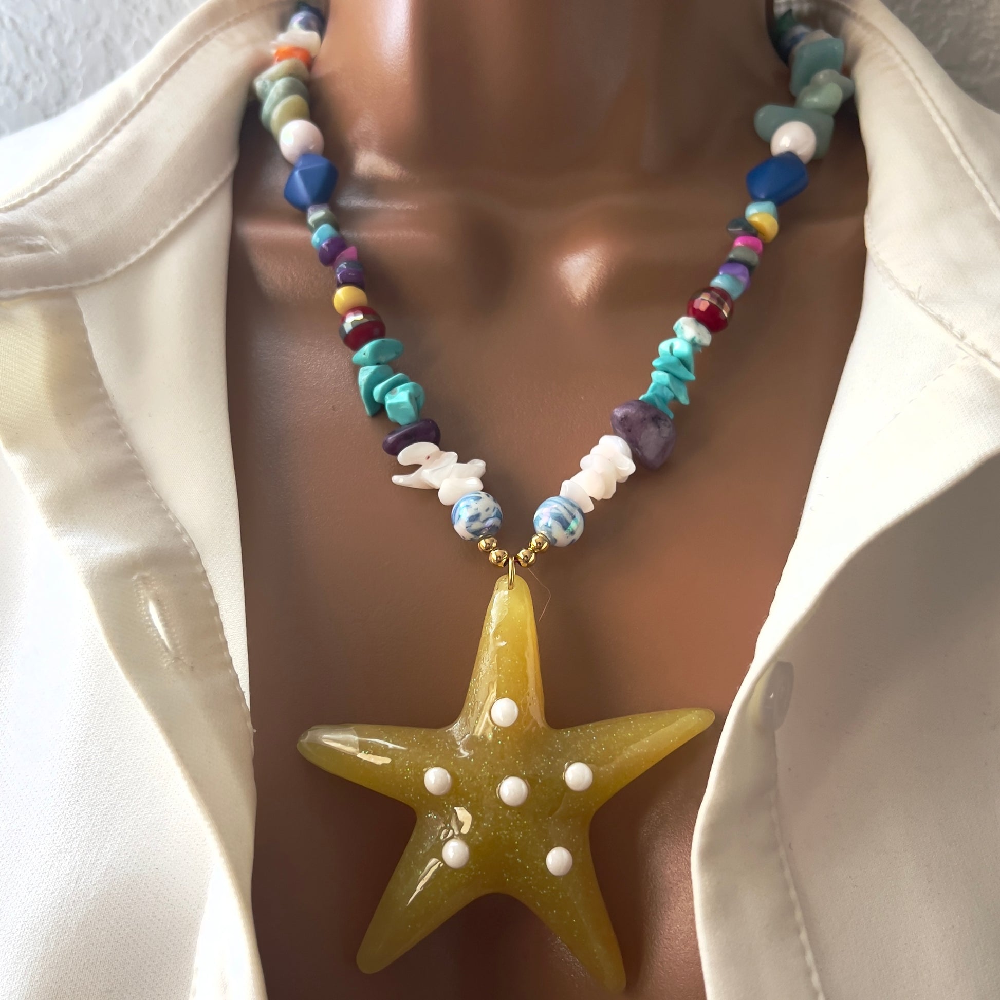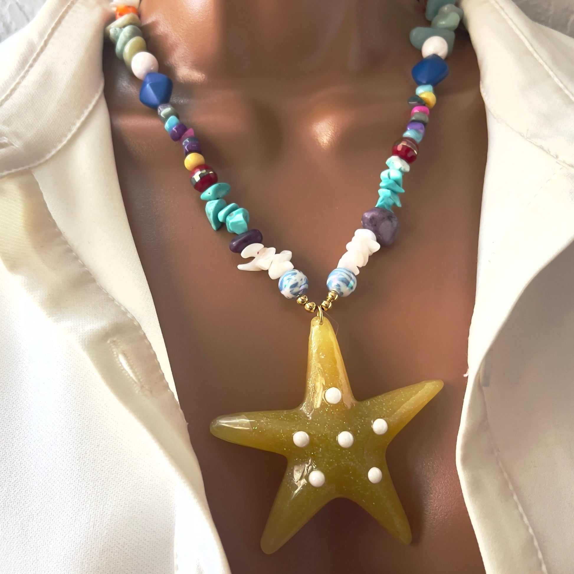 Chunky Starfish Pendant Necklace, Chunky Charm Necklace, Gemstone Beaded Necklace, Resin Starfish Pendant Necklace, Turquoise Neclace, Opal Necklace
