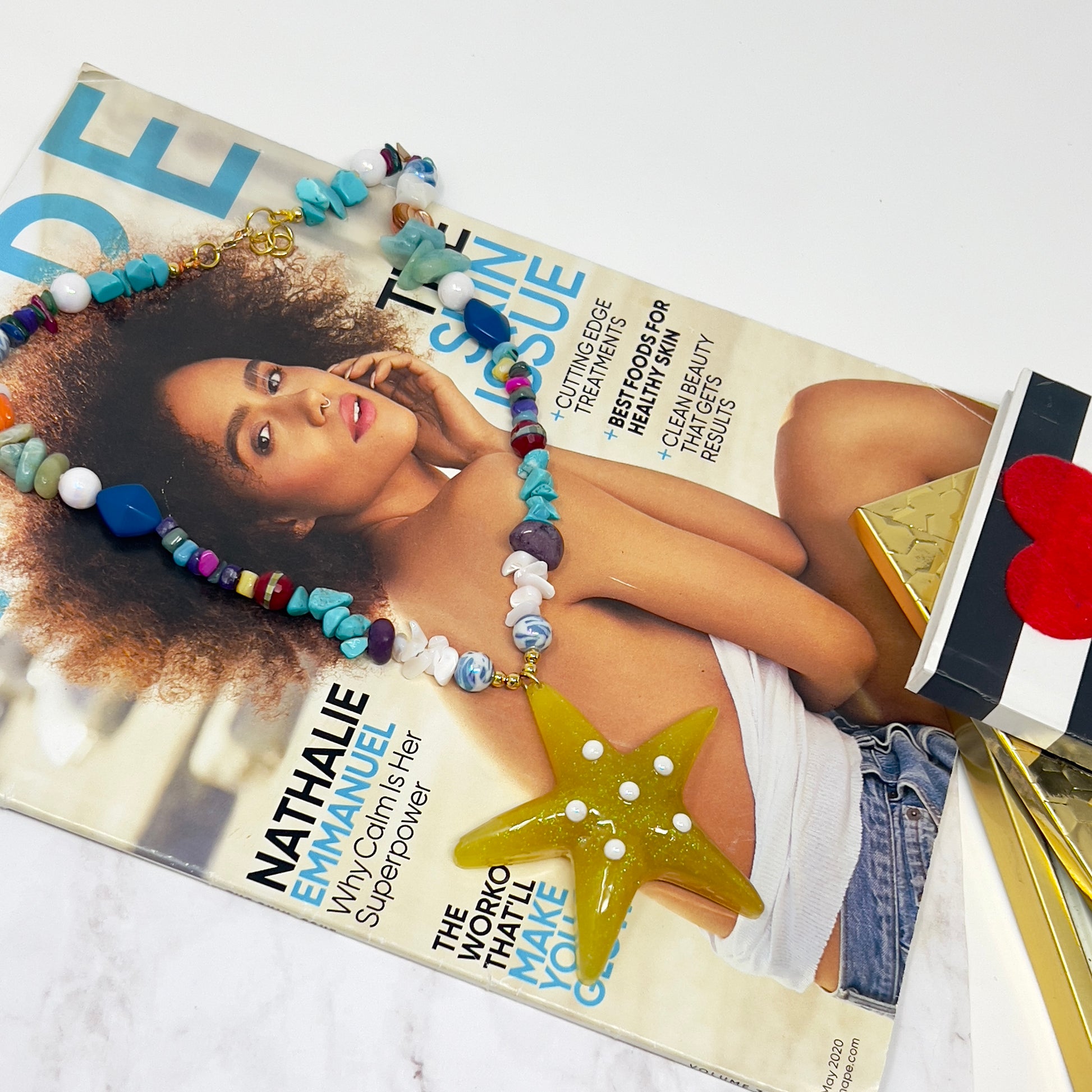 Make a bold statement with this Chunky Starfish Pendant Necklace, featuring a hand-poured resin starfish pendant full of summer vibes and ocean charm. The chunky charm is paired with a strand of natural mixed gemstone beads, including beautiful shades of turquoise and opal, creating a unique and vibrant piece that captures the essence of the sea.