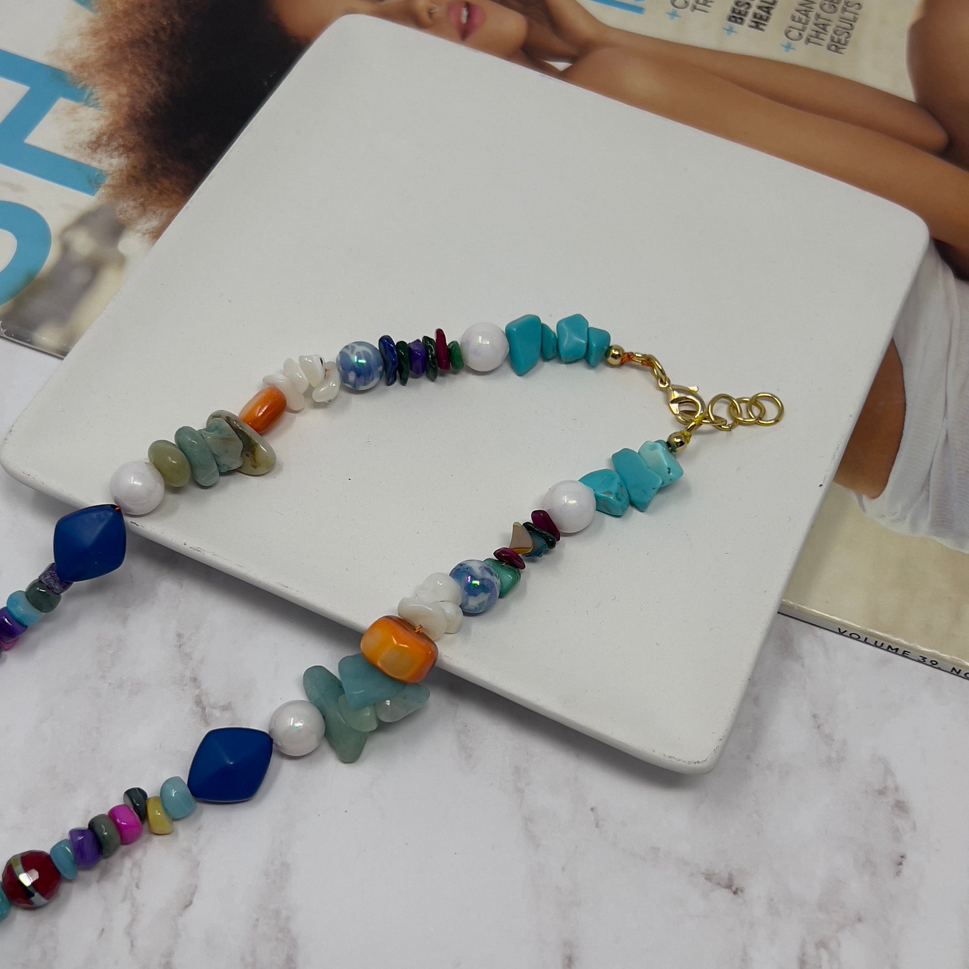 This Gemstone Beaded Necklace is perfect for beach lovers and ocean dreamers looking to add a touch of coastal elegance to their outfits. The combination of textures and colors gives it a boho-chic look, making it a standout Chunky Charm Necklace for summer days, festivals, or vacation wear.