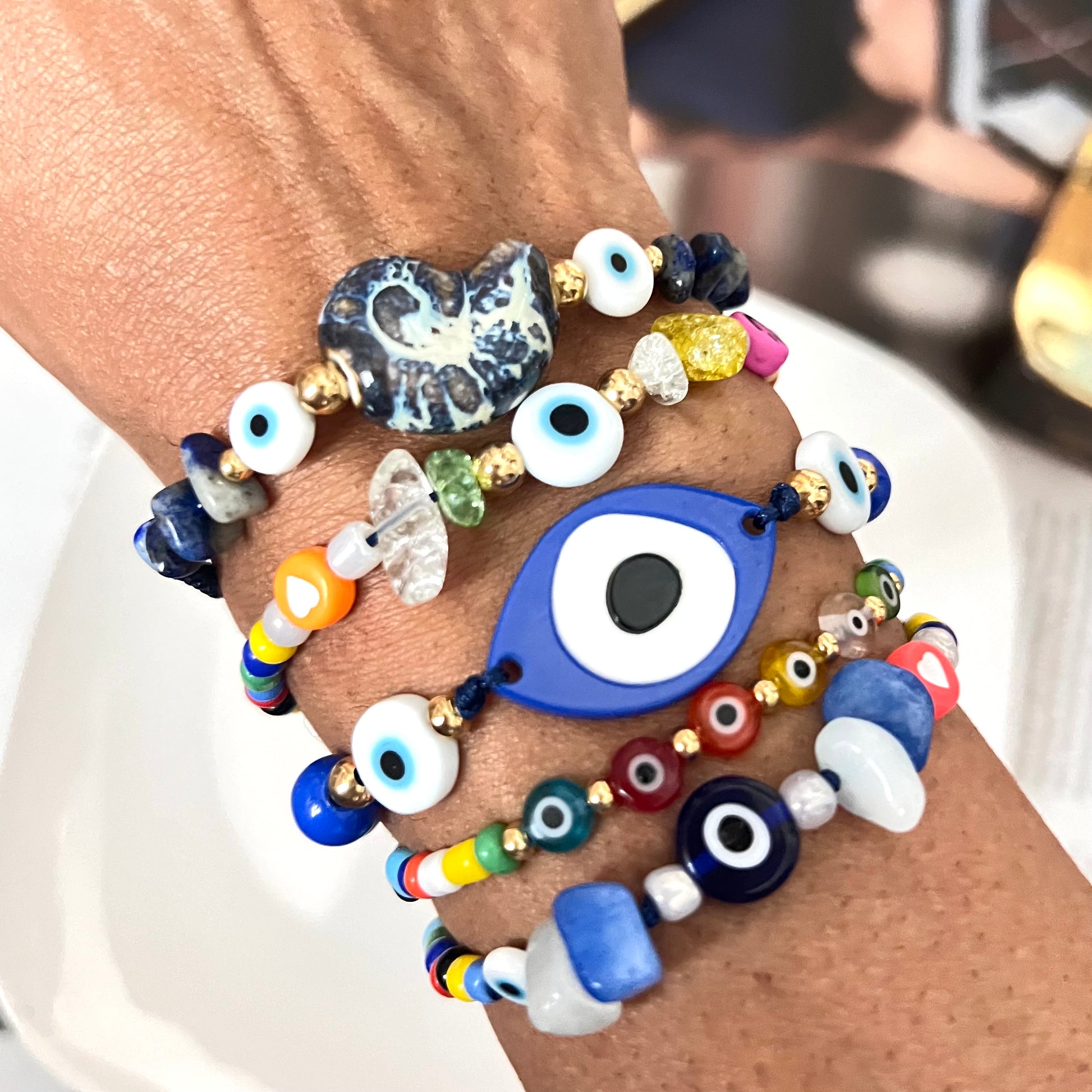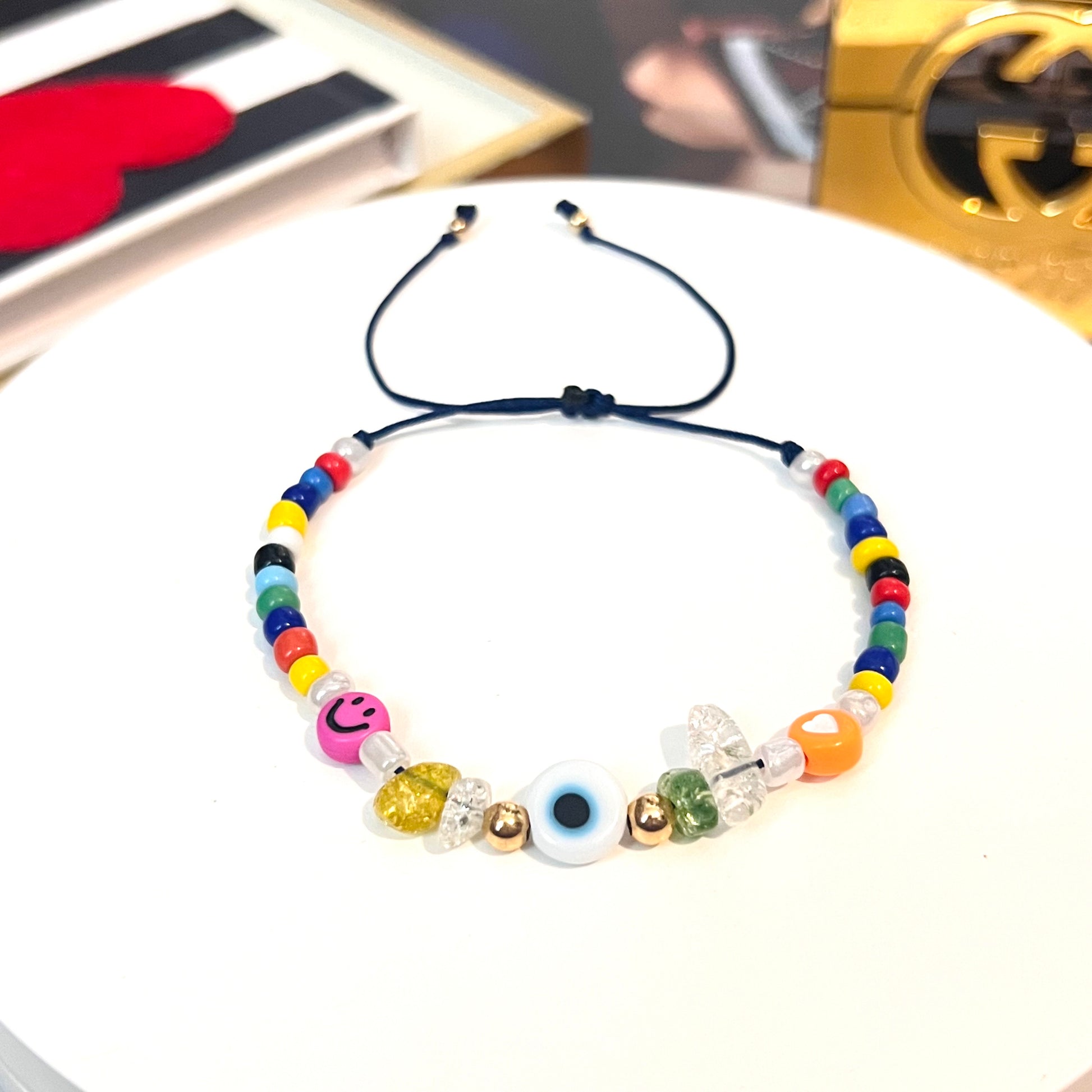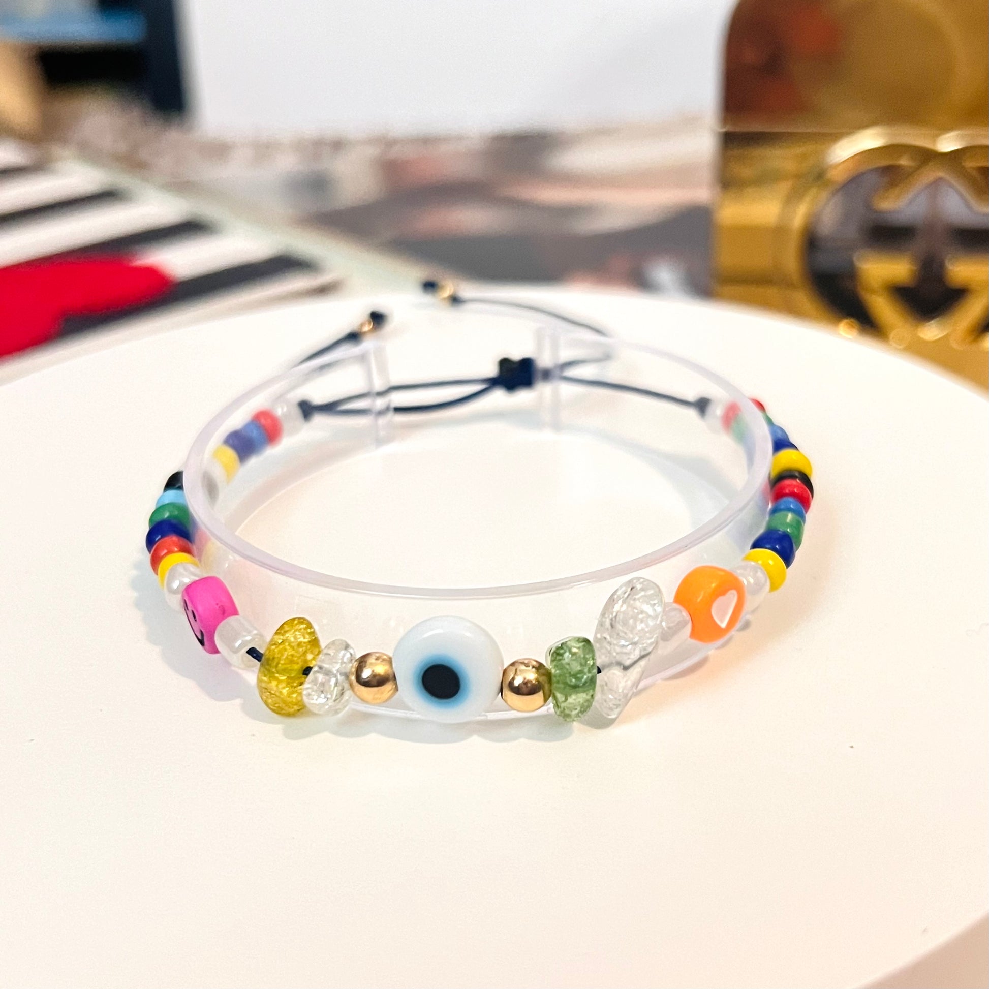 Beautiful handmade summer evil eye bracelet adjustable with several fun charms to give color and joy to your summer, excellent gift idea for your best friends, you can combine them with our summer choker I will leave the link below and it will enhance your outfit to another level