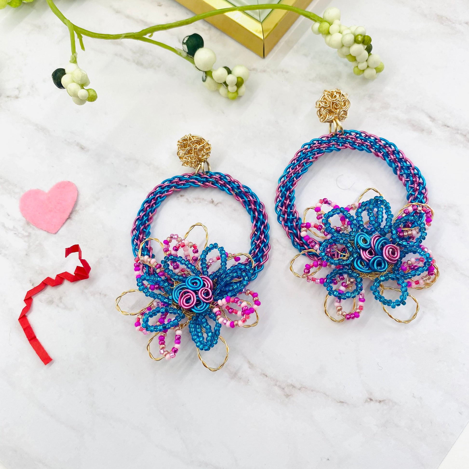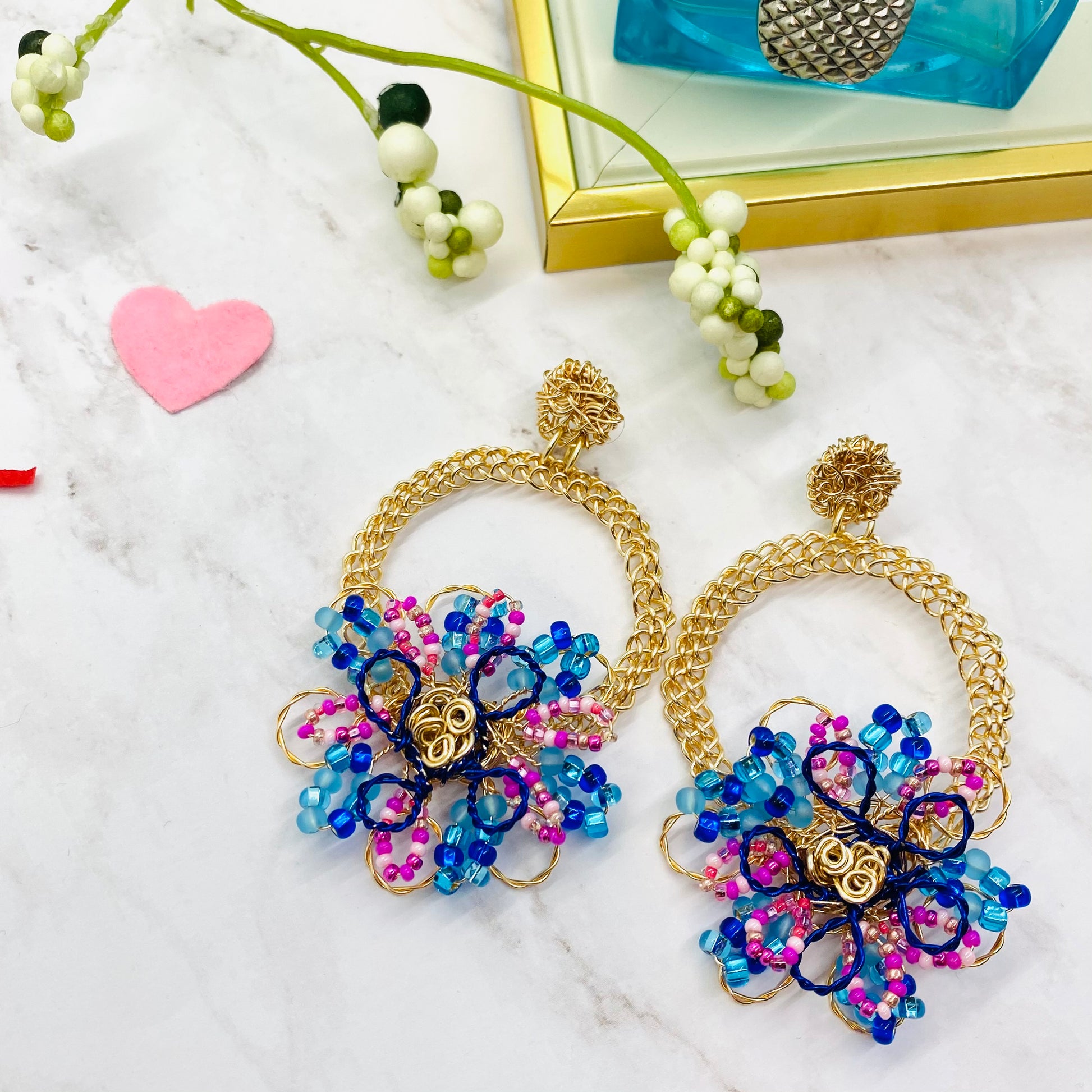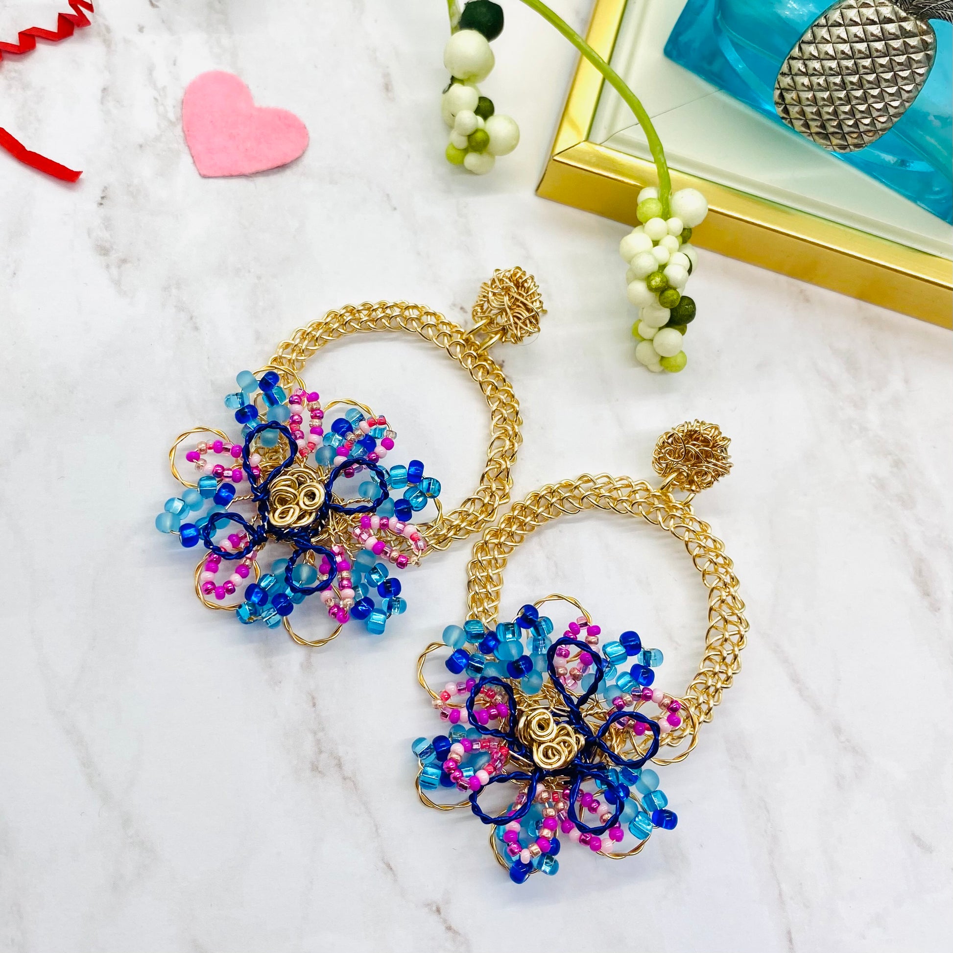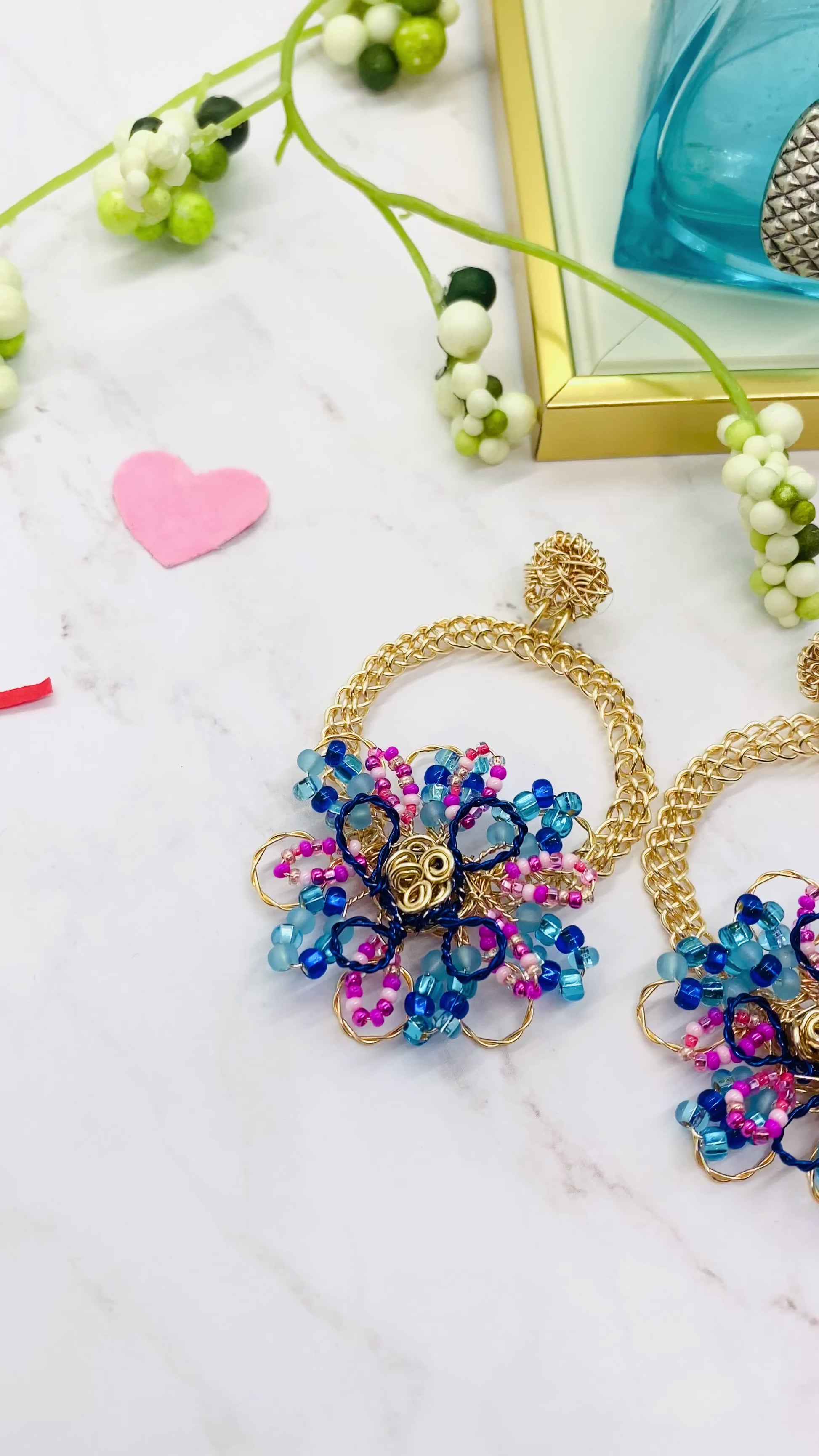 Beautiful embroidery wires earring with a circle shape of gold wire and mixed color beads, this beautiful earring belongs to the beautiful ocean collection