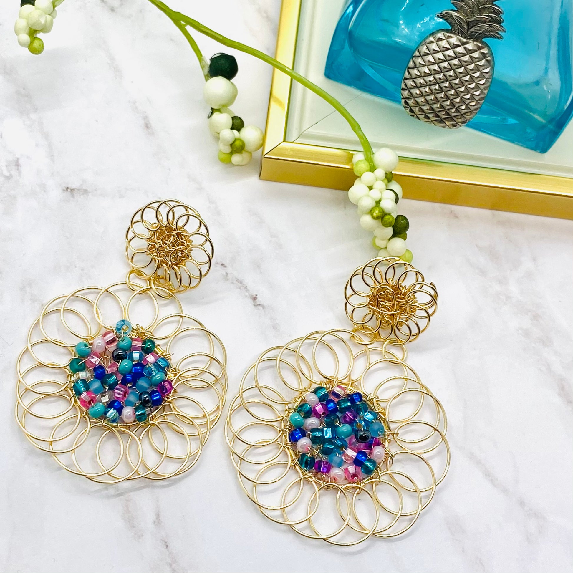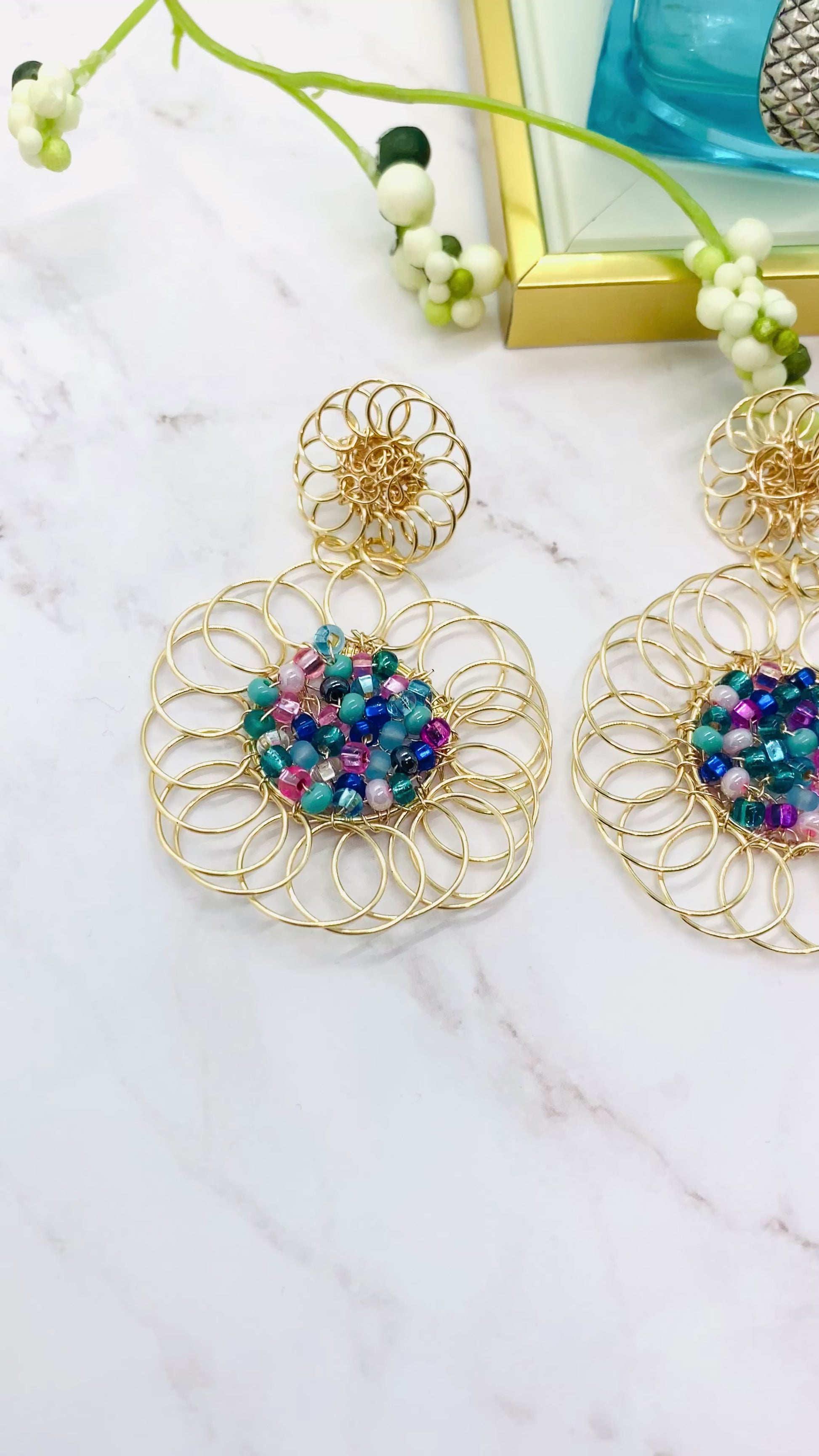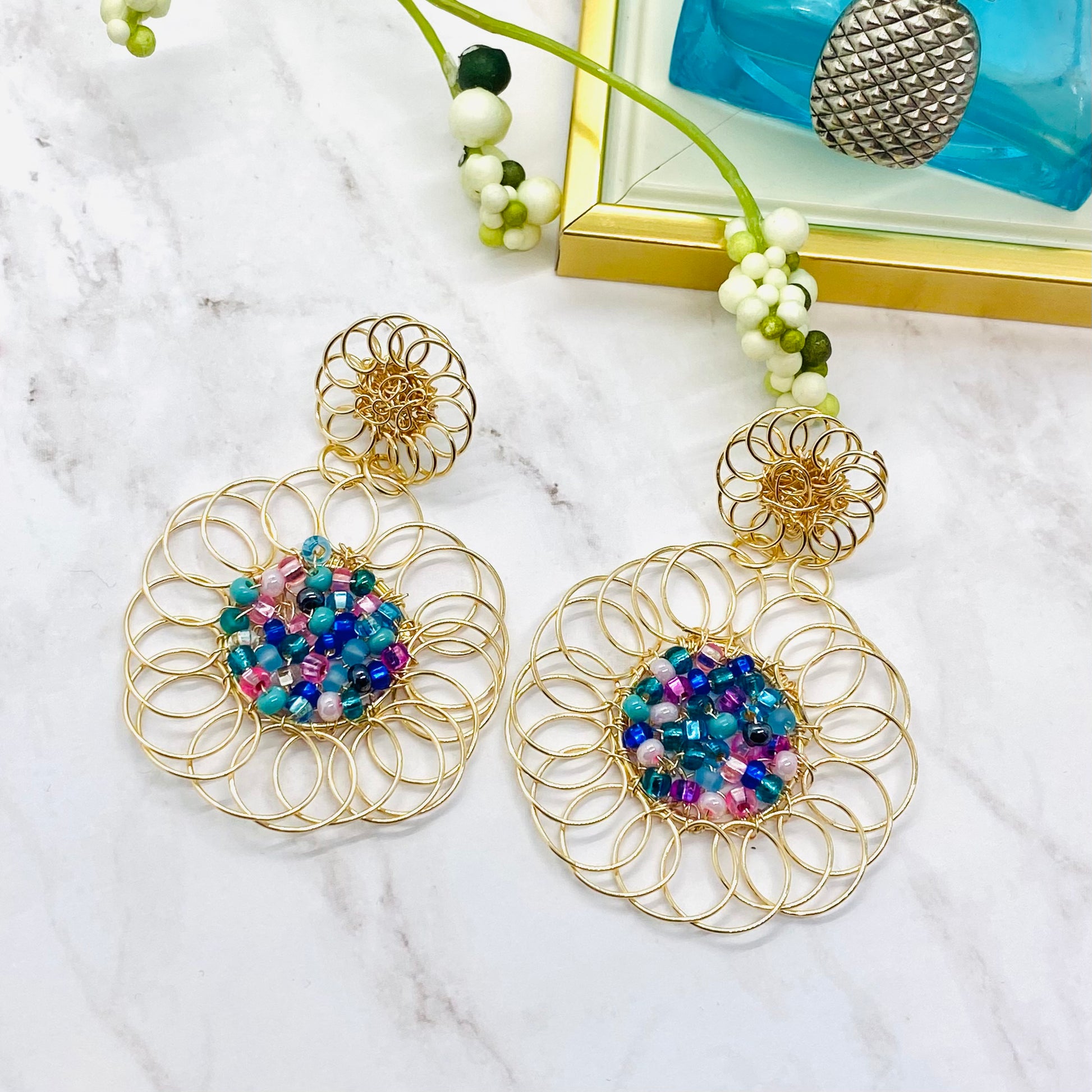 Beautiful embroidery wire earring of flower shape of gold wire and mixed color beads, this beautiful earring belongs to the beautiful Ocean collection