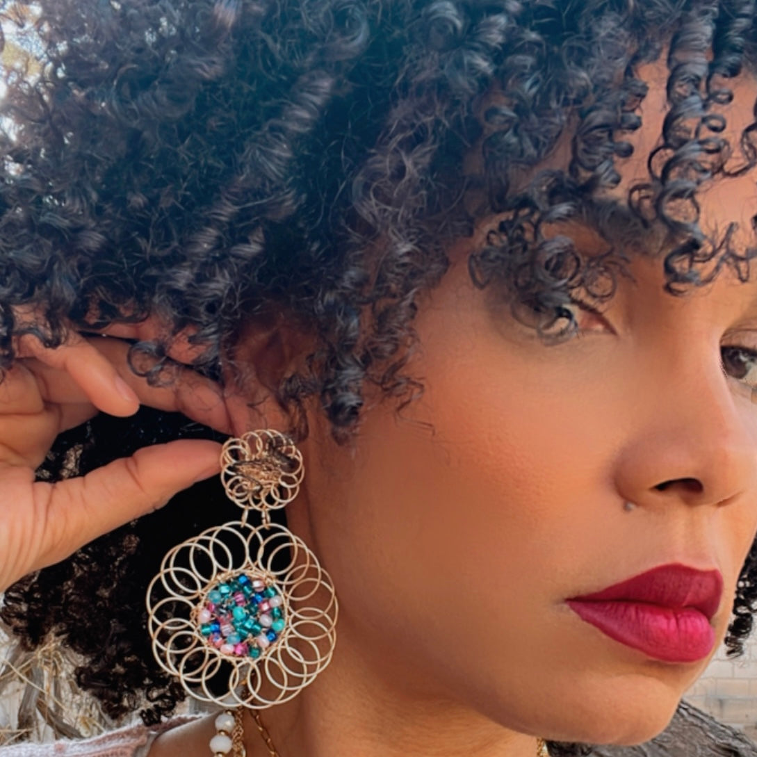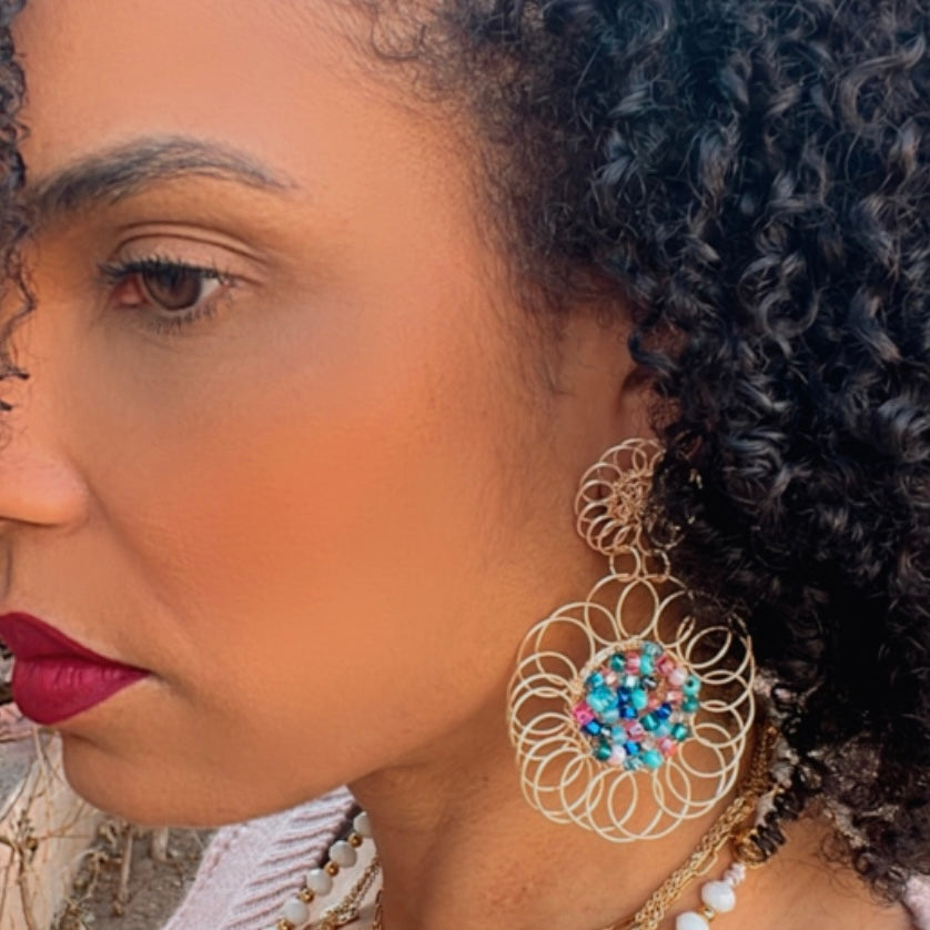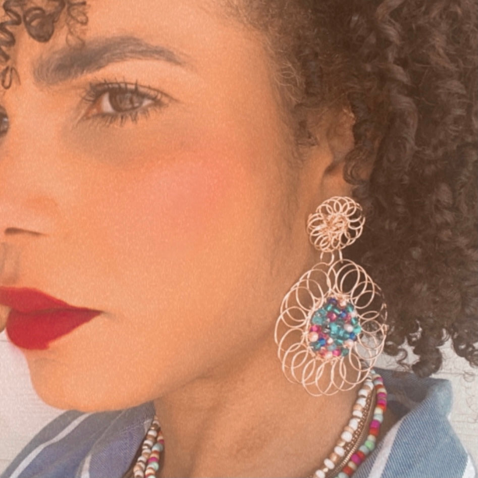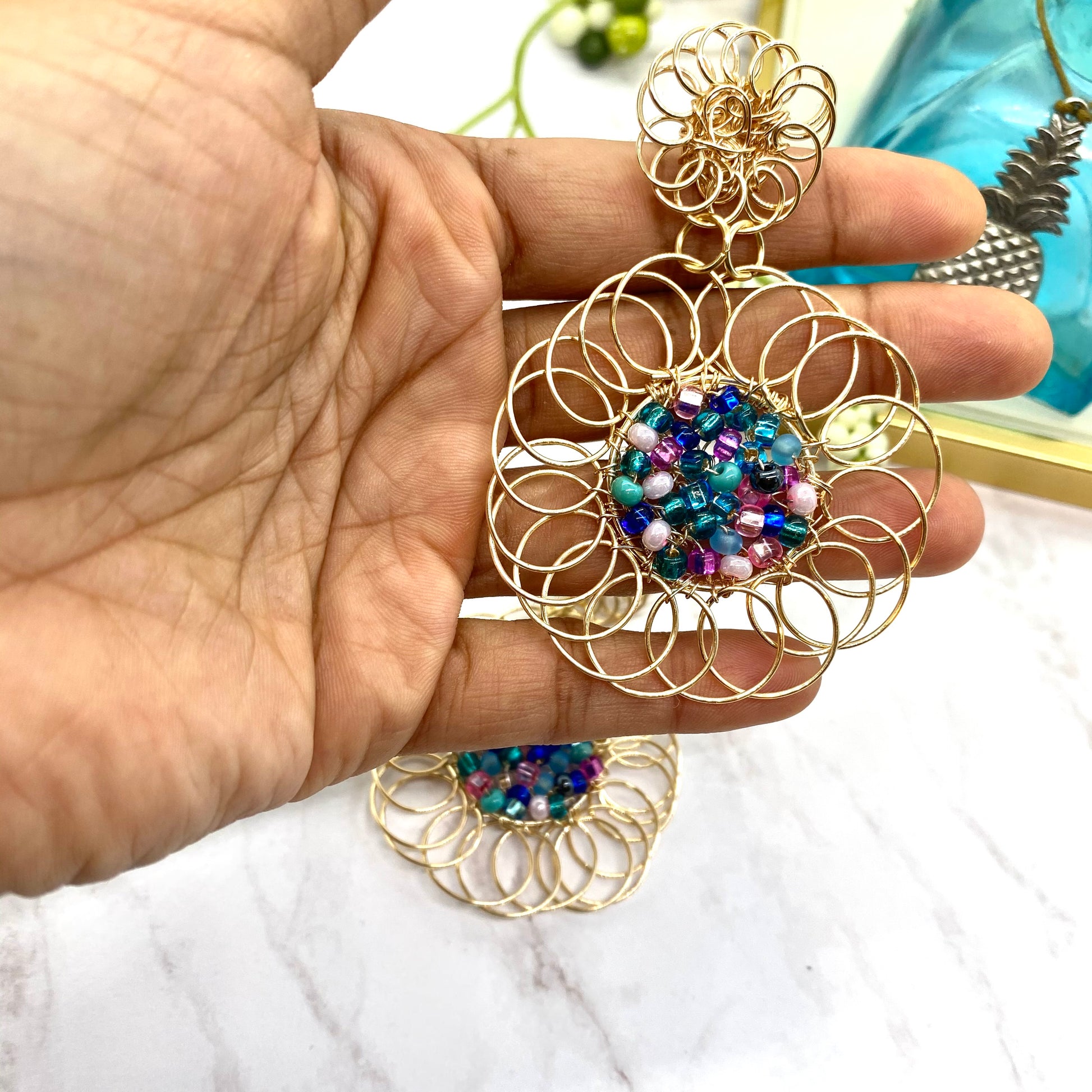 Beautiful embroidery wire earring of flower shape of gold wire and mixed color beads, this beautiful earring belongs to the beautiful Ocean collection