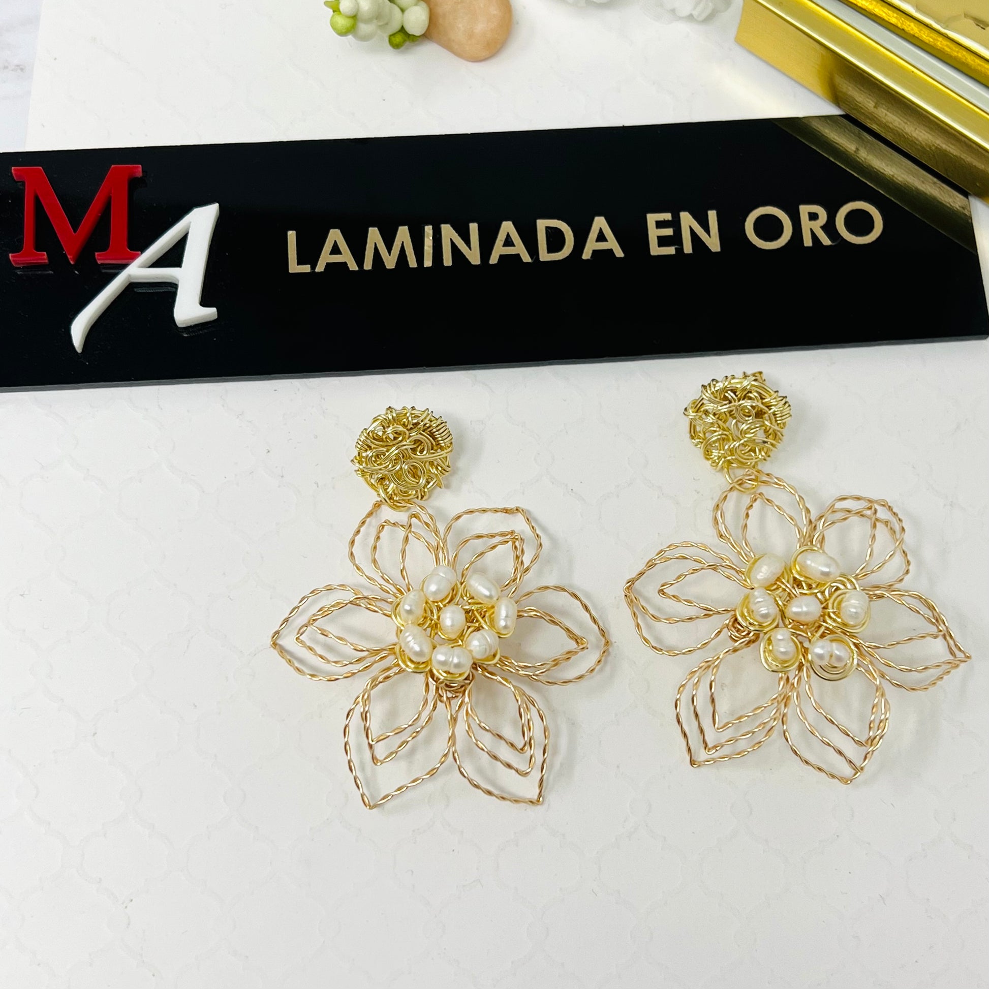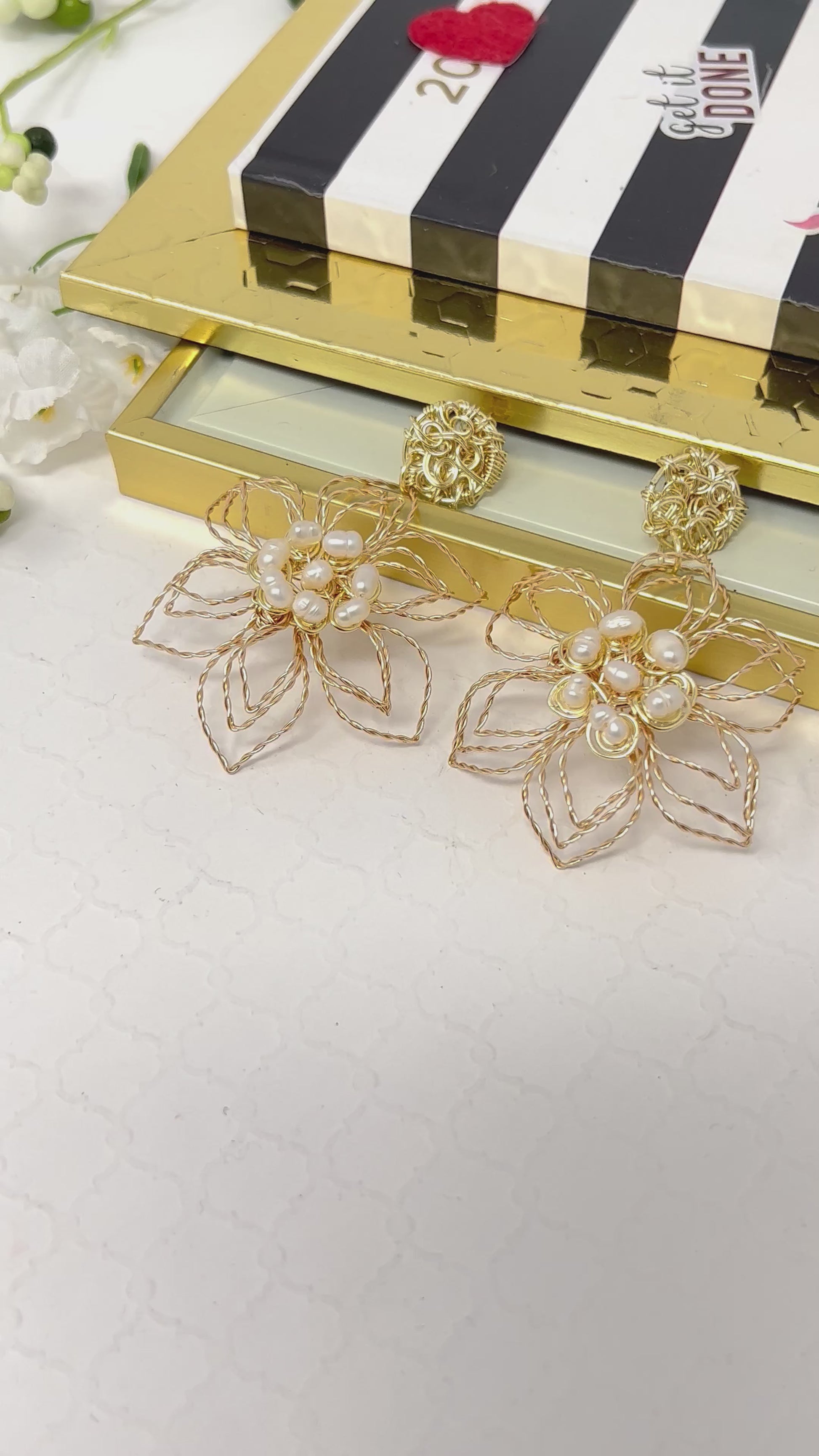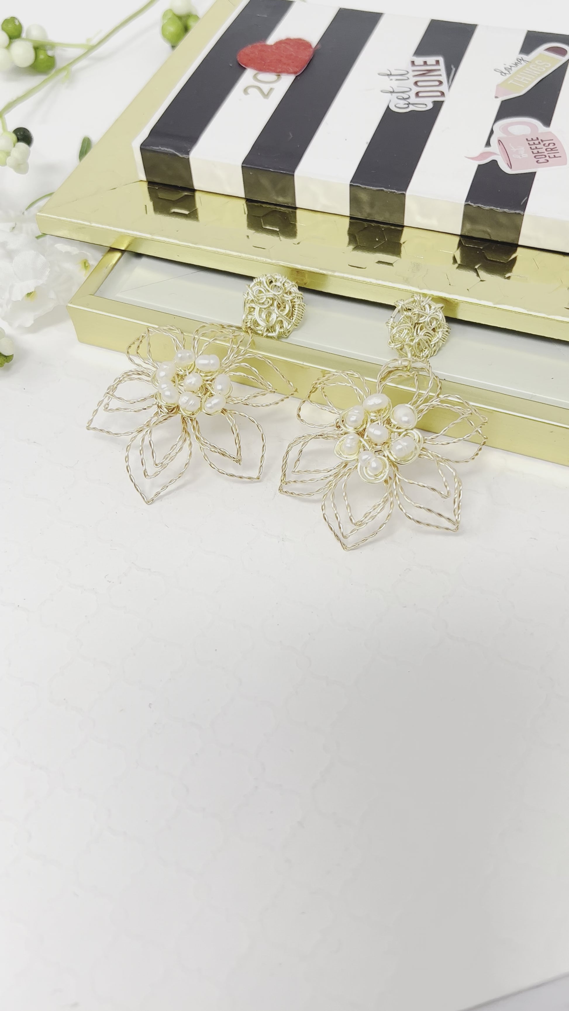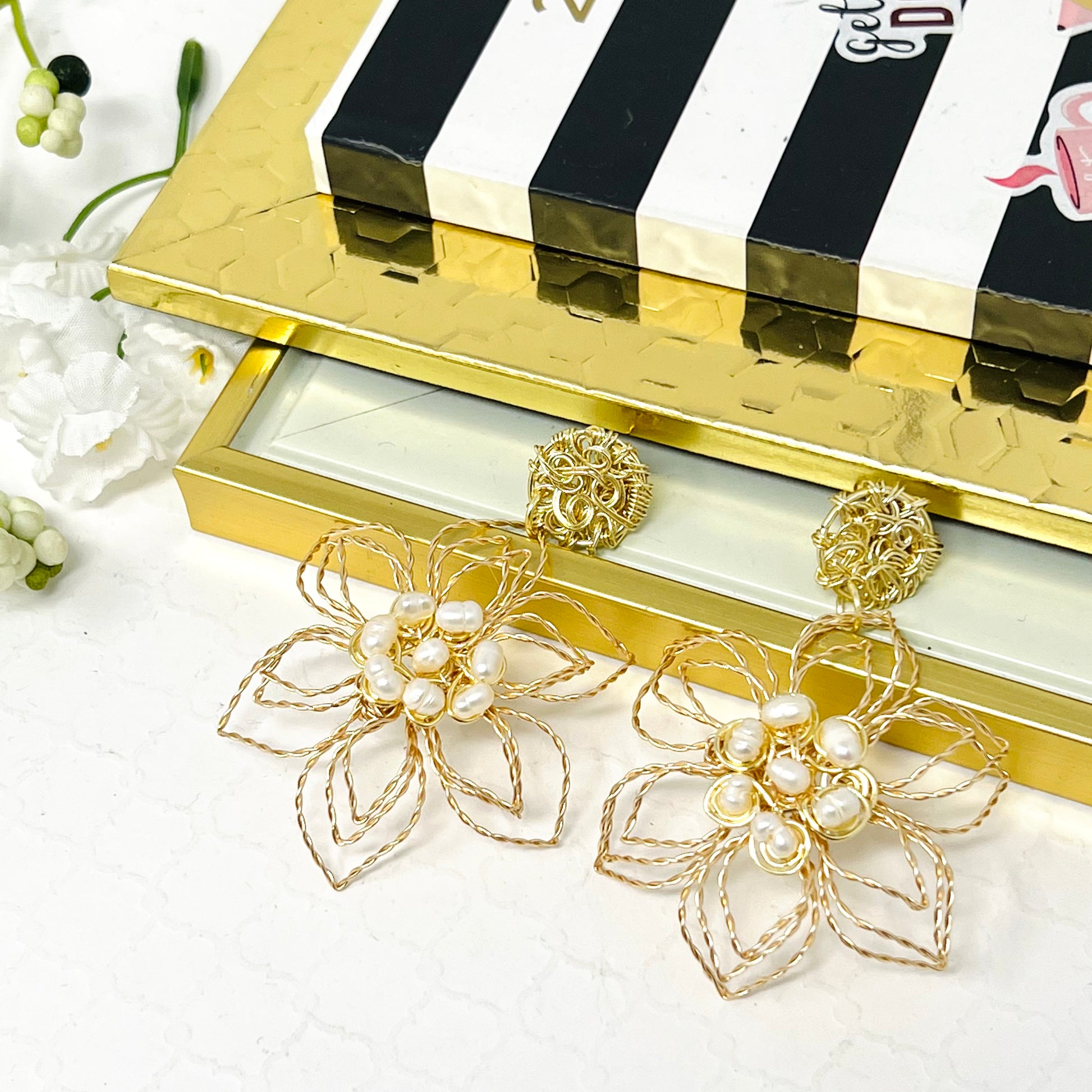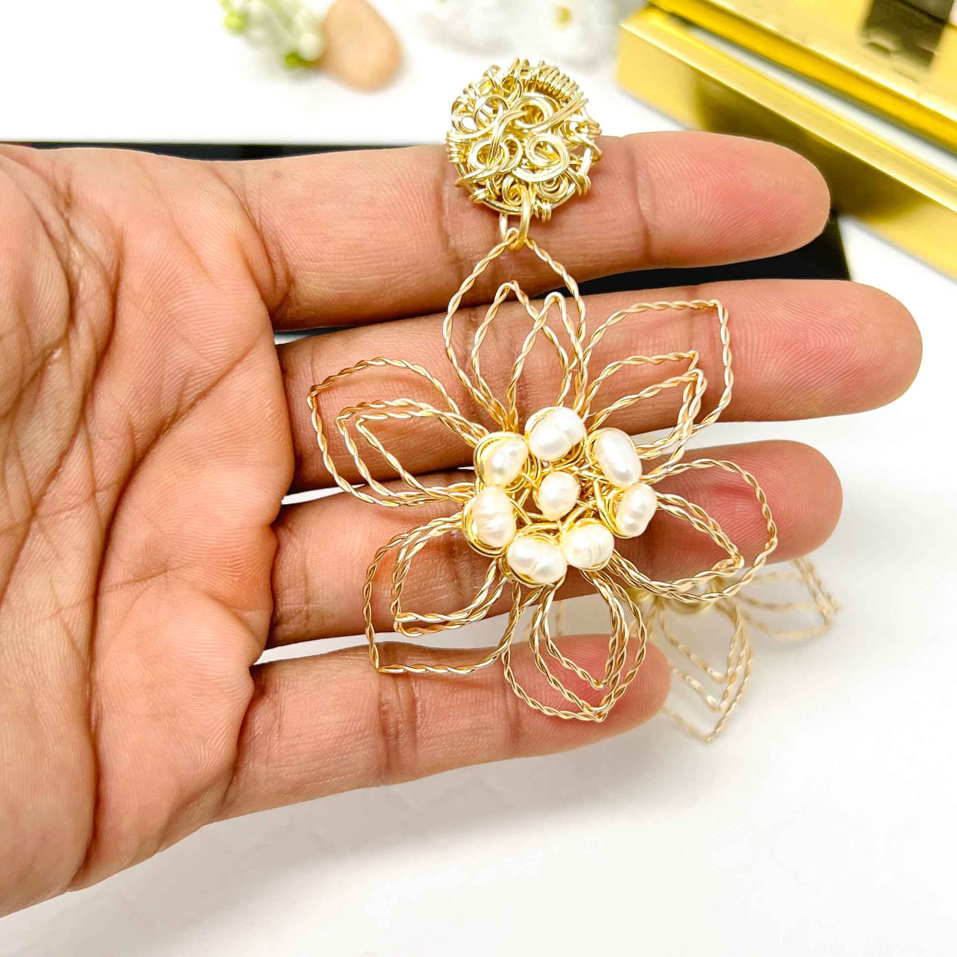 Beautiful and delicate handmade gold plated wire twisted earrings in the shape of flowers with freshwater pearl, super light
