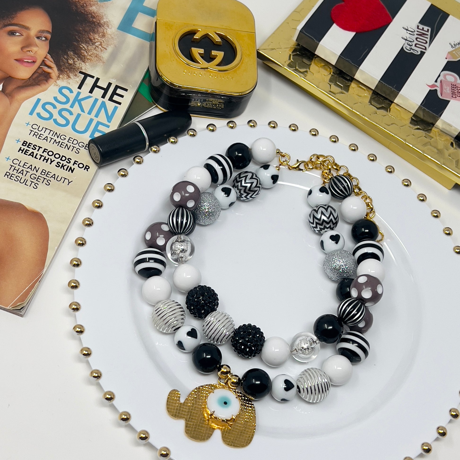 This handmade two-layer beaded necklace features chunky beads and elegant gold-plated charms for a chic, modern look. The adjustable design allows you to wear it at your desired length, making it perfect for layering or as a statement piece on its own. Lightweight and versatile, this necklace adds a touch of boho elegance and style to any outfit — ideal for everyday wear or special occasions.