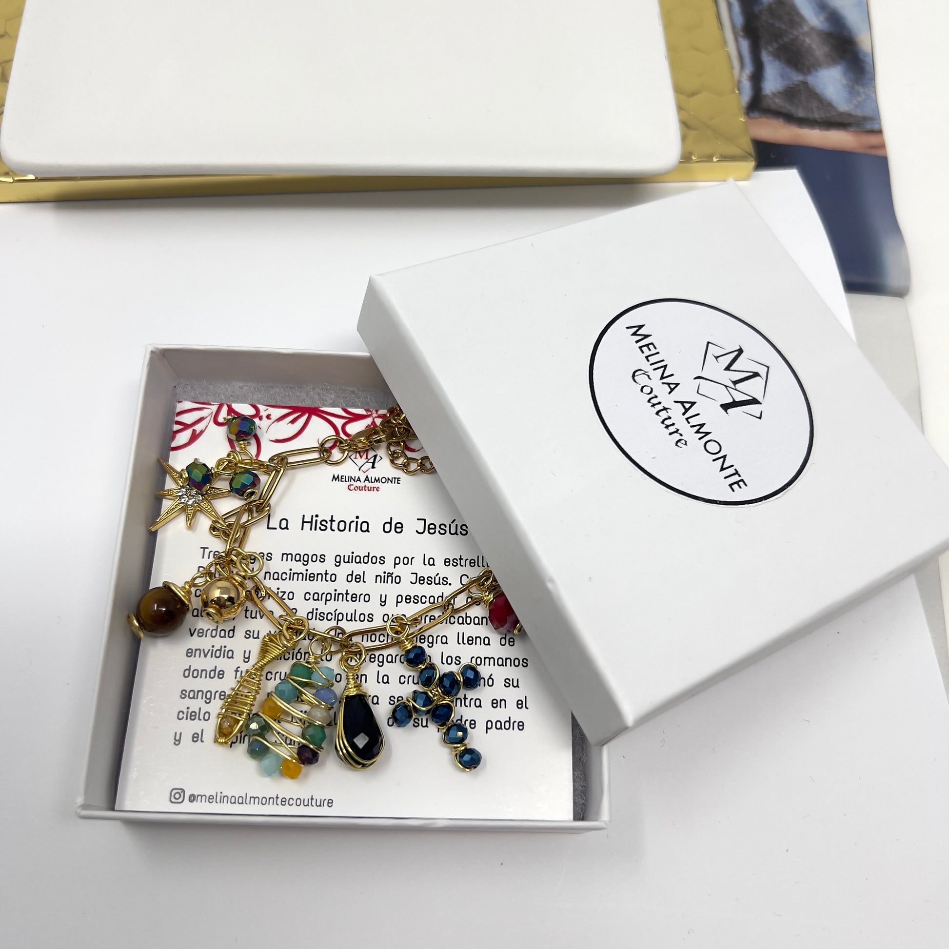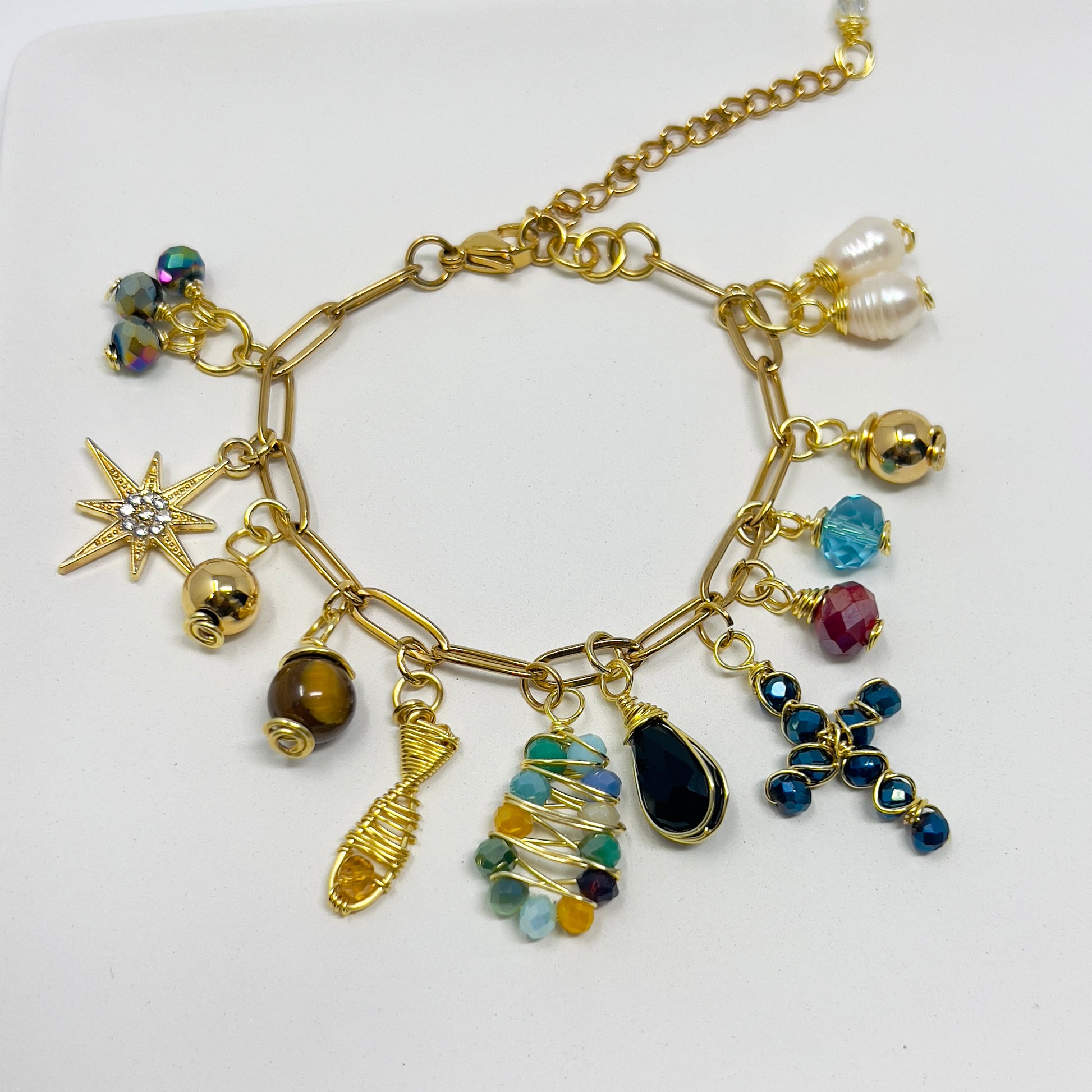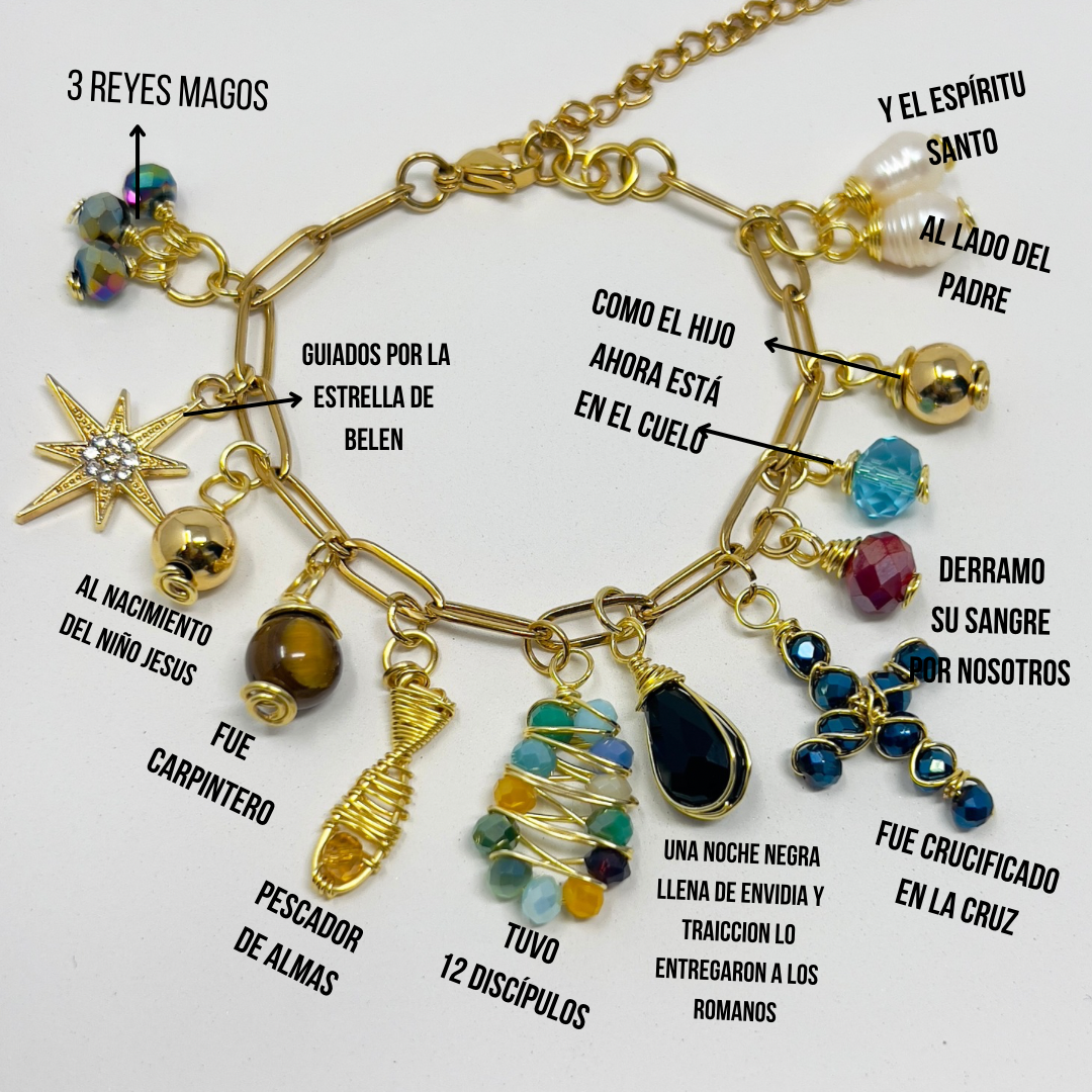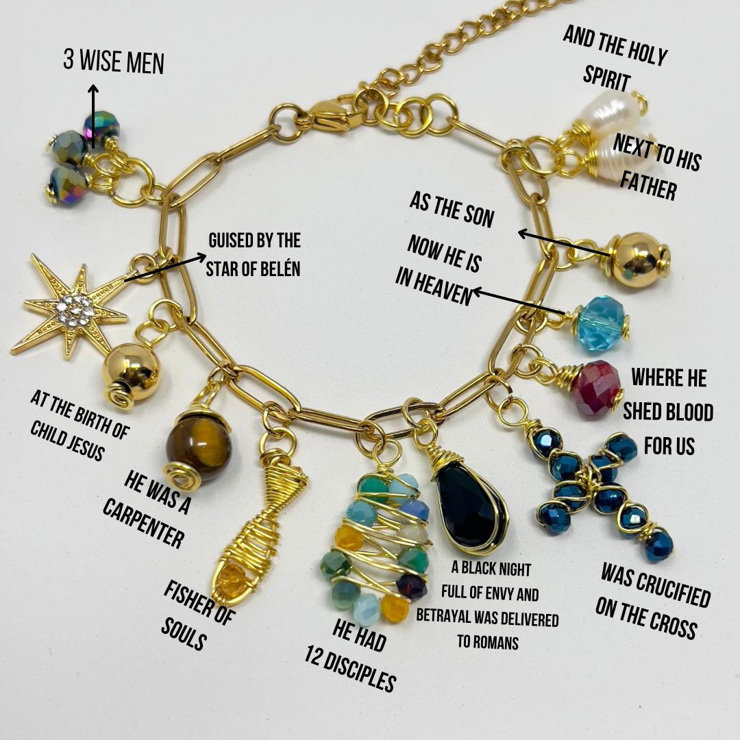 This beautiful handmade Christian bracelet tells the story of Jesus through its carefully selected beads and gold charms. With a mother-of-pearl cross and religious charms, this elegant charms bracelet is a meaningful reminder of faith, love, and devotion.