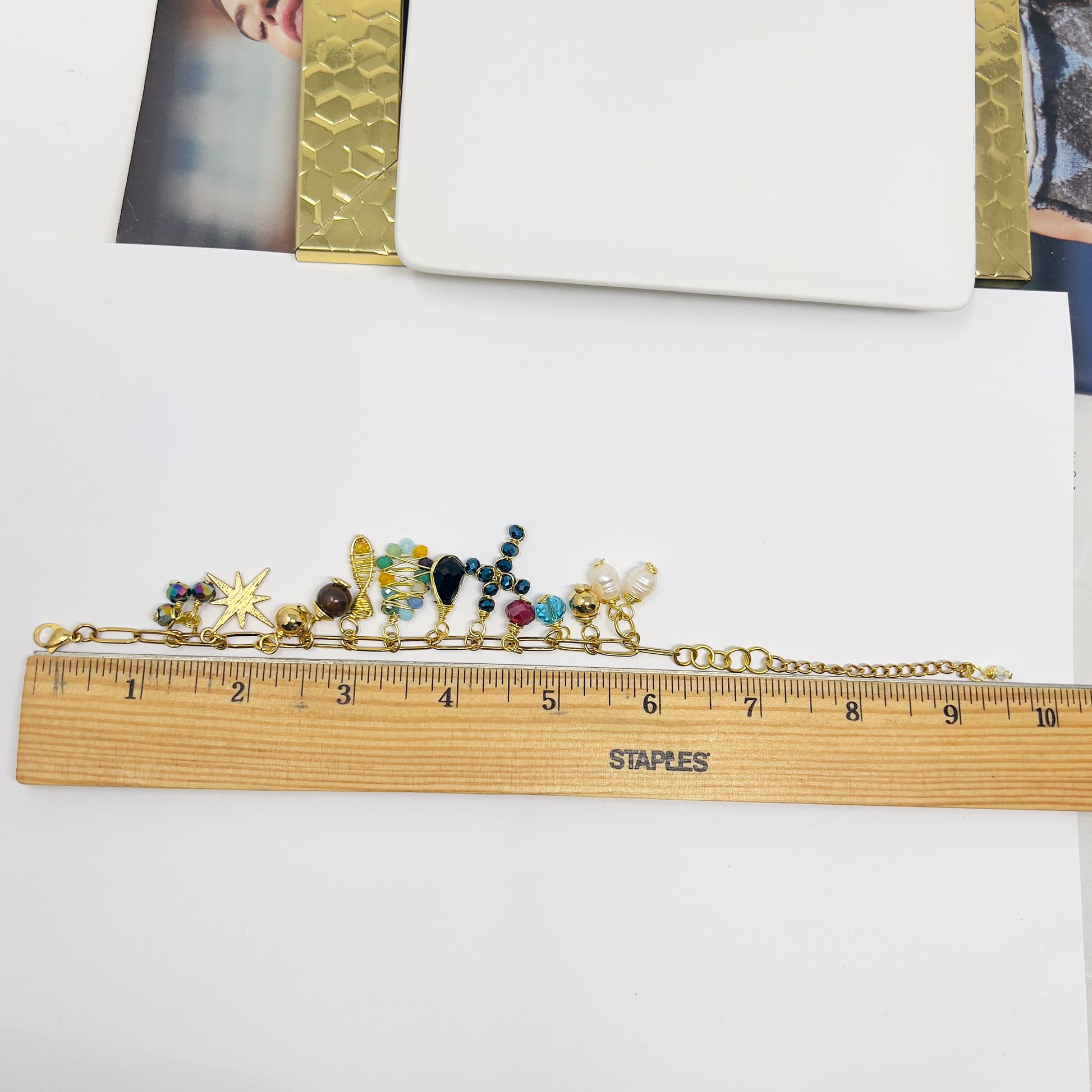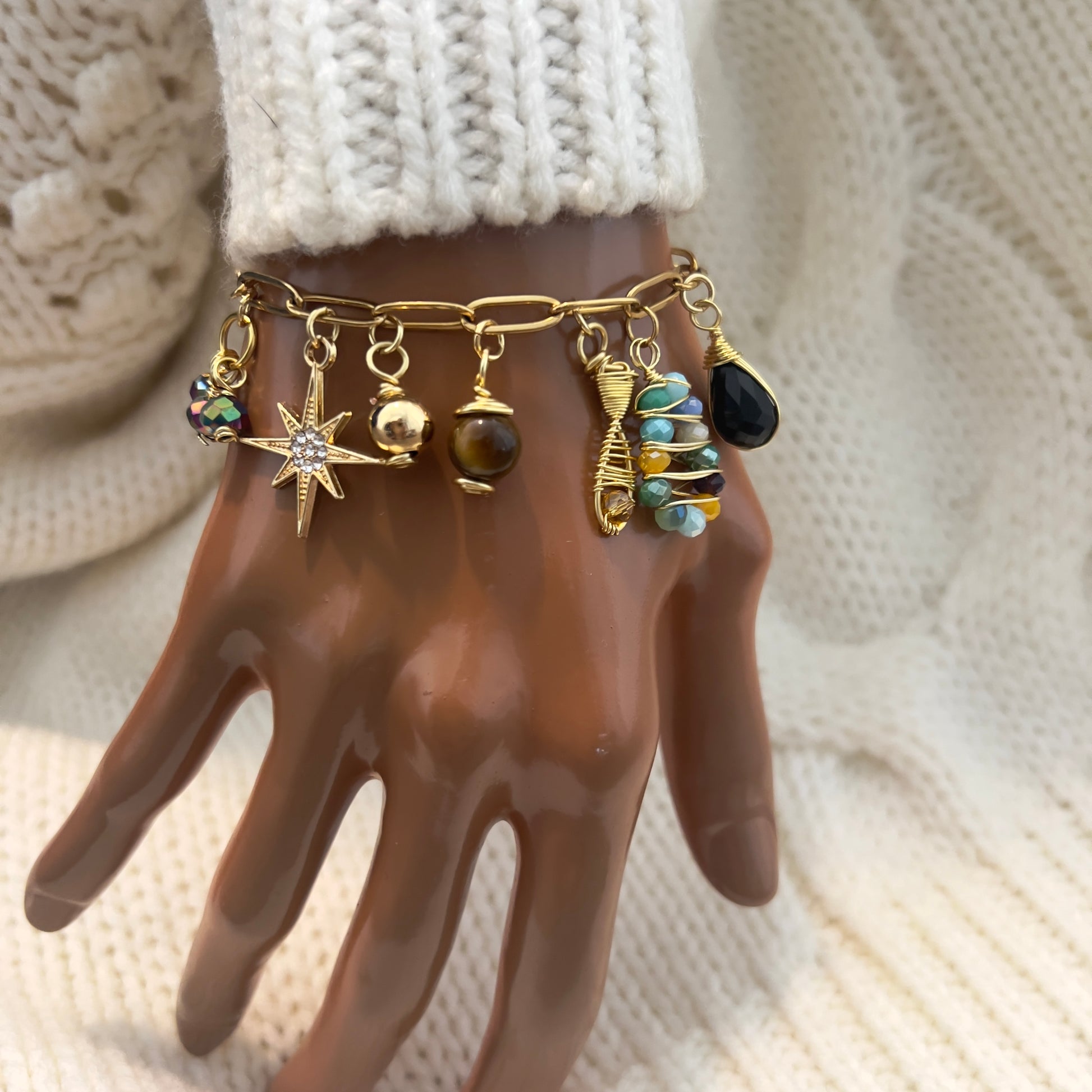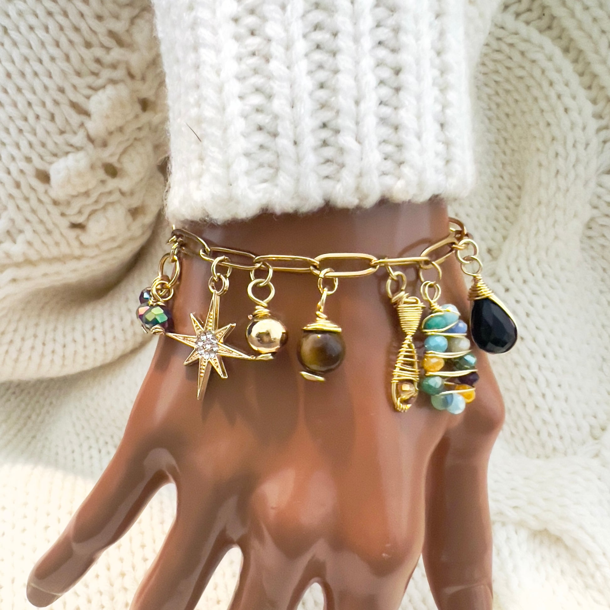 This beautiful handmade Christian bracelet tells the story of Jesus through its carefully selected beads and gold charms. With a mother-of-pearl cross and religious charms, this elegant charms bracelet is a meaningful reminder of faith, love, and devotion.