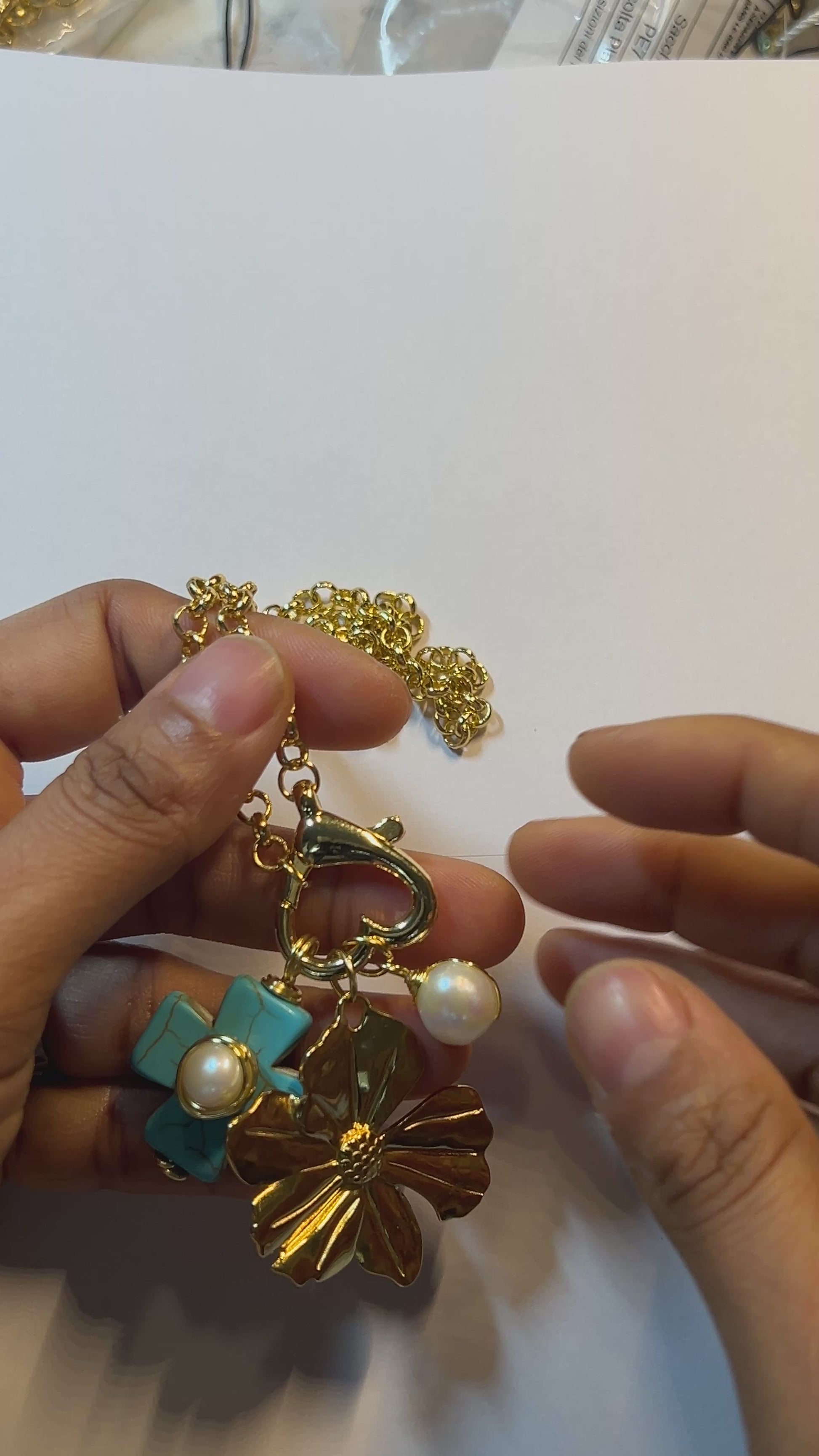 Materials: Czech crystal bed 4mm, mother of pearl star and cross, gold plated bead and fish, freshwater pearl