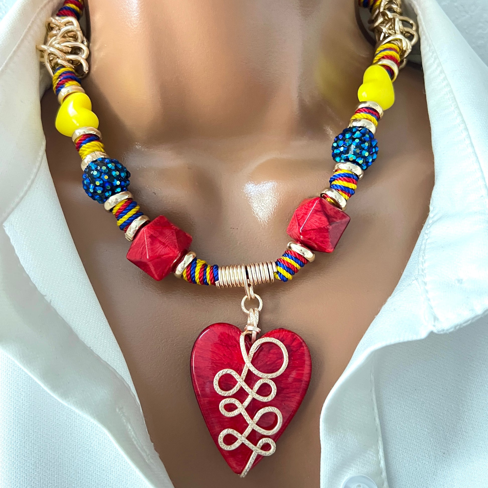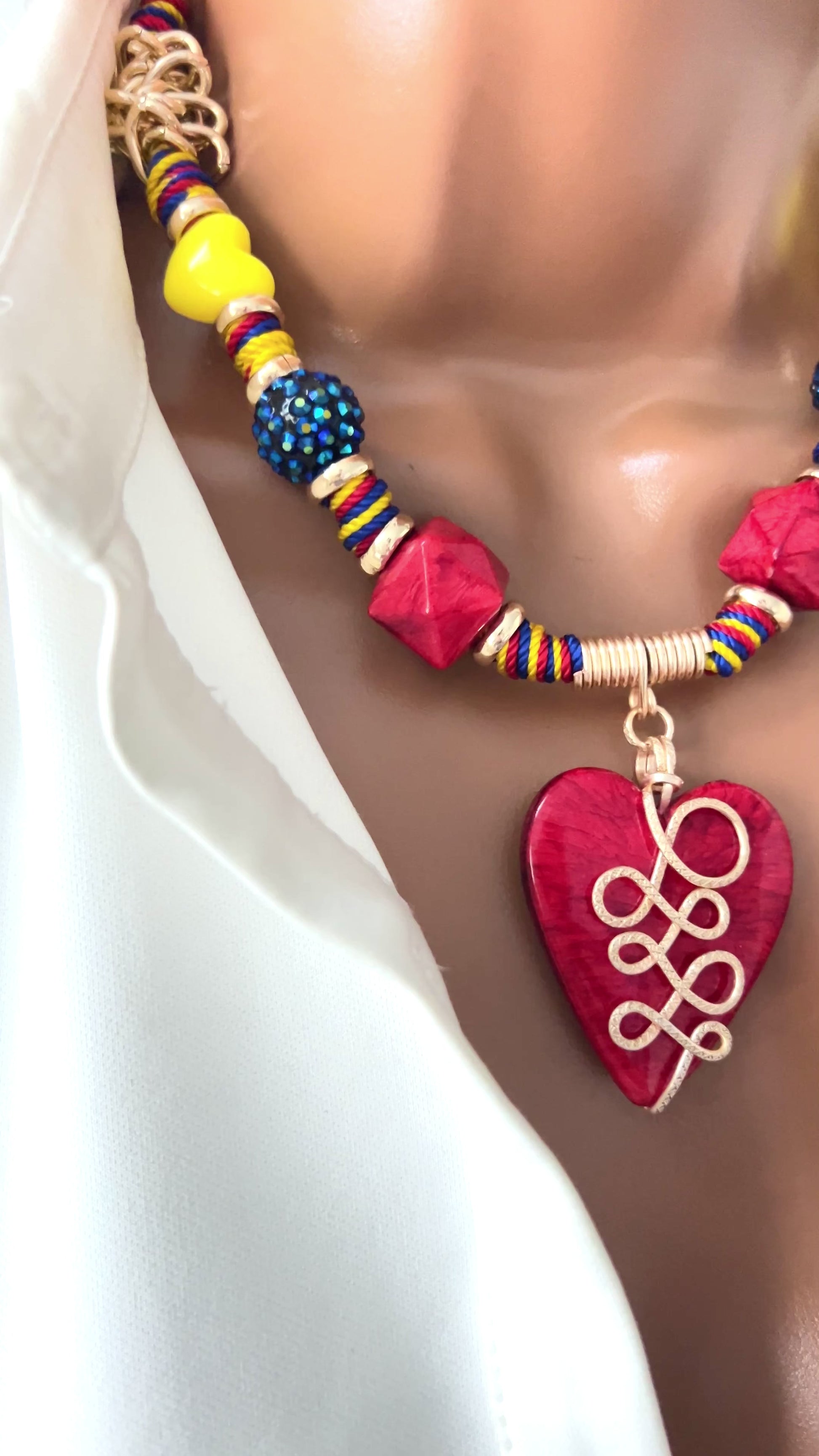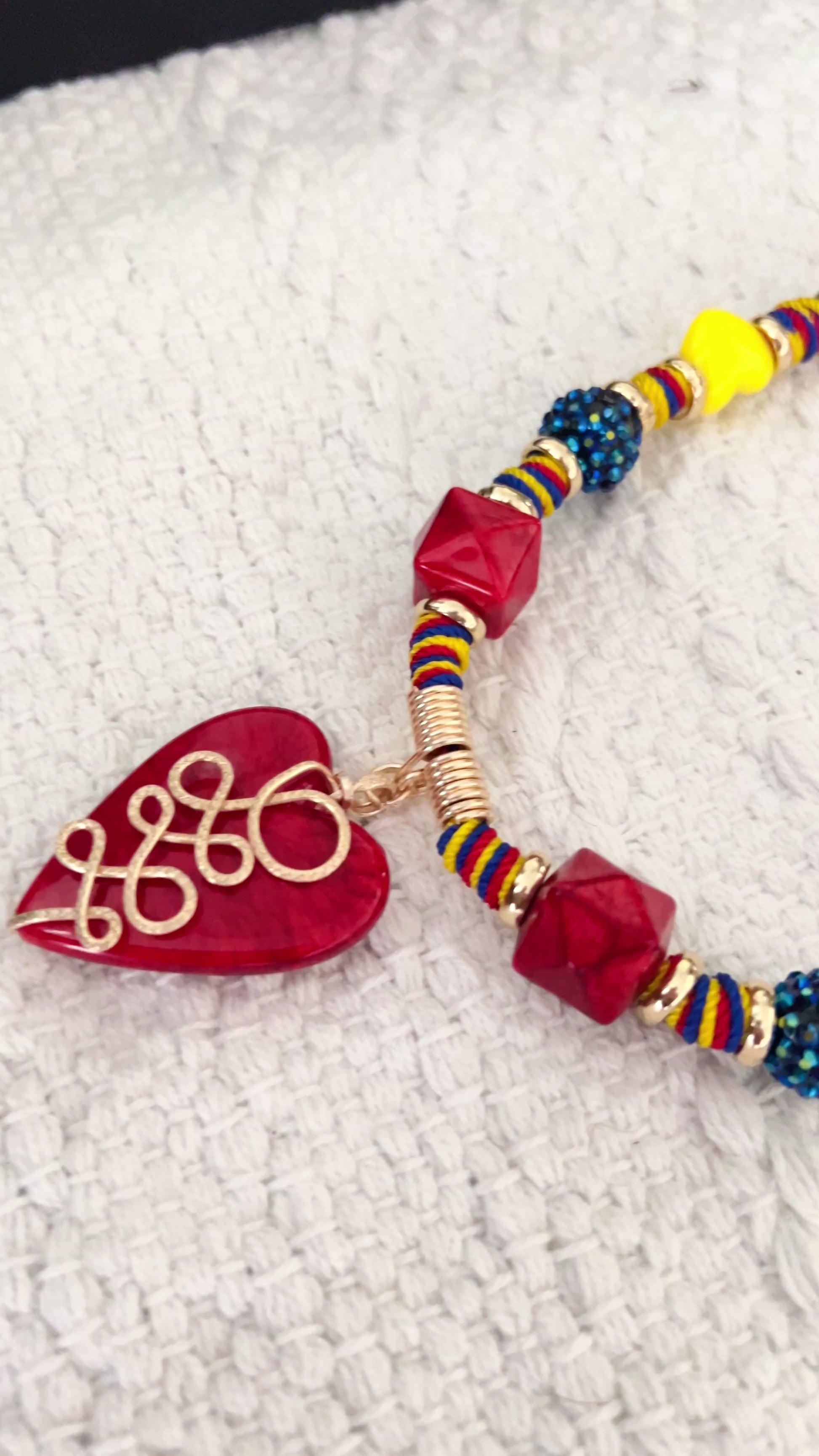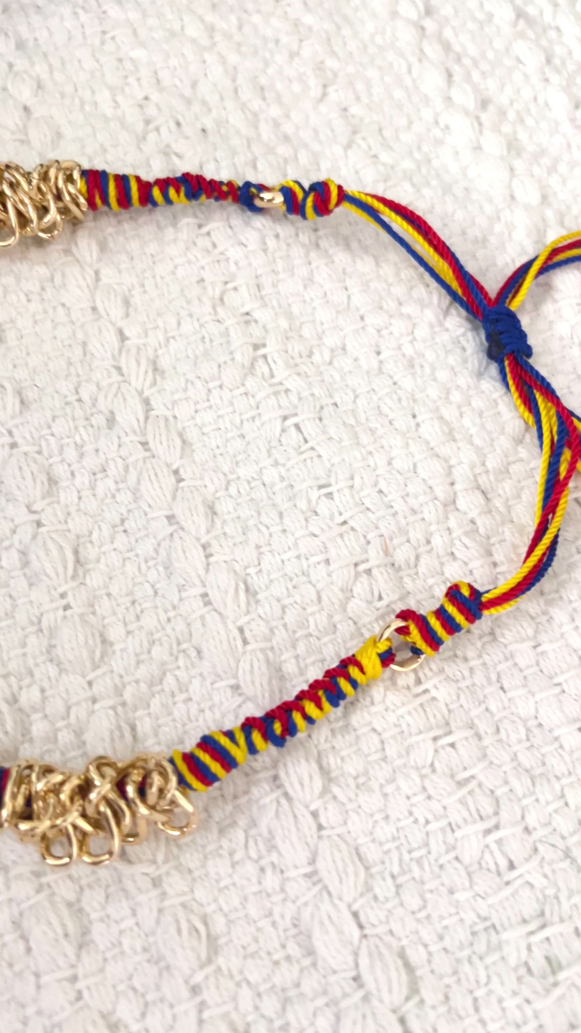 Beautiful necklace inspired by the beautiful country of Venezuela, this necklace is adjustable, braided with details in textured gold plated wire, acrylic charms and rhodium plated chain.