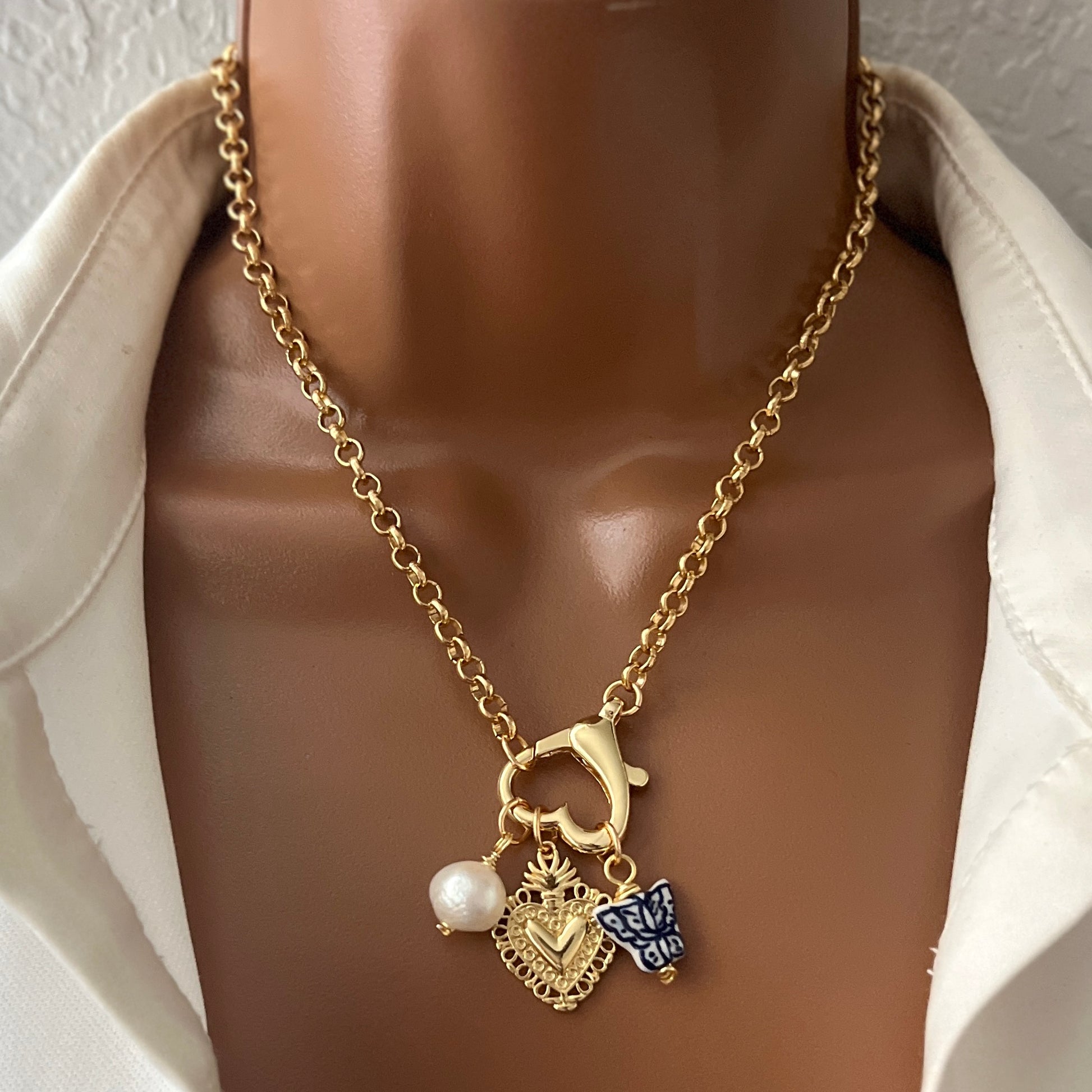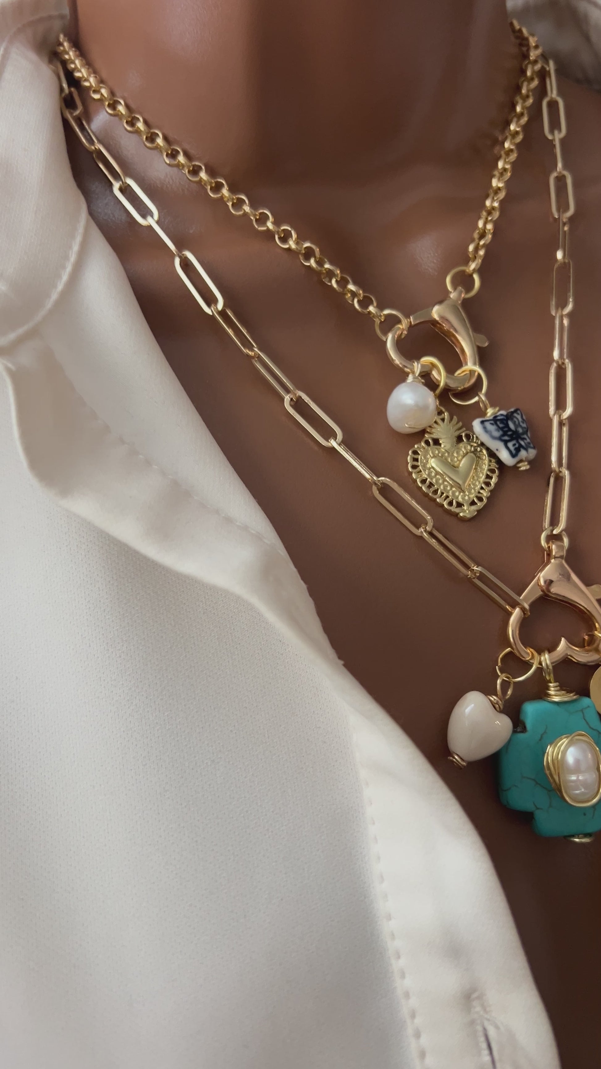 Carabiner necklace, Chunky charm necklace, Custom gold vintage, handmade Christmas gift women, paperclip necklace, pearl pendant