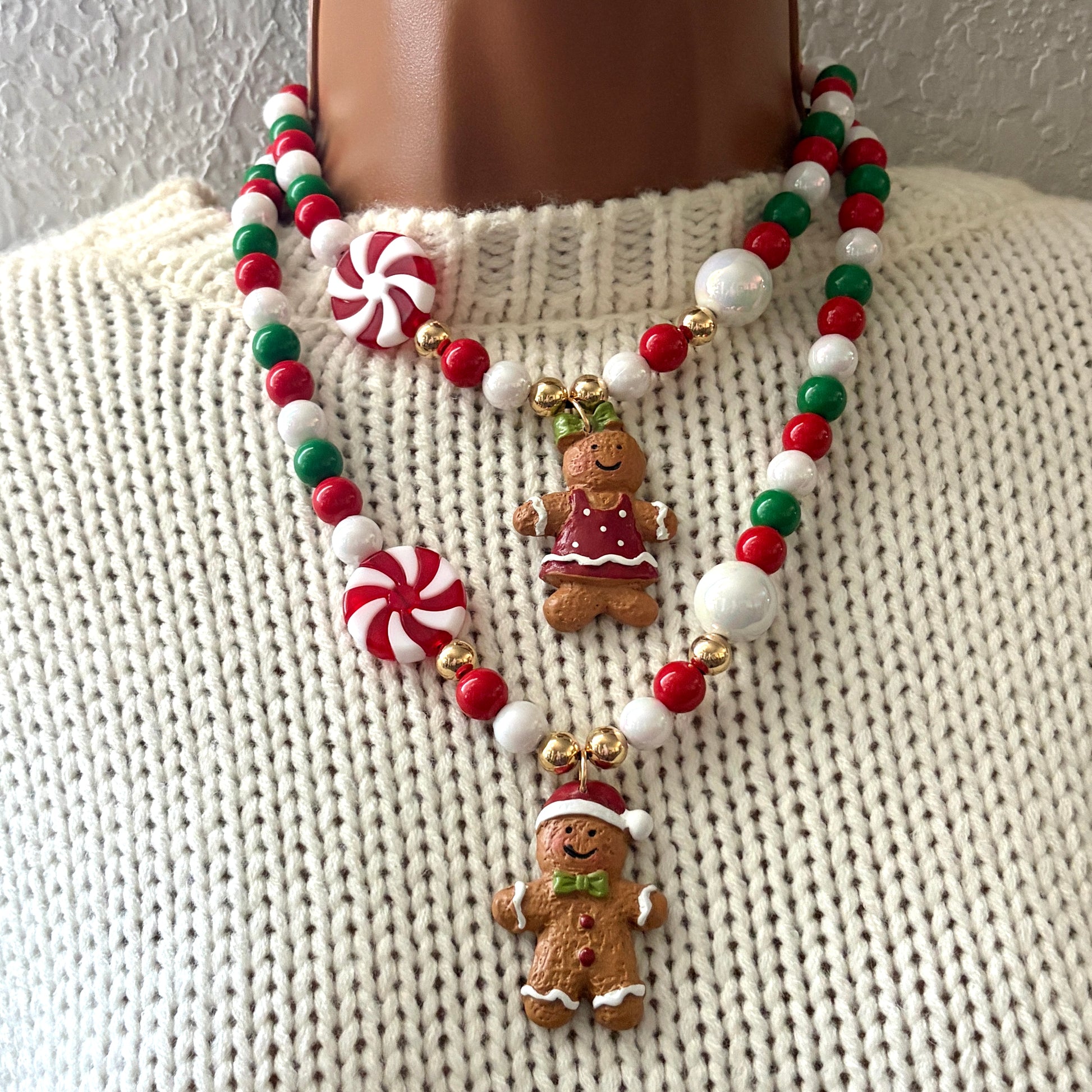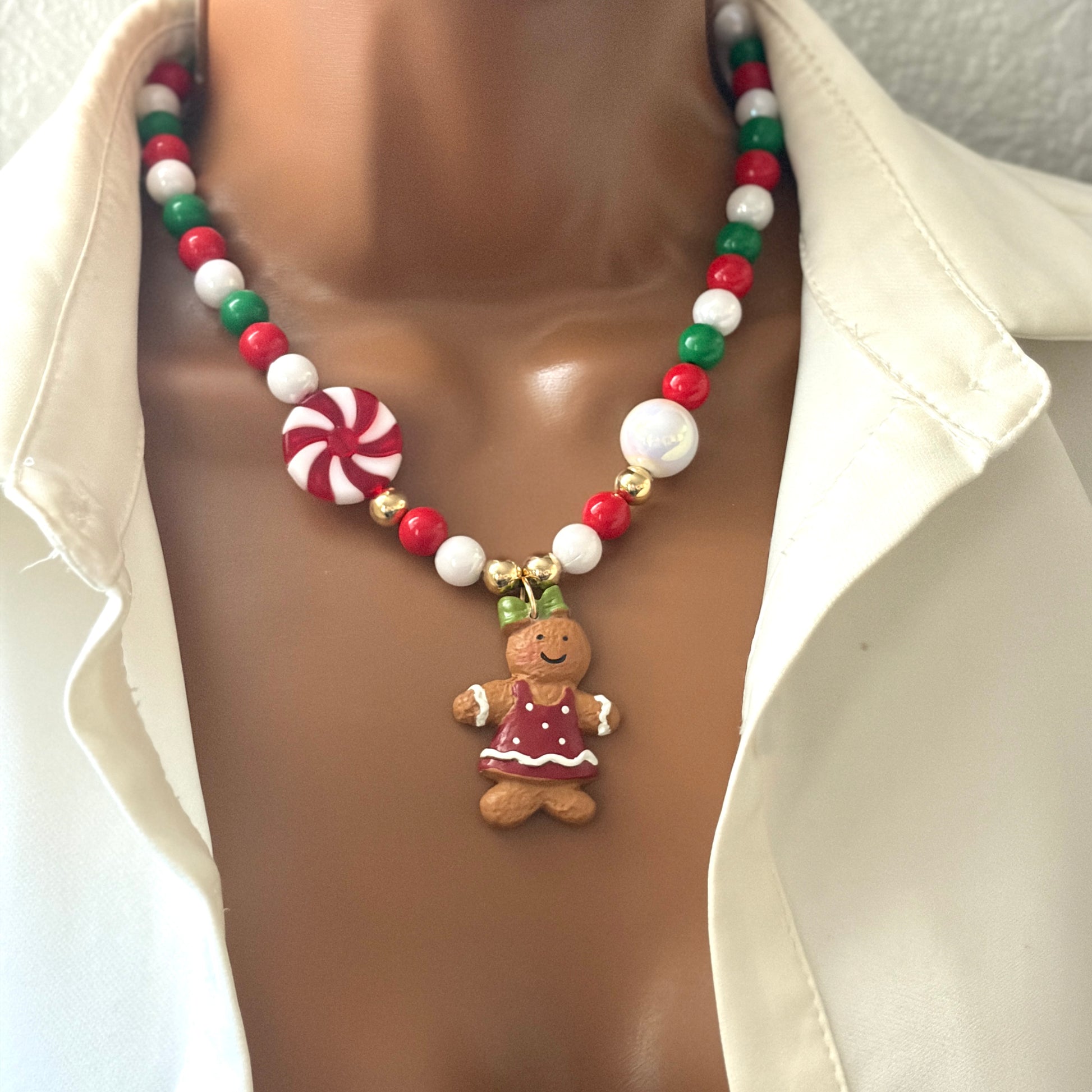 Add a festive touch to your holiday look with this Christmas Gingerbread man charm necklace a fun, bold beaded necklace designed to spread Christmas cheer! Handmade with colorful acrylic beads and an acrylic candy charm, this piece captures the joyful spirit of the season.