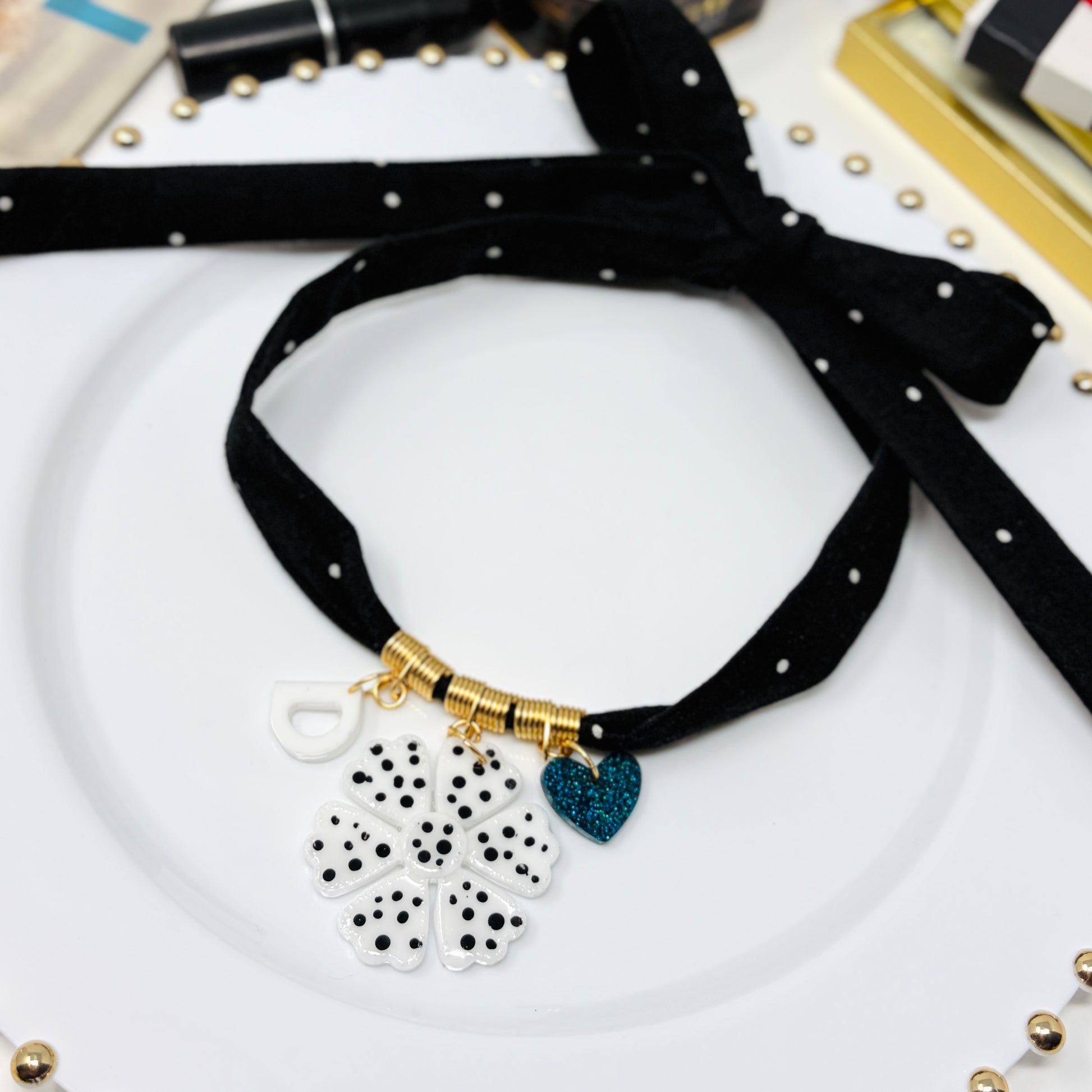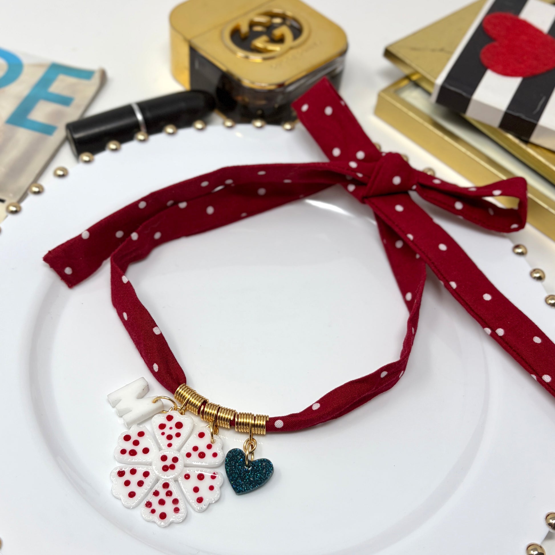 Each Custom Bandana Pendant Necklace is lovingly handmade and one-of-a-kind. Each necklace comes with a polka dot flower resin charm and a heart resin charm; the customer must choose the letter they want. It’s perfect for adding a creative twist to your everyday outfits or giving as a thoughtful gift.