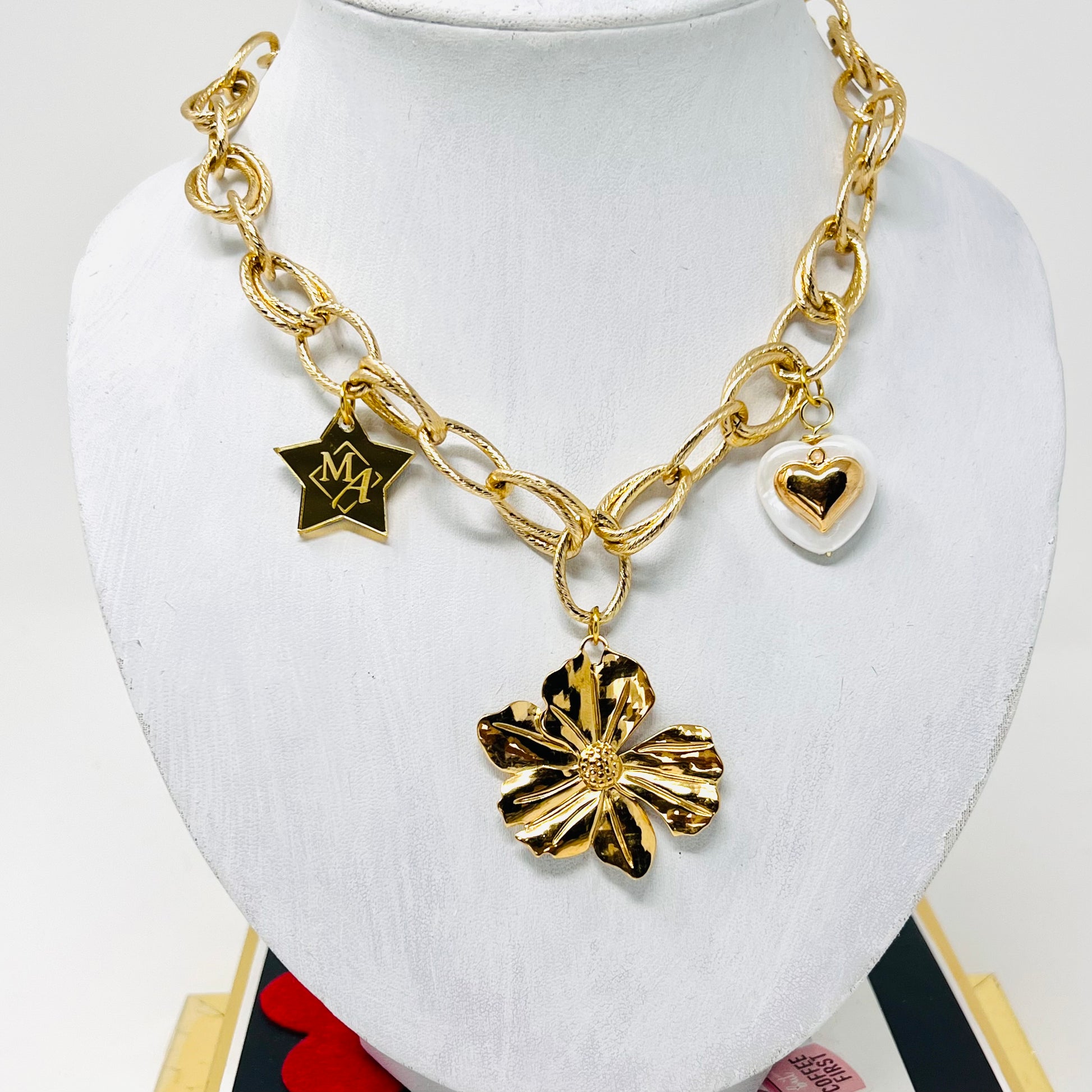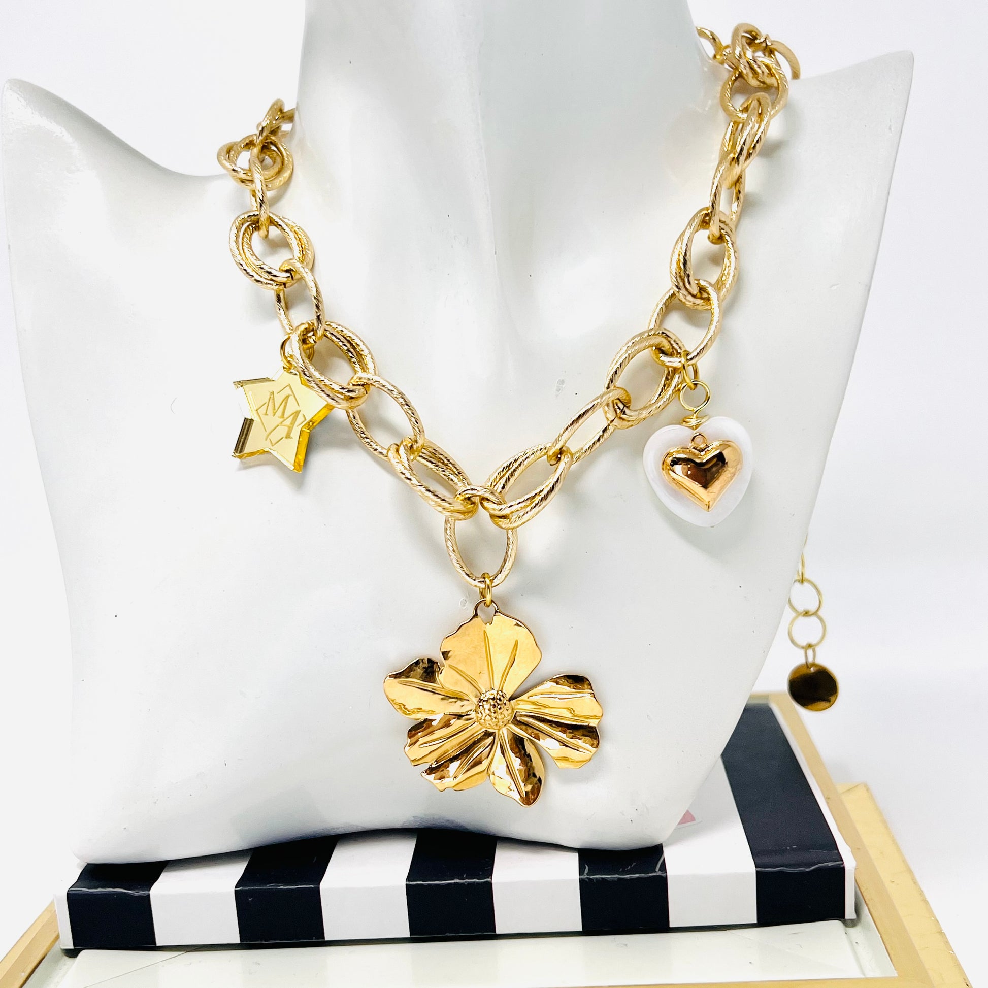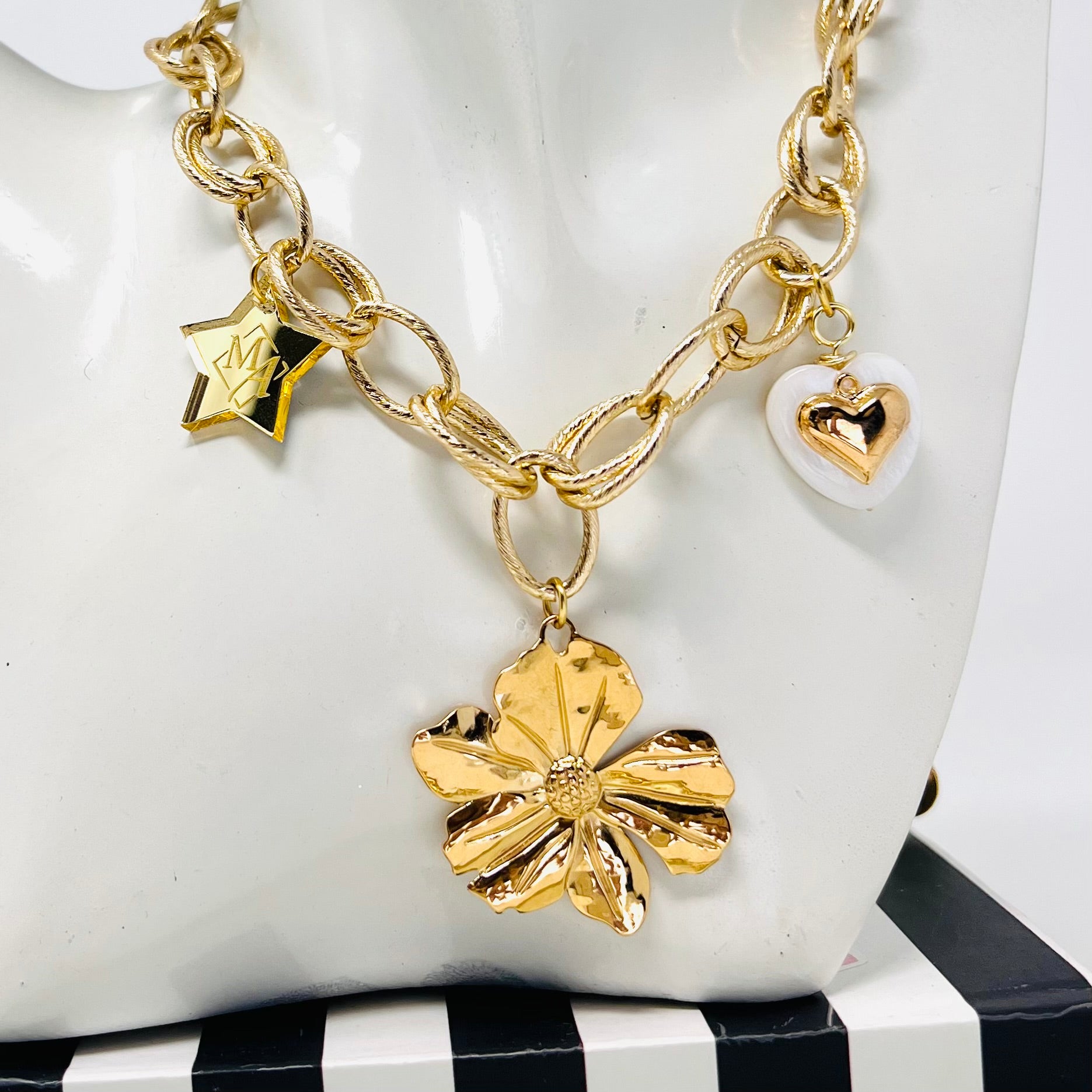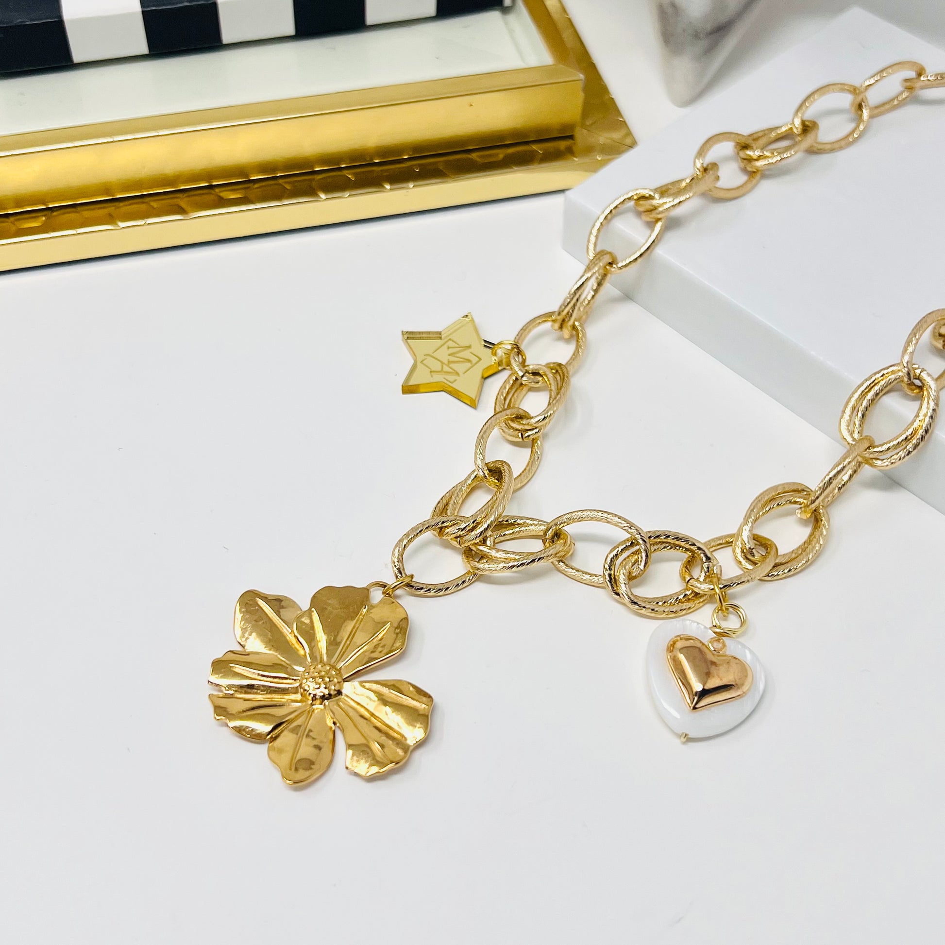Beautiful handmade gold-plated flower, heart, and pearl charm necklace. This necklace is perfect to combine with other necklaces or wear alone, an excellent gift idea for women, sisters, friends, girlfriends, wives, or coworkers.