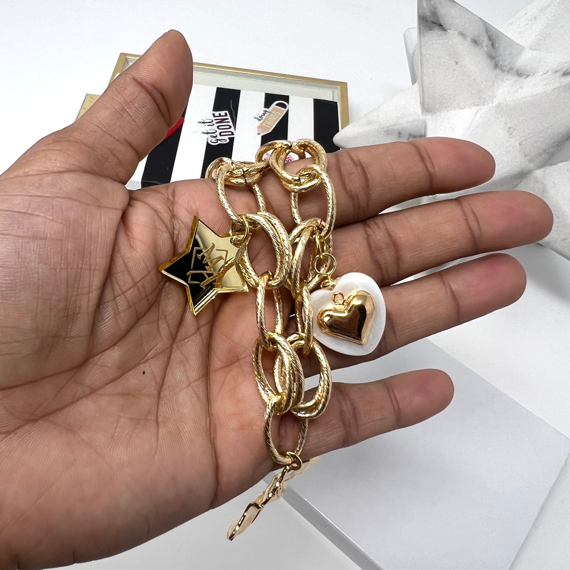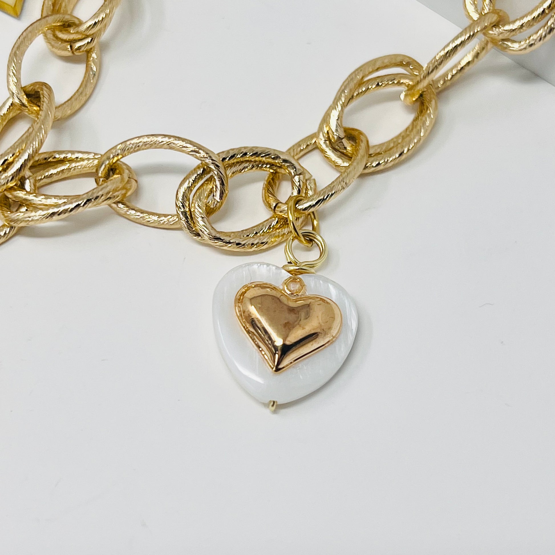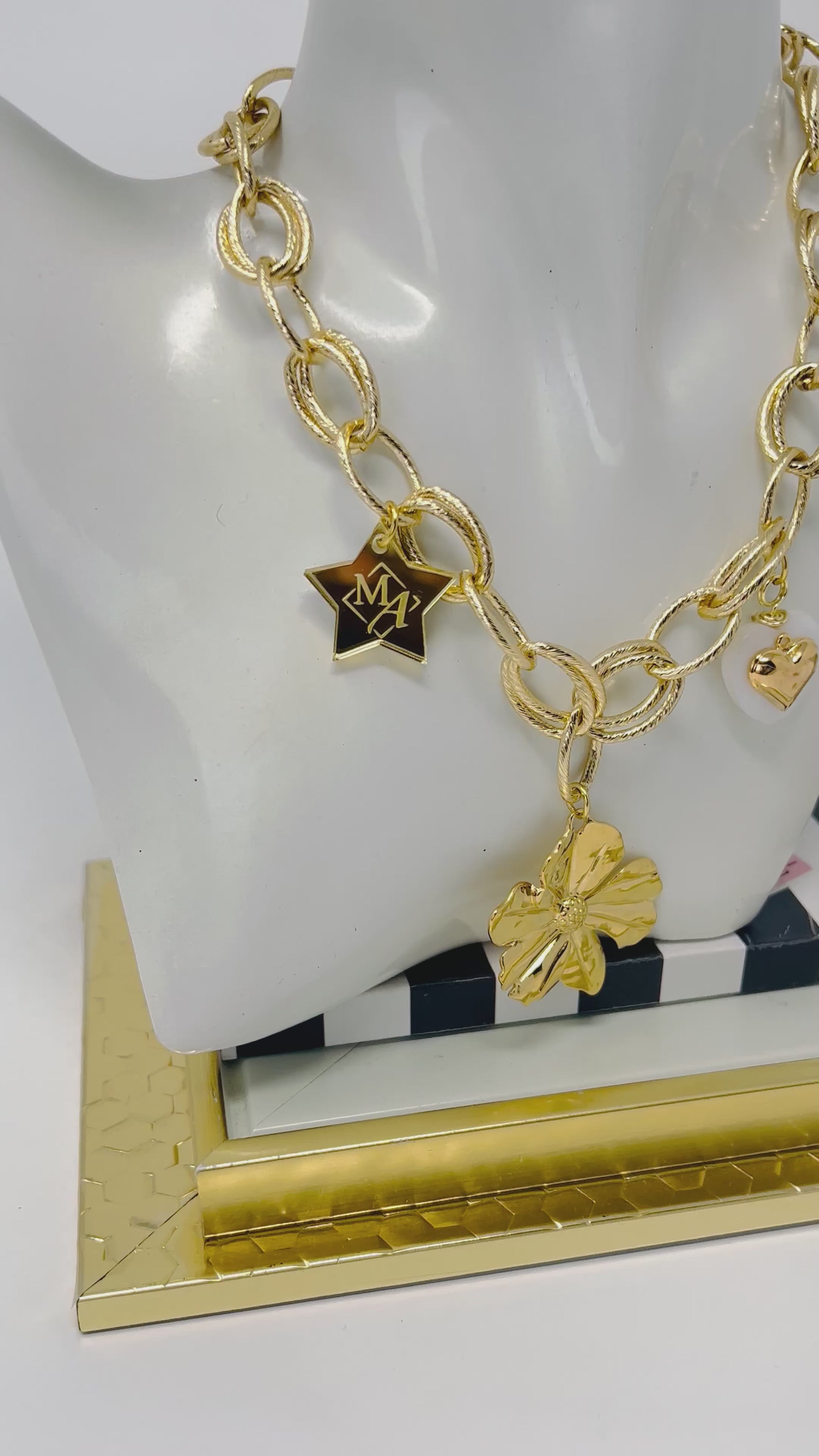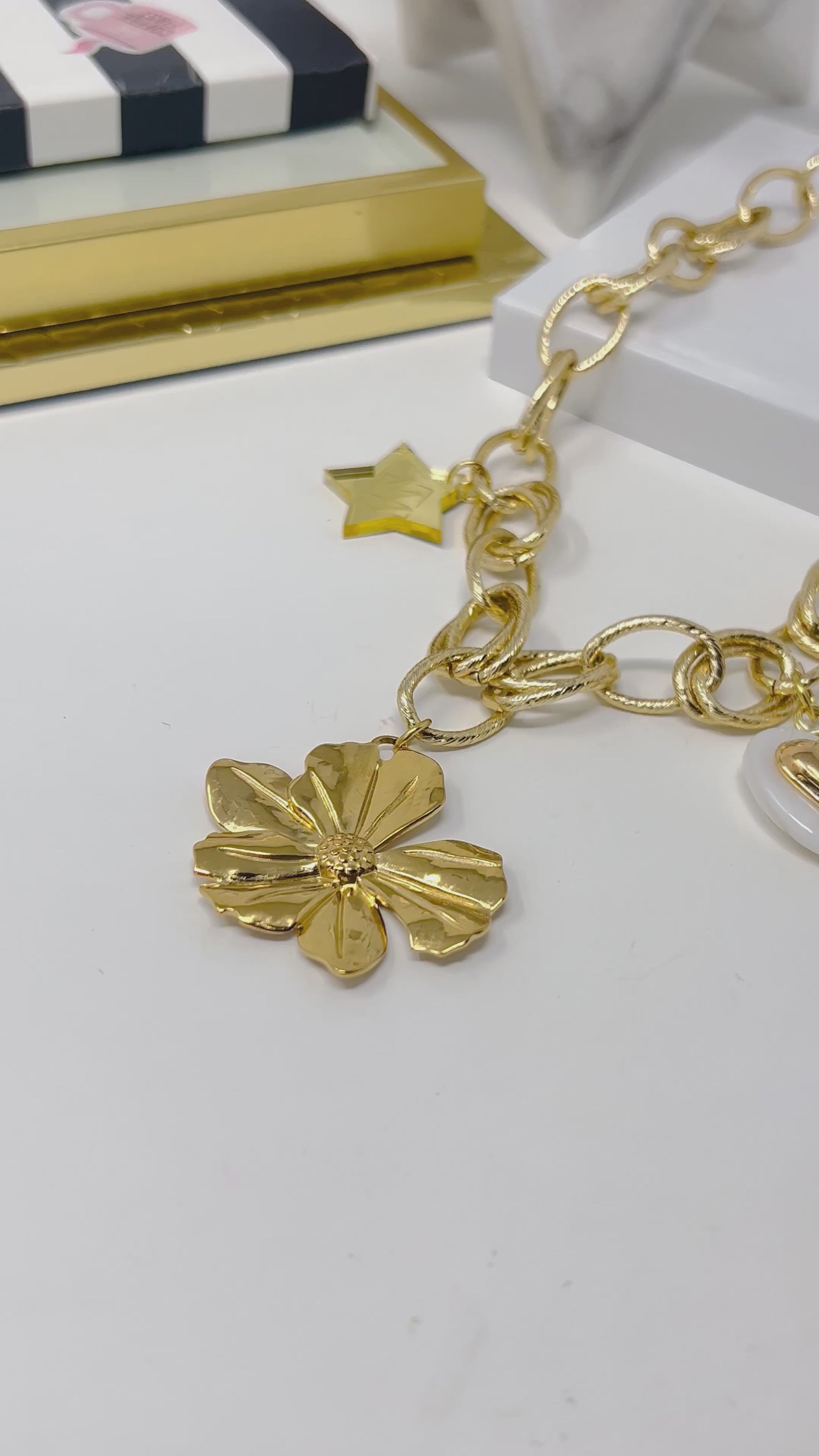 Beautiful handmade gold-plated flower, heart, and pearl charm necklace. This necklace is perfect to combine with other necklaces or wear alone, an excellent gift idea for women, sisters, friends, girlfriends, wives, or coworkers.
