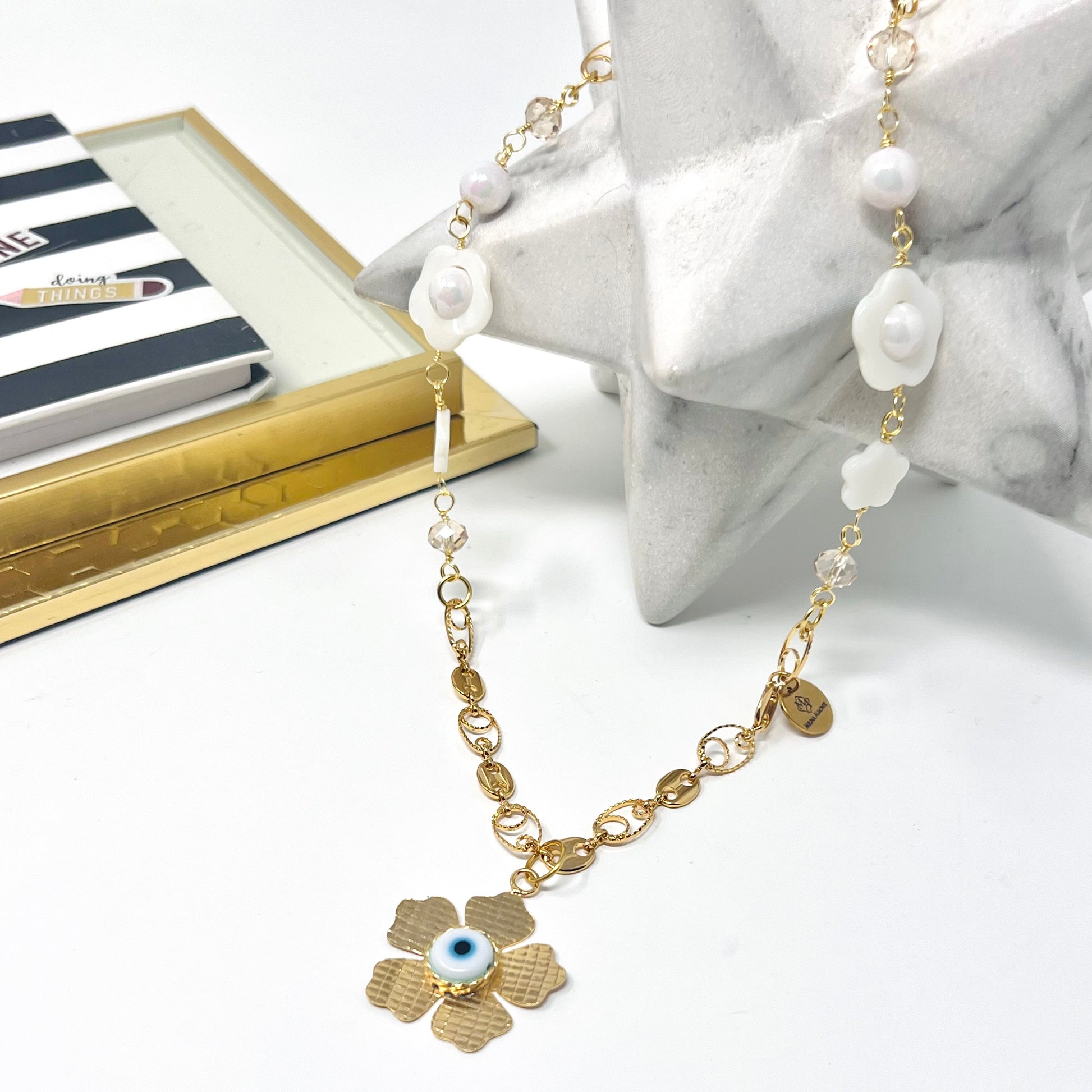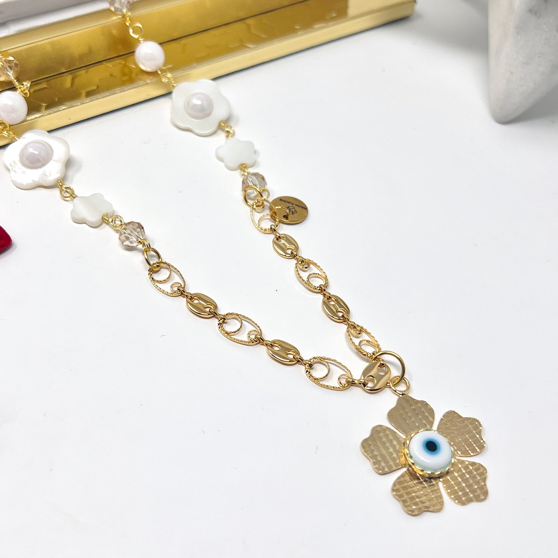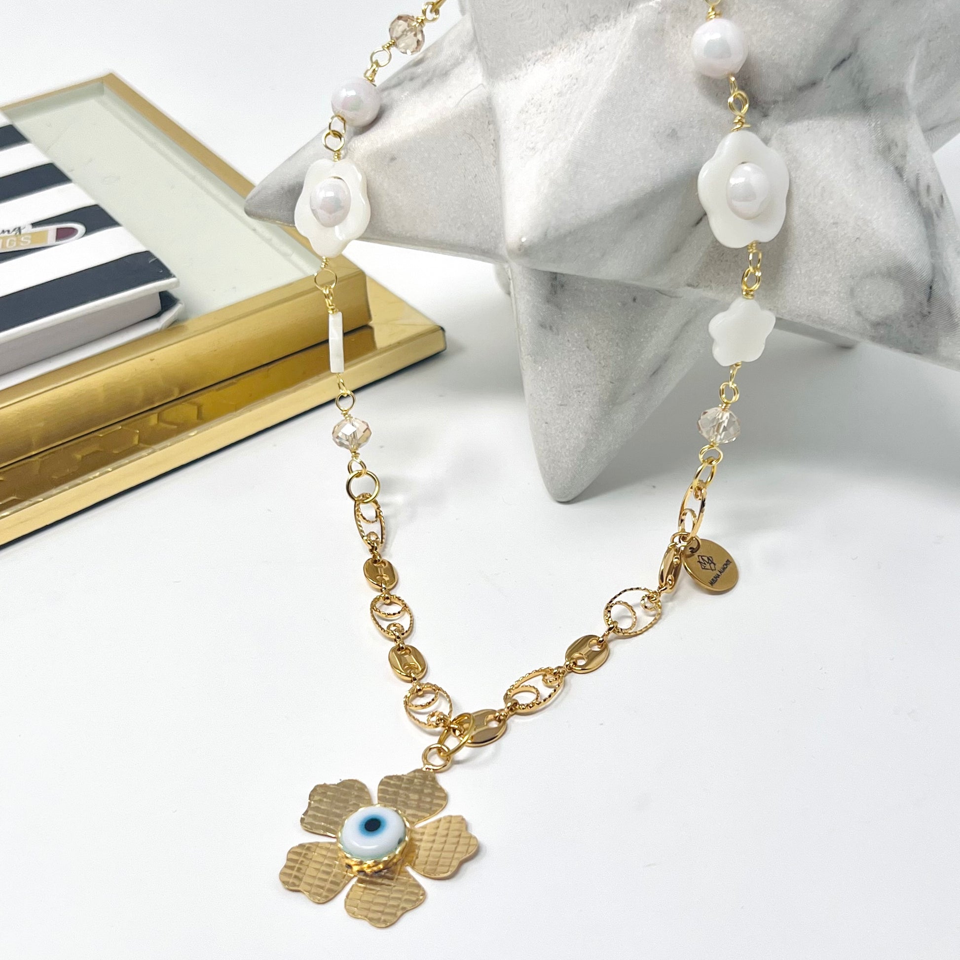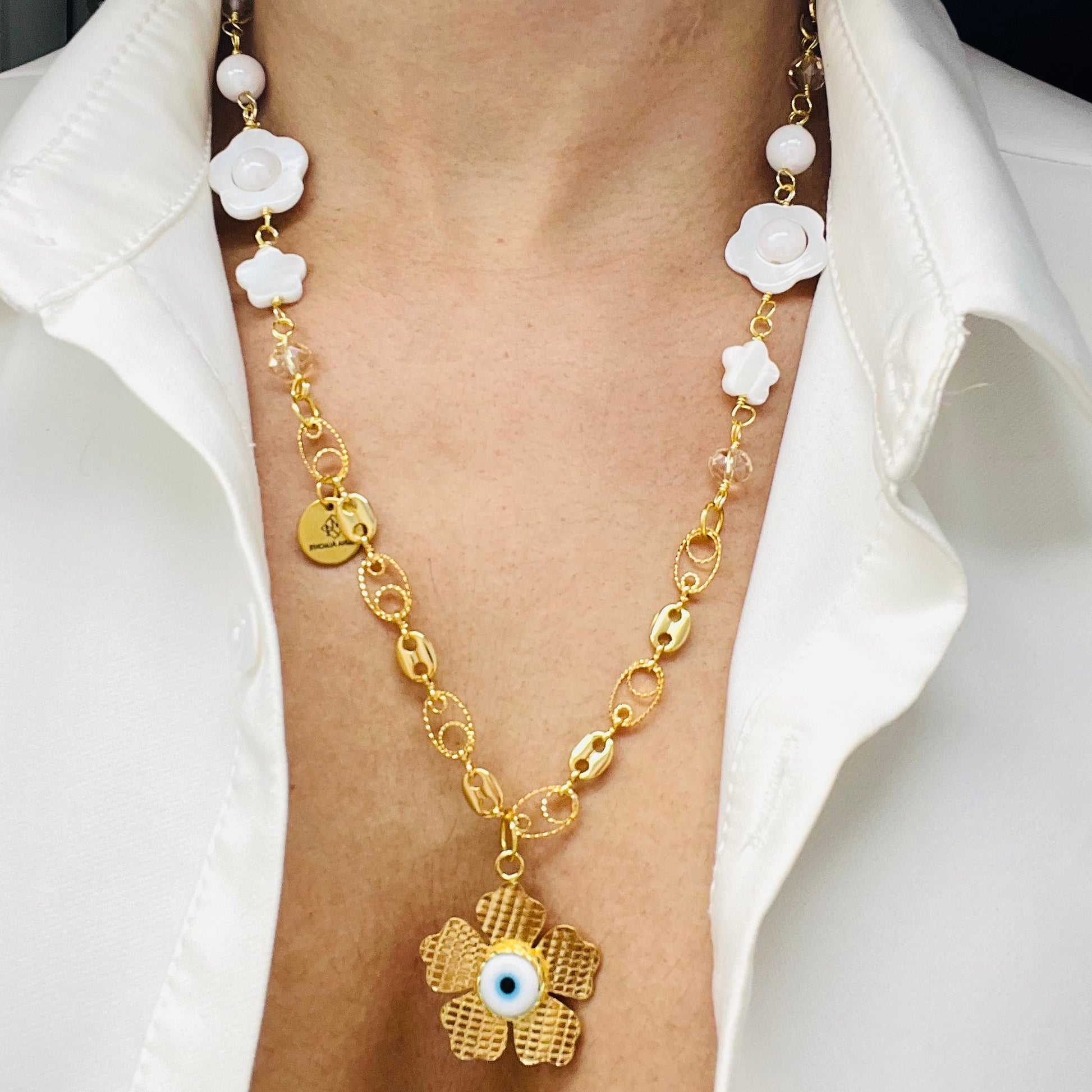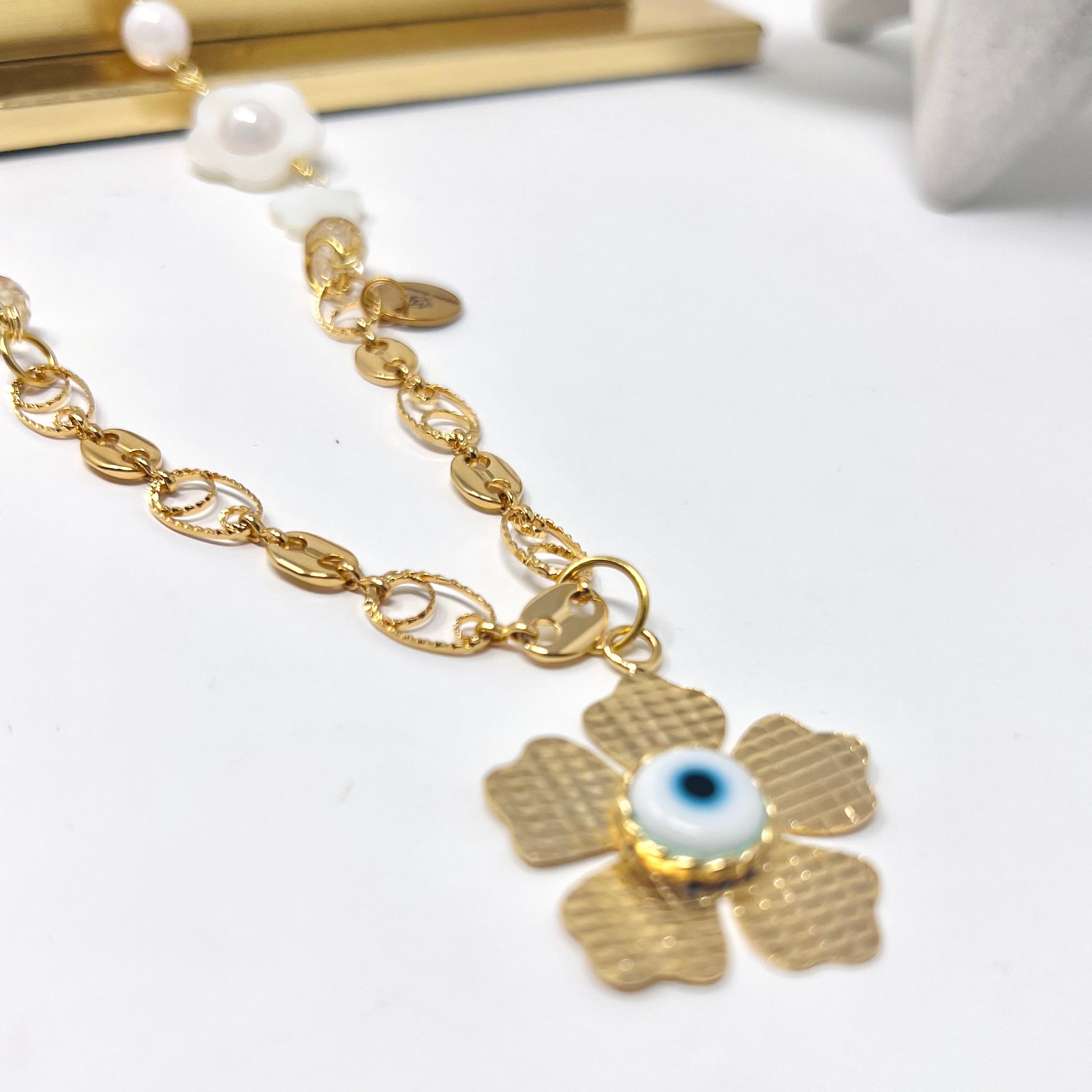 The handmade necklace with gold-plated chain has a mother-of-pearl shell and a gold-plated flower pendant with a protective eye, the length of the chain is 23 inches and can be adjusted to shorter or longer