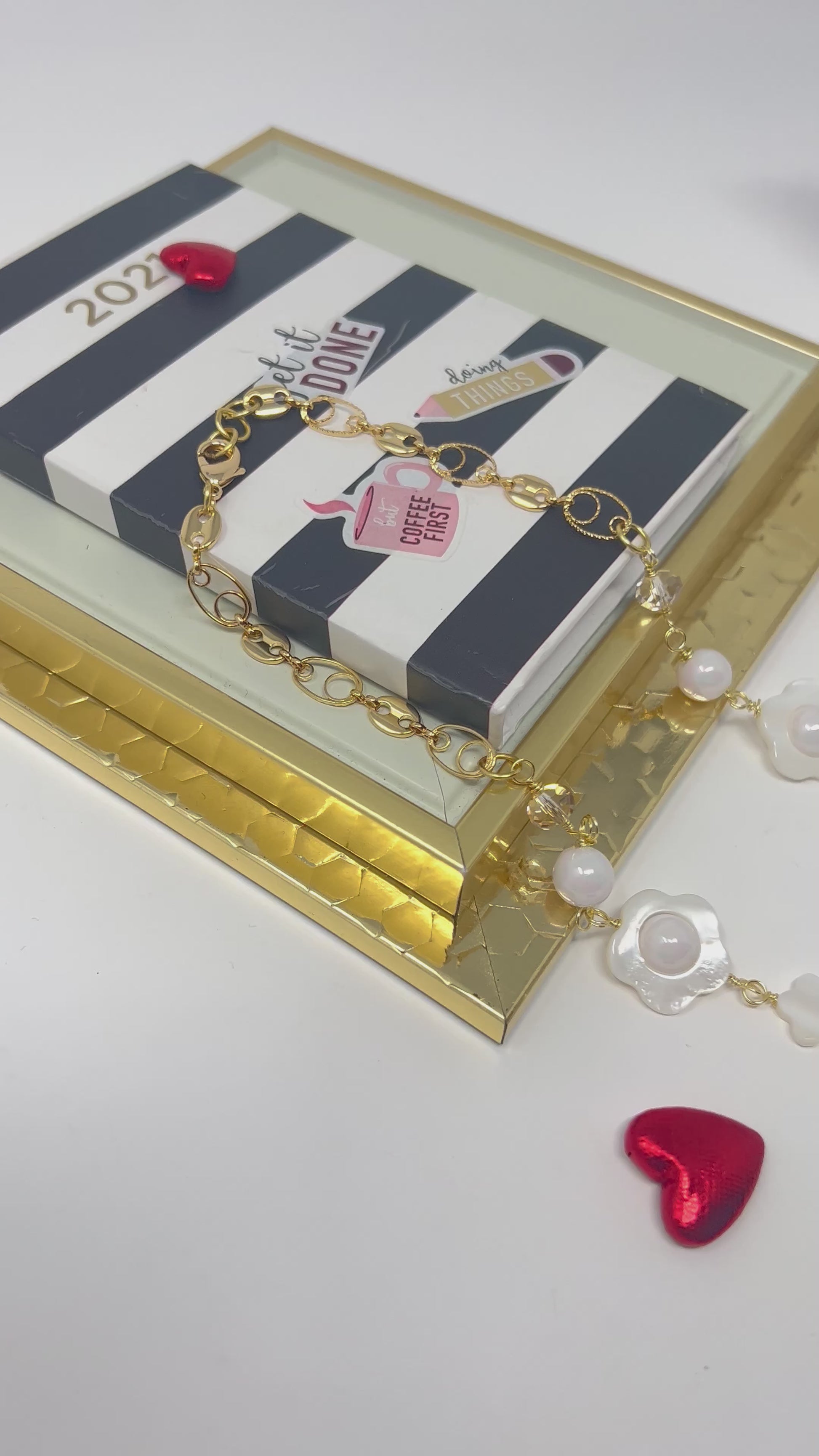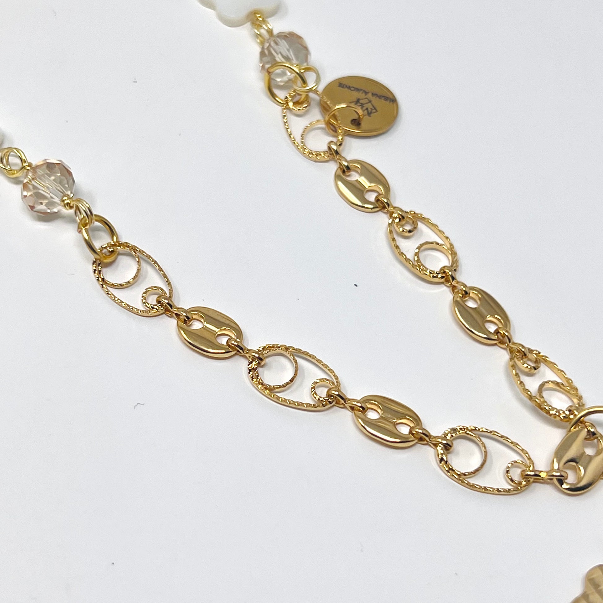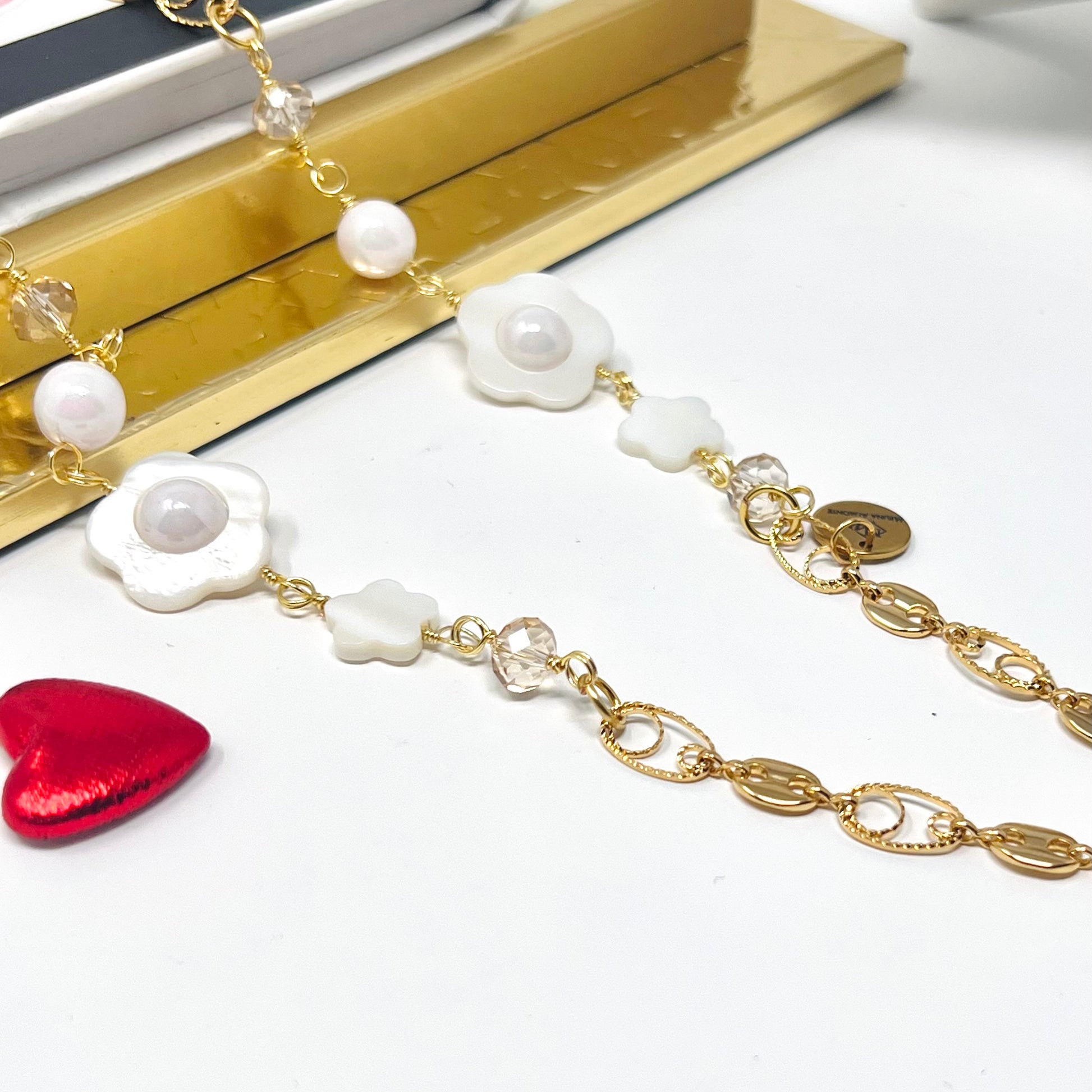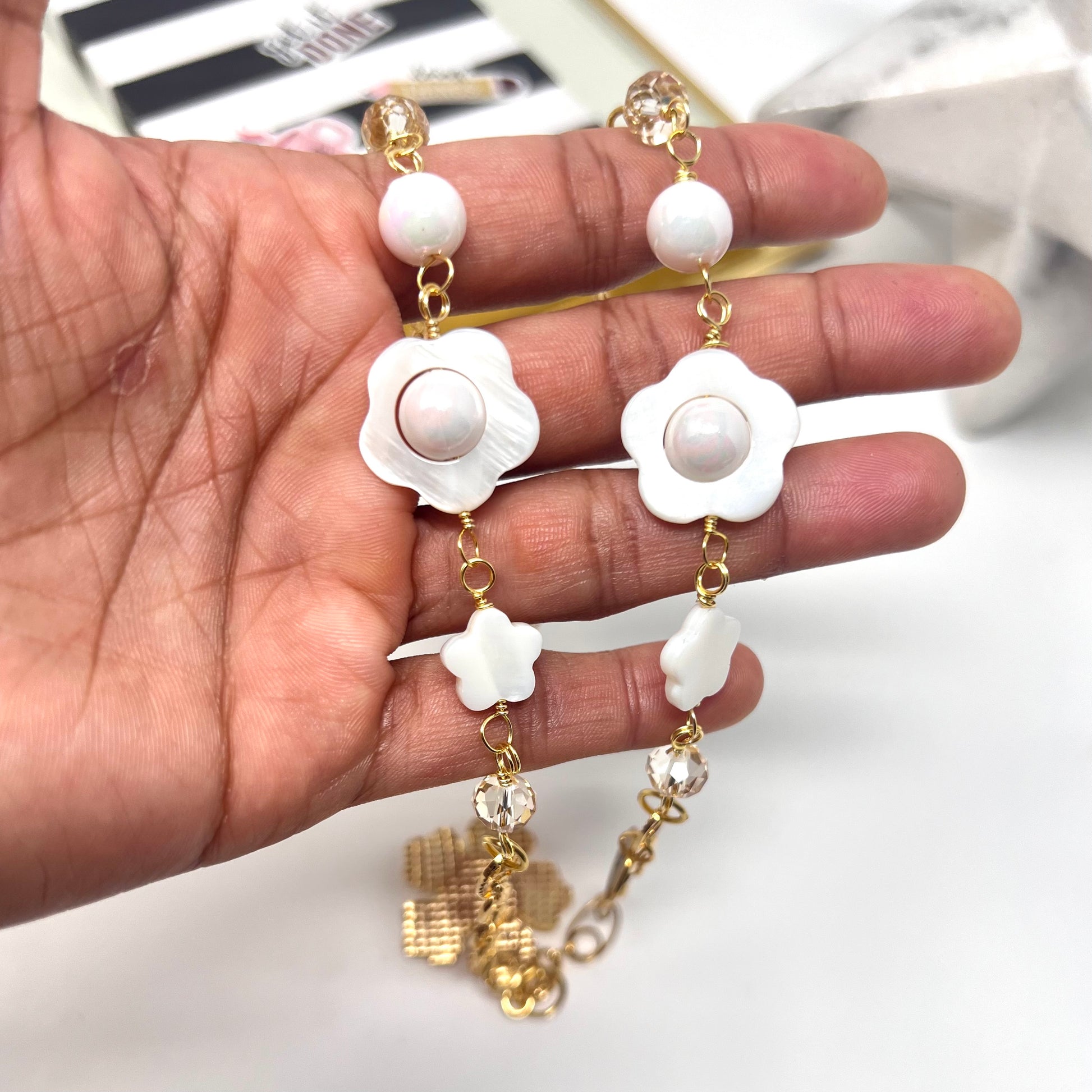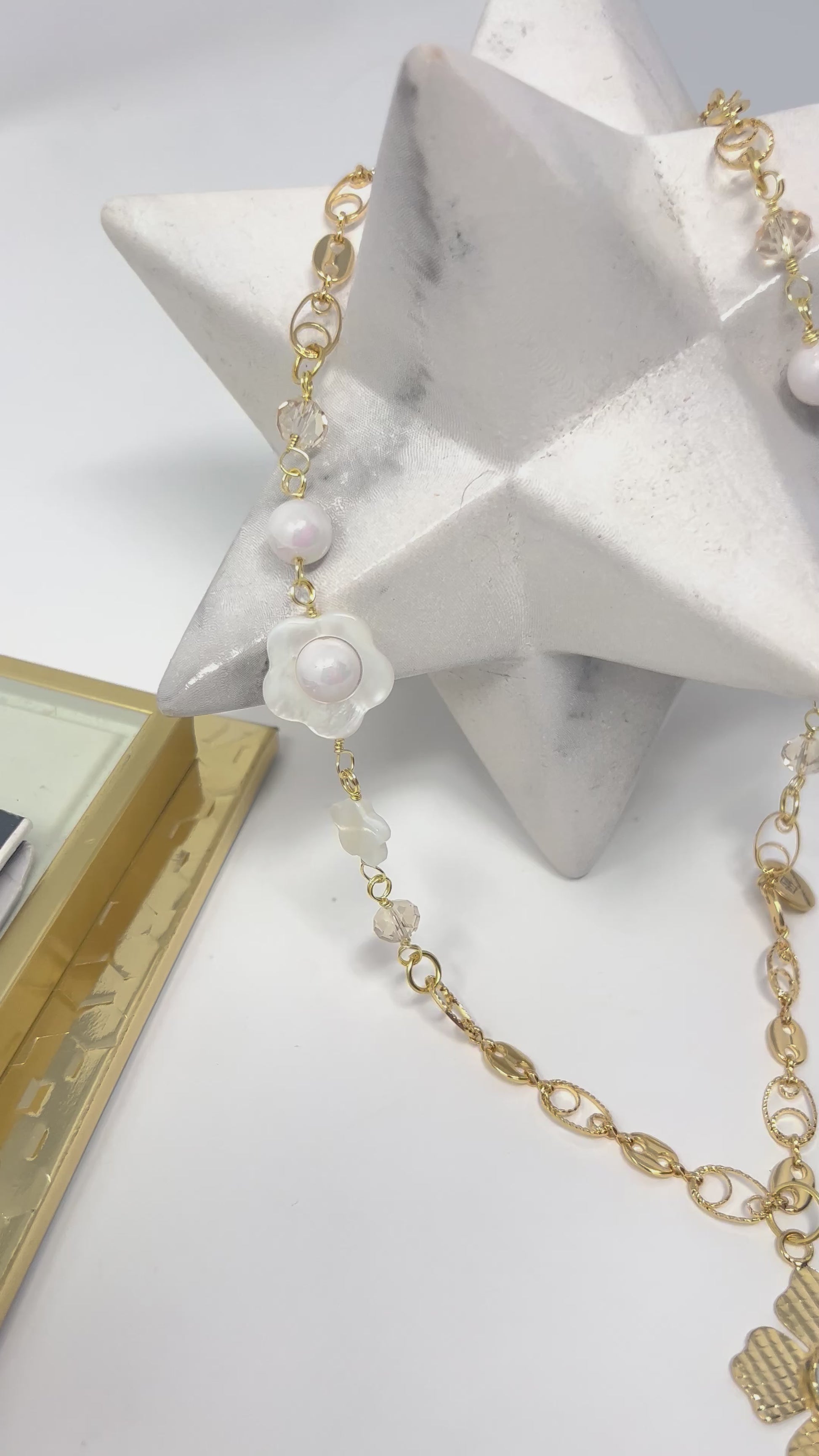 The handmade necklace with gold-plated chain has a mother-of-pearl shell and a gold-plated flower pendant with a protective eye, the length of the chain is 23 inches and can be adjusted to shorter or longer