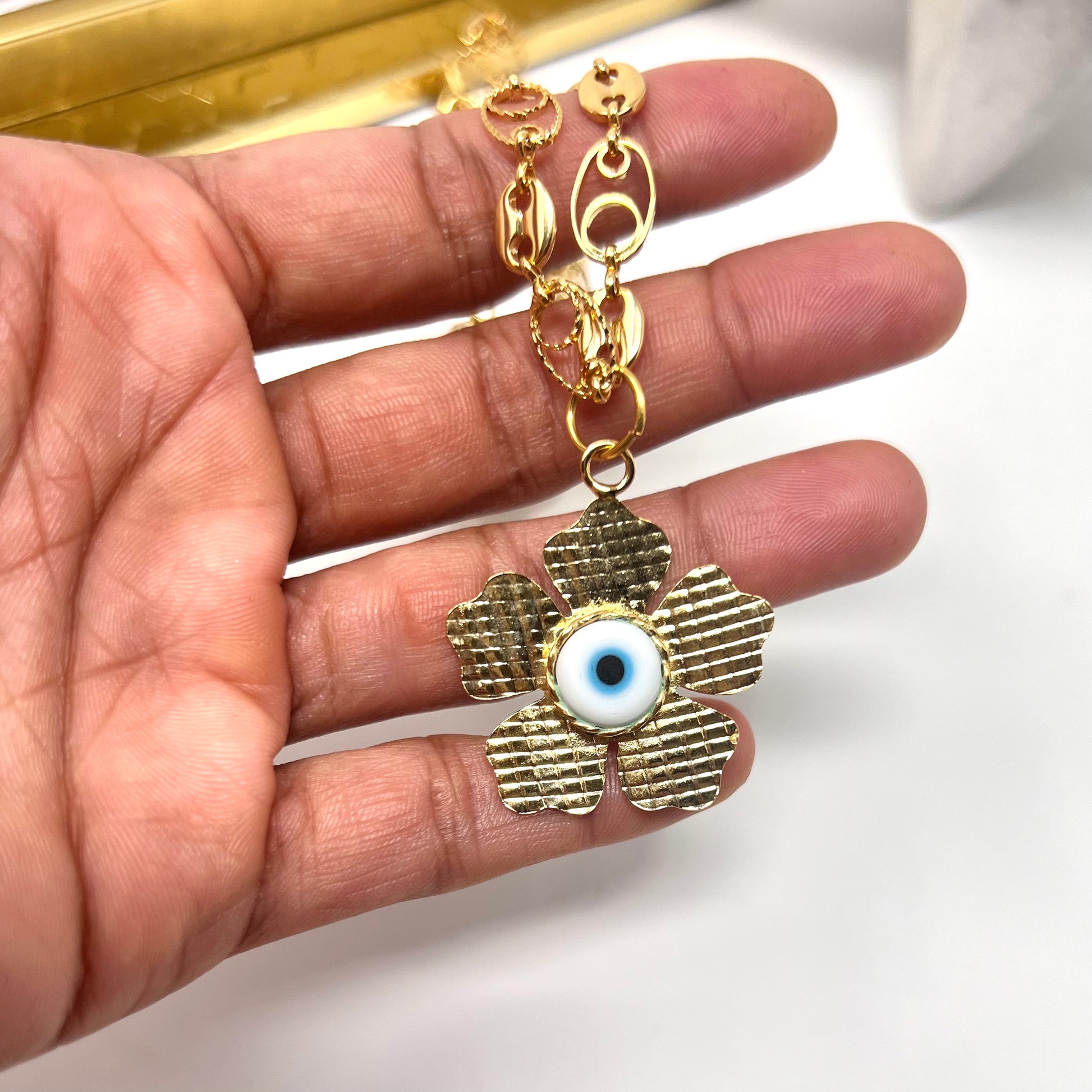 Gold plated necklace with flower evil eyes pendant, handmade gold chain necklace for women
