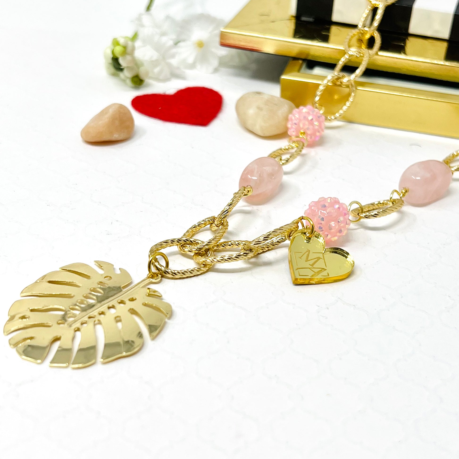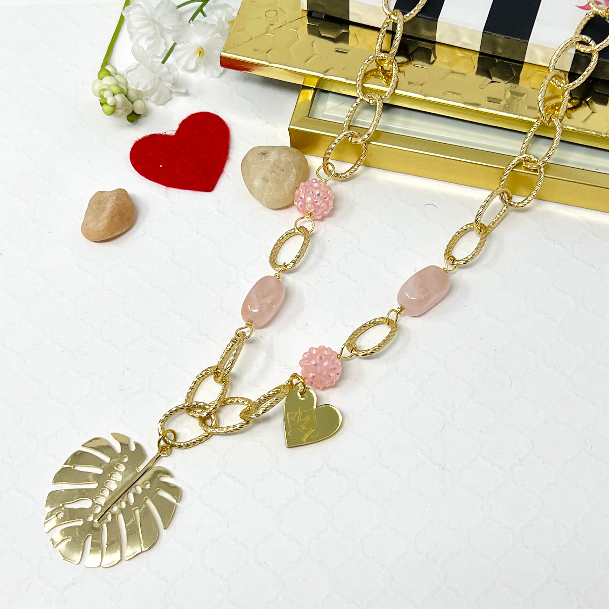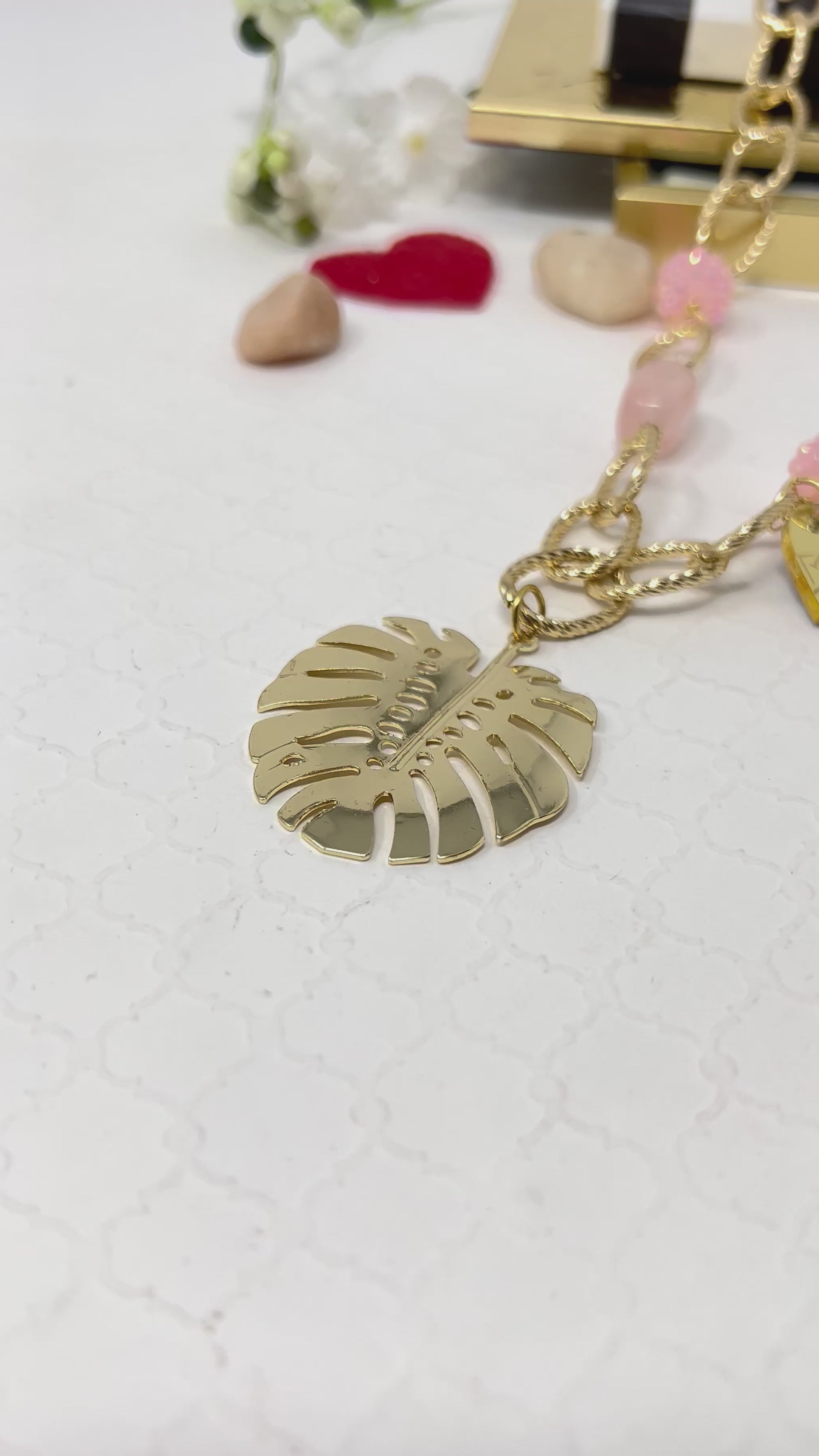 Golden Link Chain Necklace with Natural Pink Stone and Monstera Leaf Gold Plated Pendant.