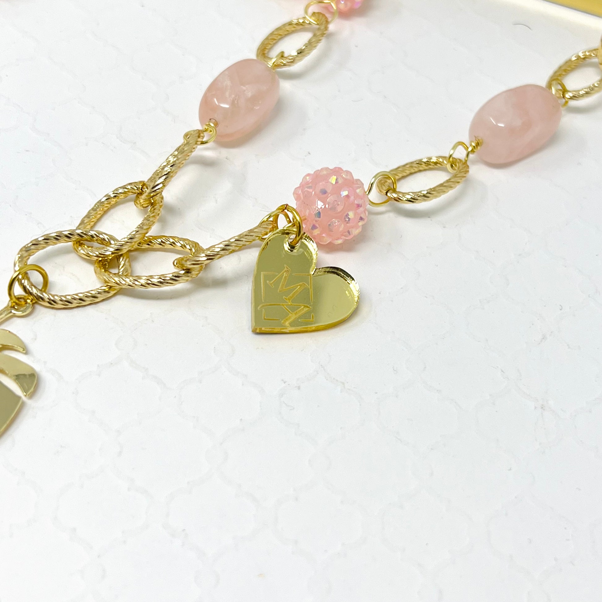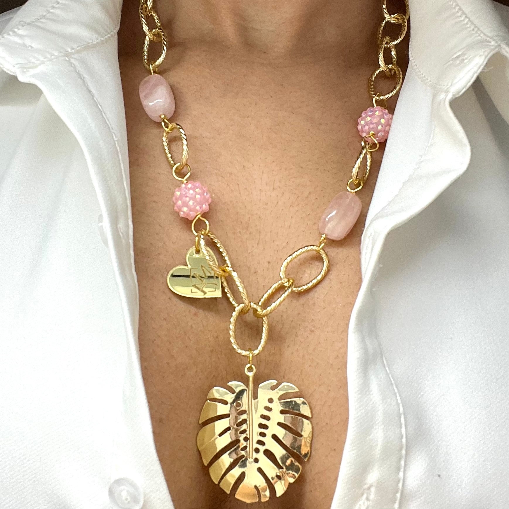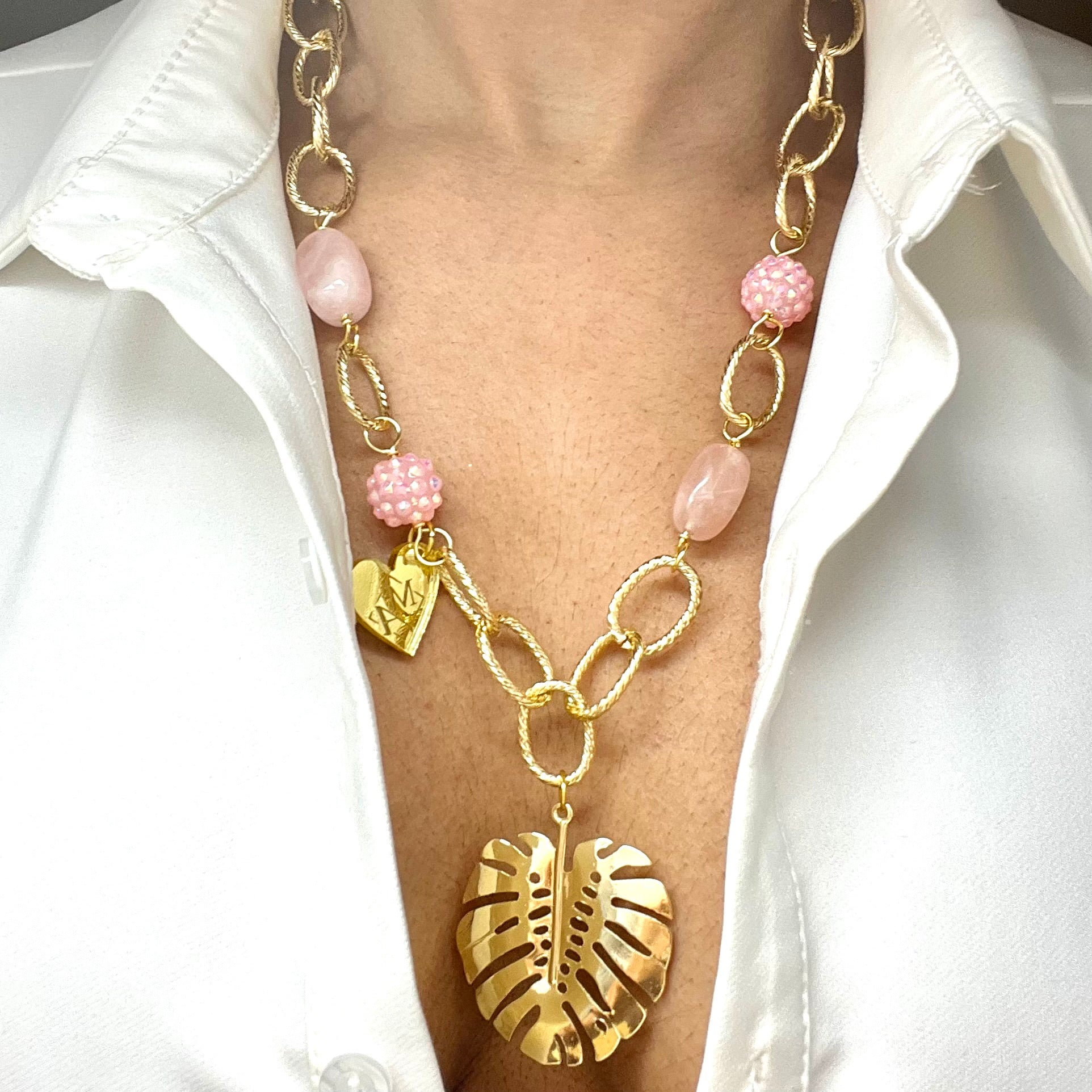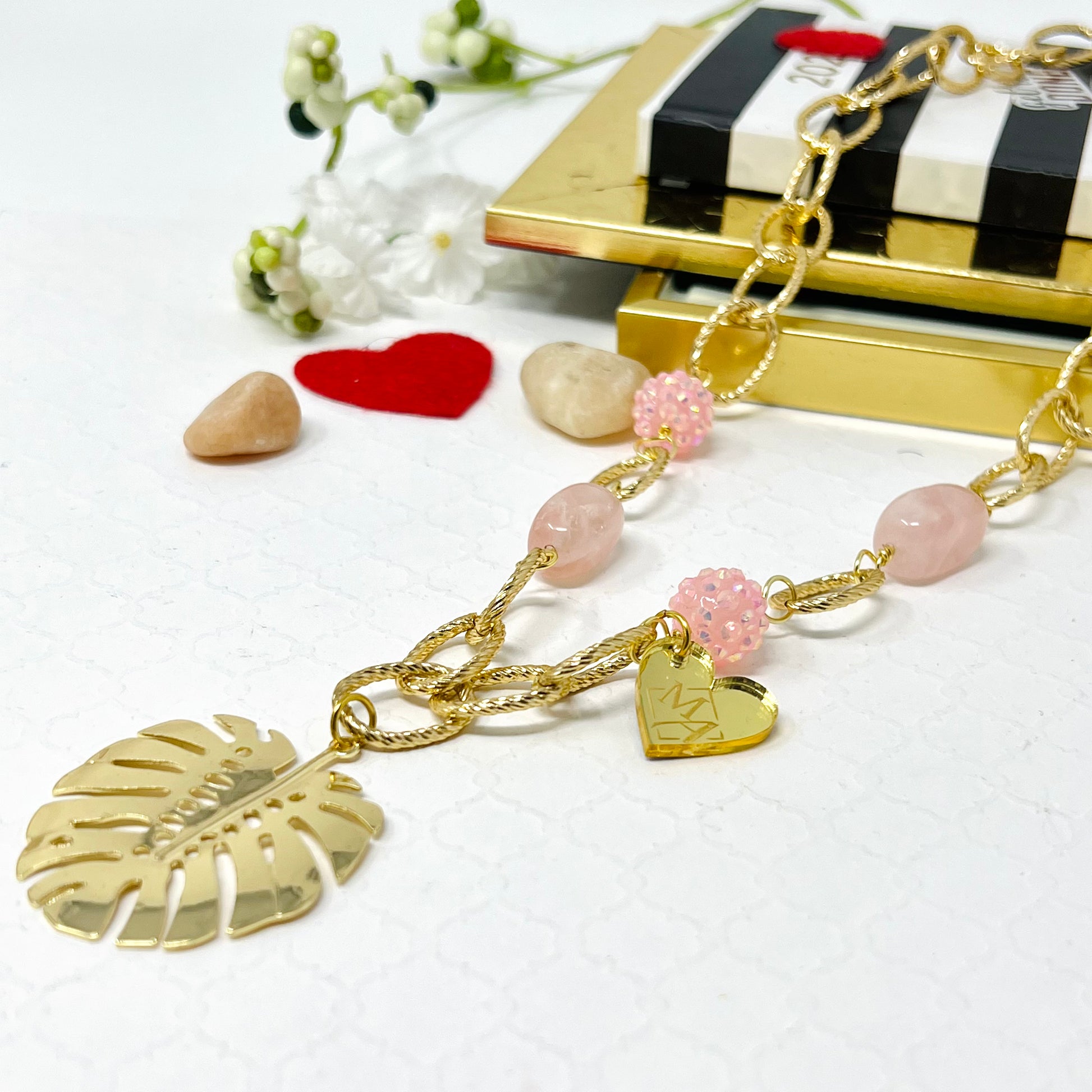 Golden Link Chain Necklace with Natural Pink Stone and Monstera Leaf Gold Plated Pendant.