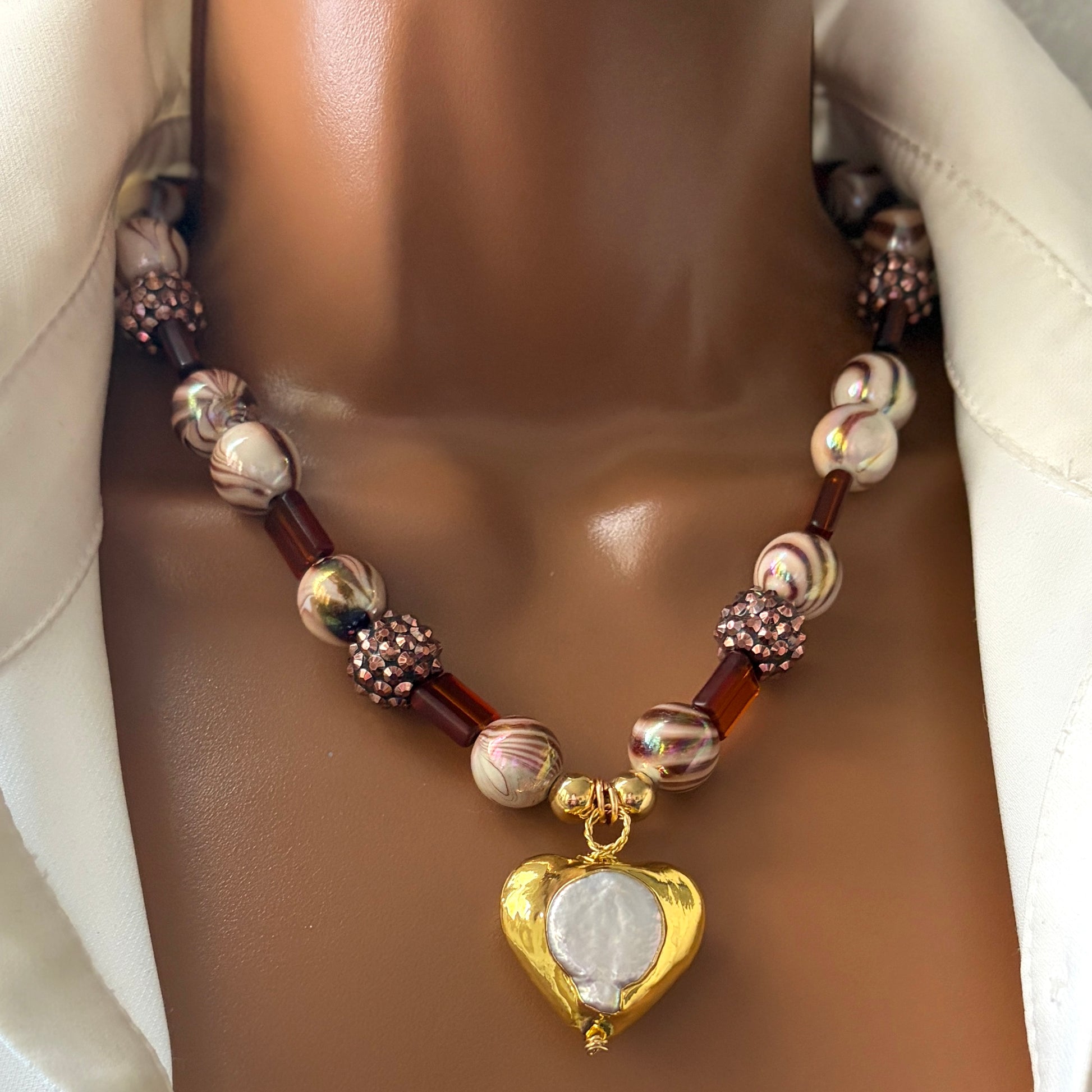 This handmade necklace with autumn colored beads features chunky beads and an elegant, gold-plated heart charm with a natural pearl for a chic, modern look. The adjustable design allows you to wear it at your desired length, making it perfect for layering or as a standalone statement piece. Lightweight and versatile, this necklace adds a touch of boho elegance and style to any outfit, making it ideal for everyday wear or special occasions.