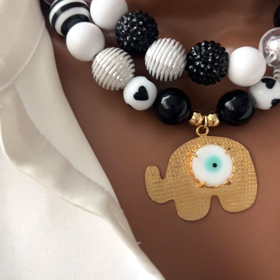 Handmade Layered Beaded Necklace with Gold Plated Elephant Charms – Adjustable Two-Strand Chunky Beads Jewelry