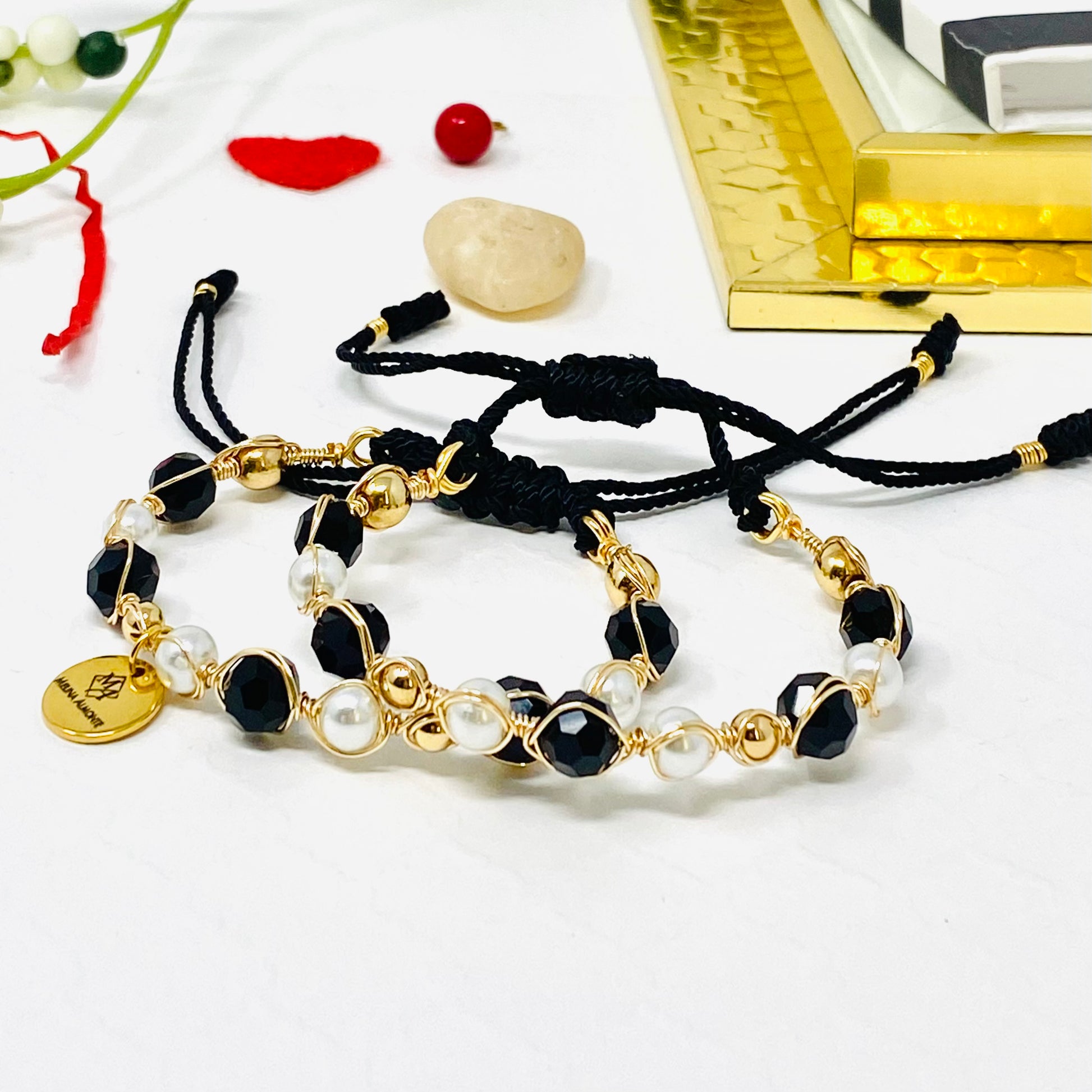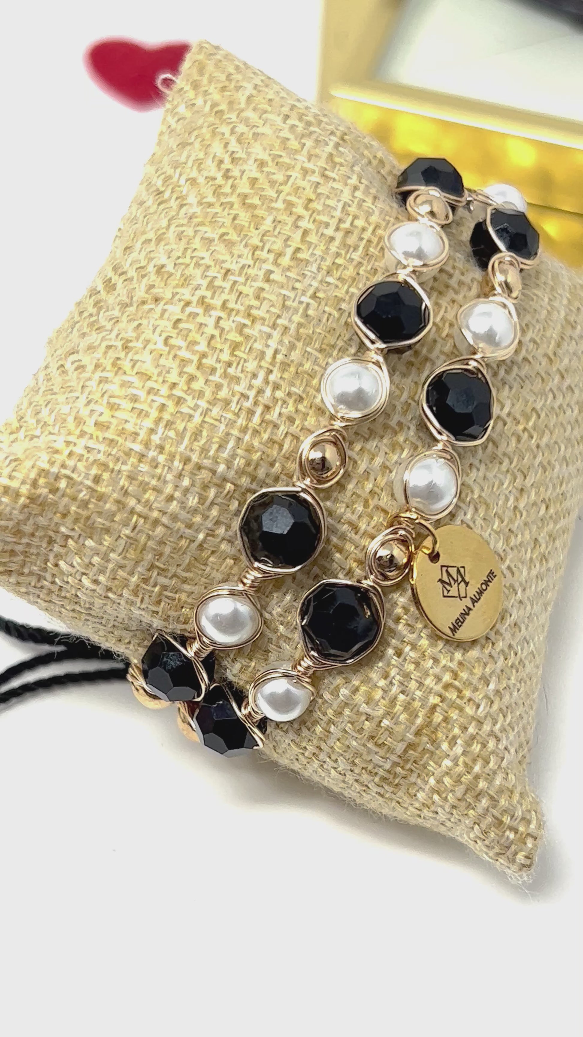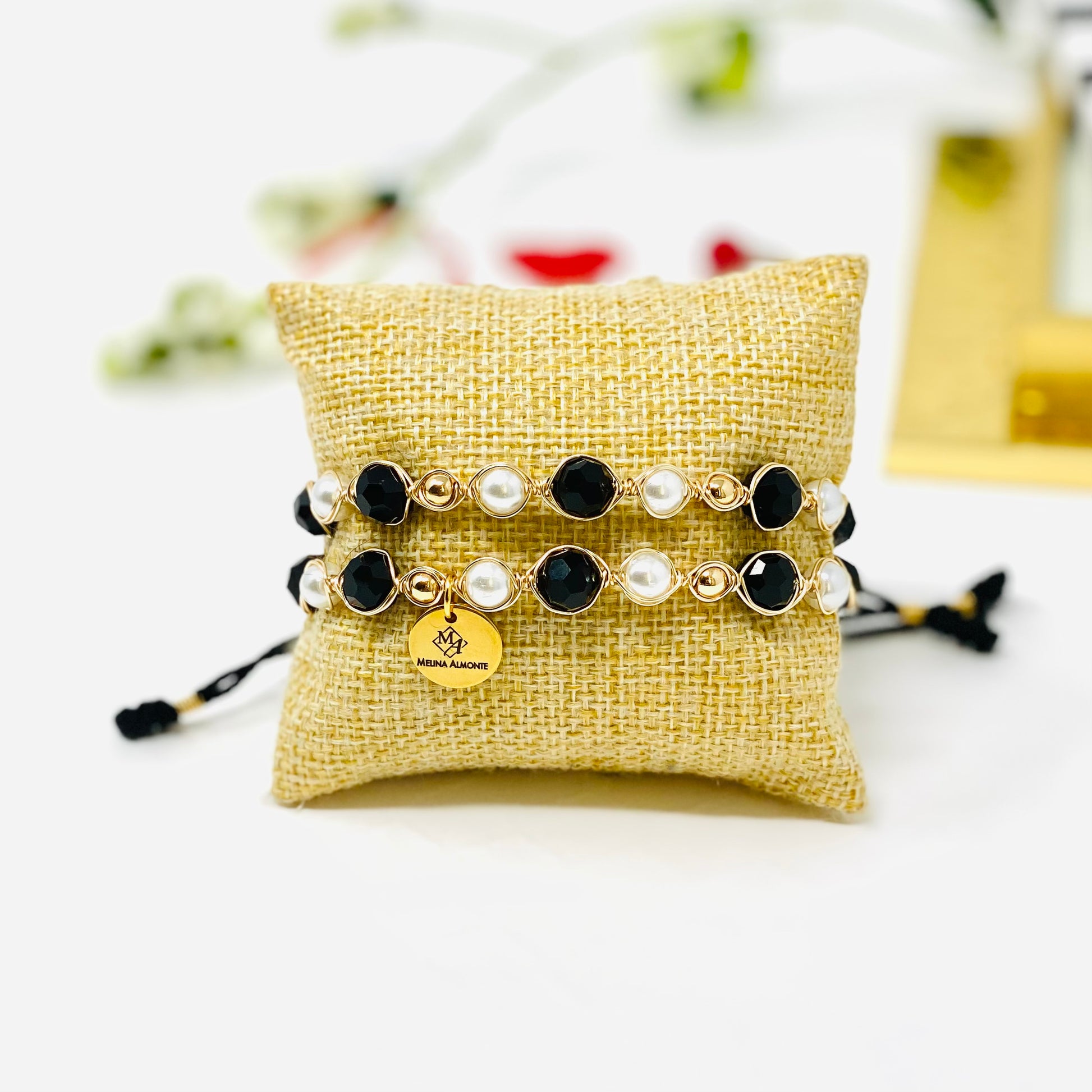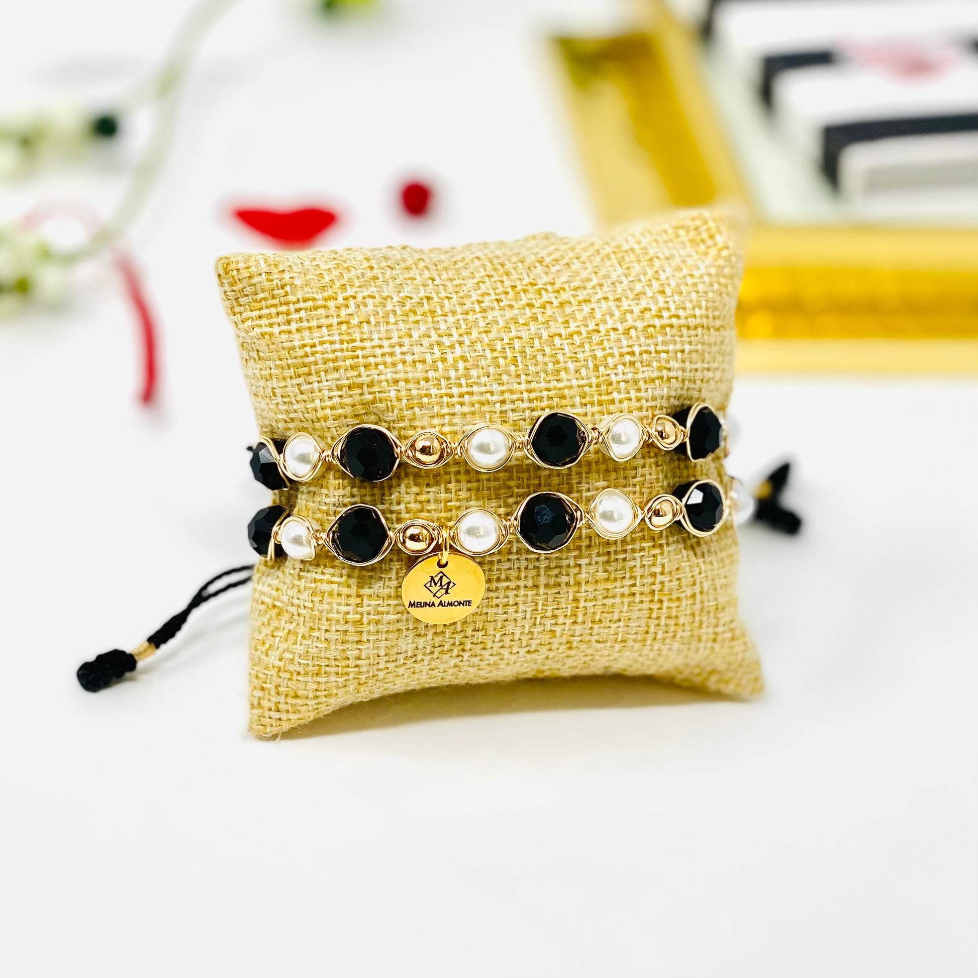 PEARL AND BLACK CRYSTAL BEADED BRACELET SET