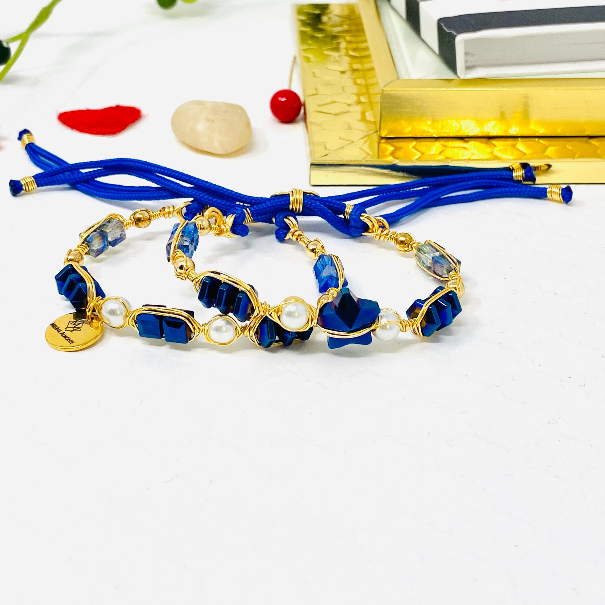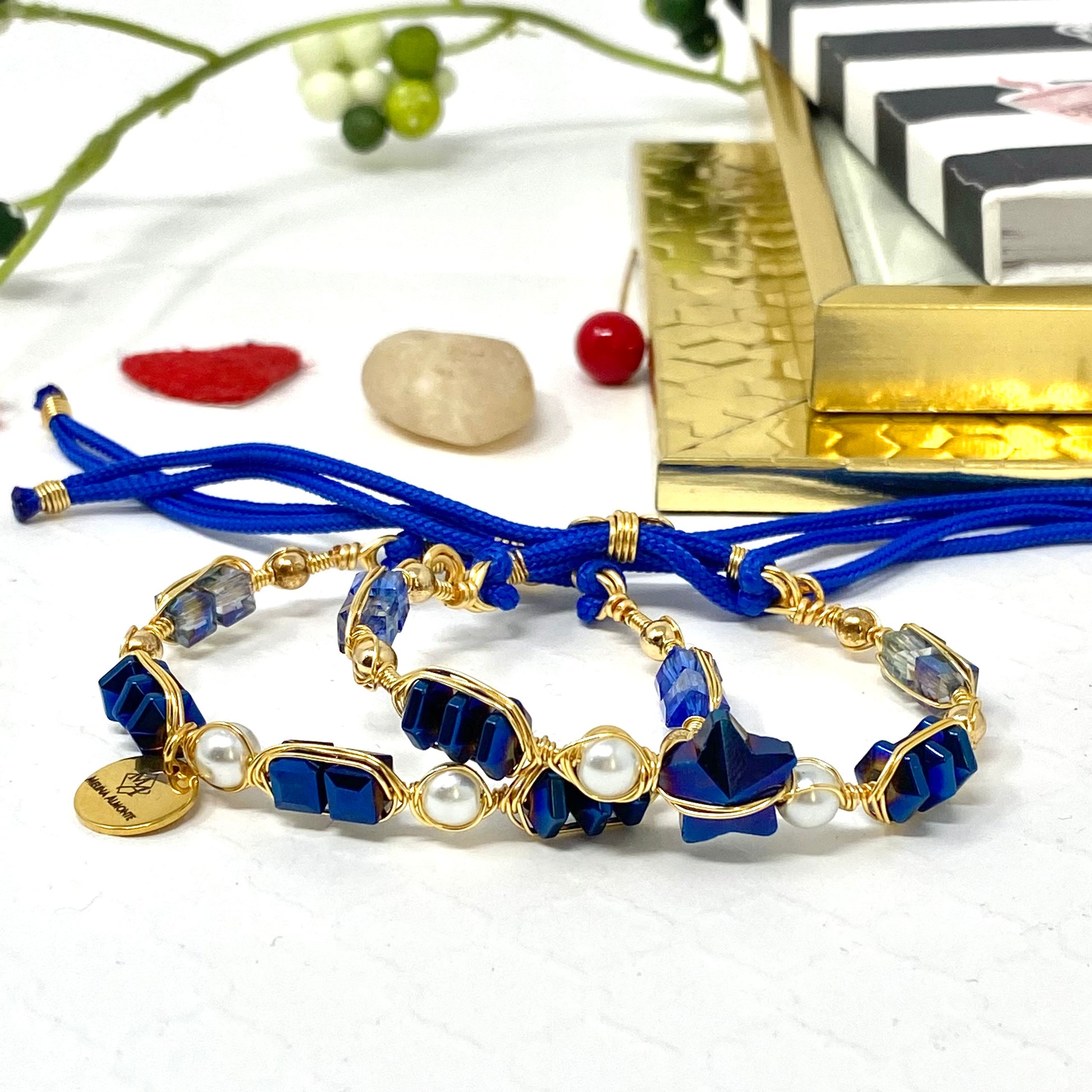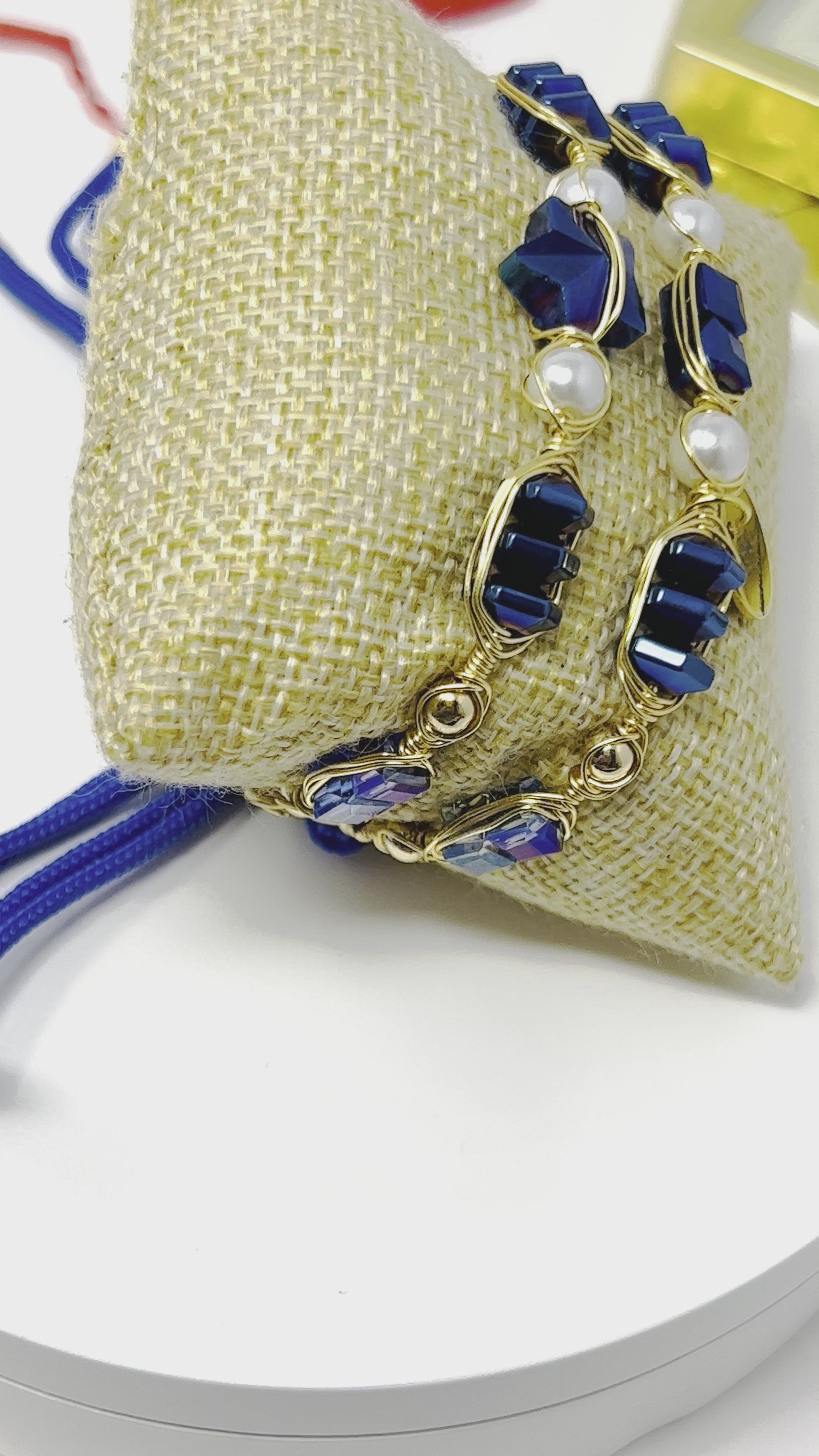 Beautiful handmade wire bracelet set two with hematite beads, pearl, and royal blue crystal beads.