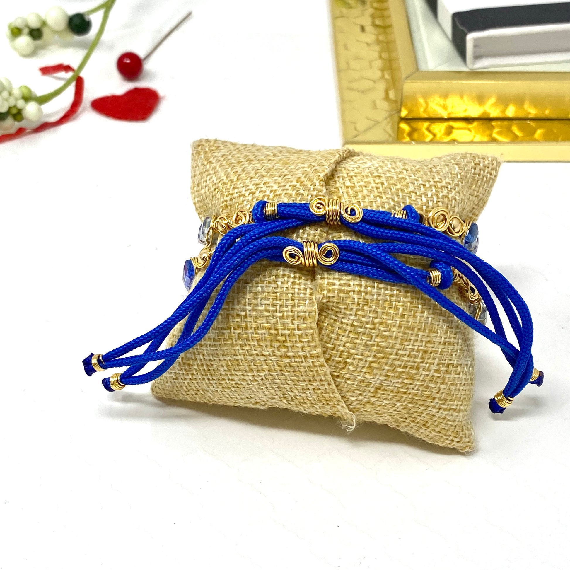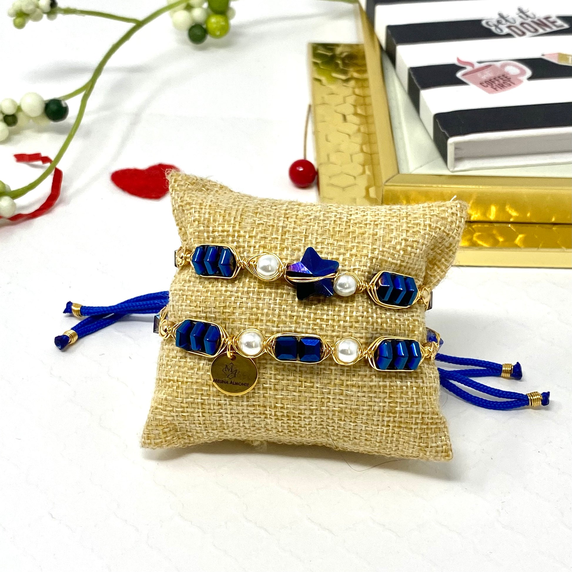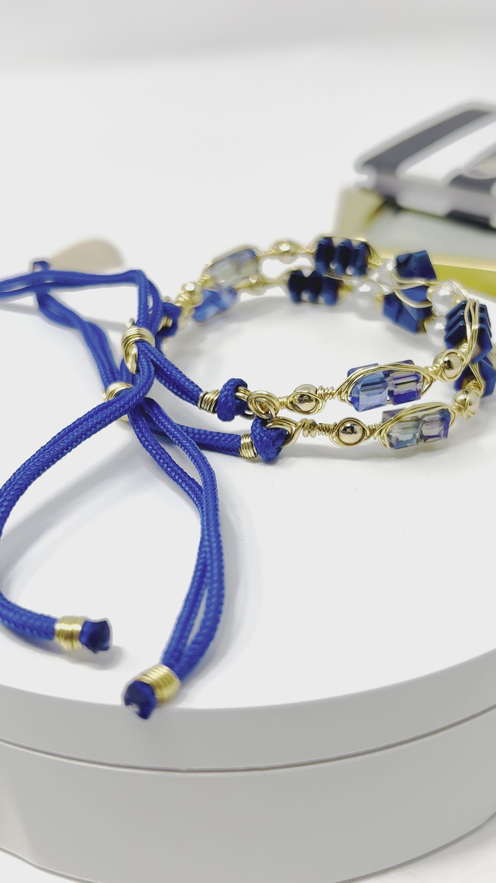 Beautiful handmade wire bracelet set two with hematite beads, pearl, and royal blue crystal beads.